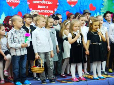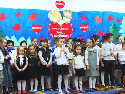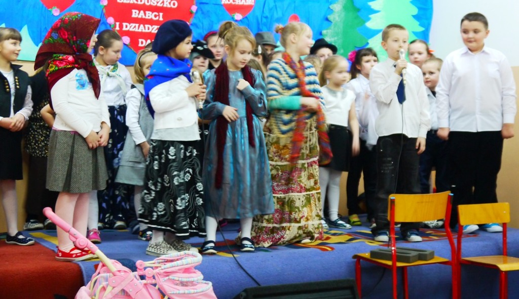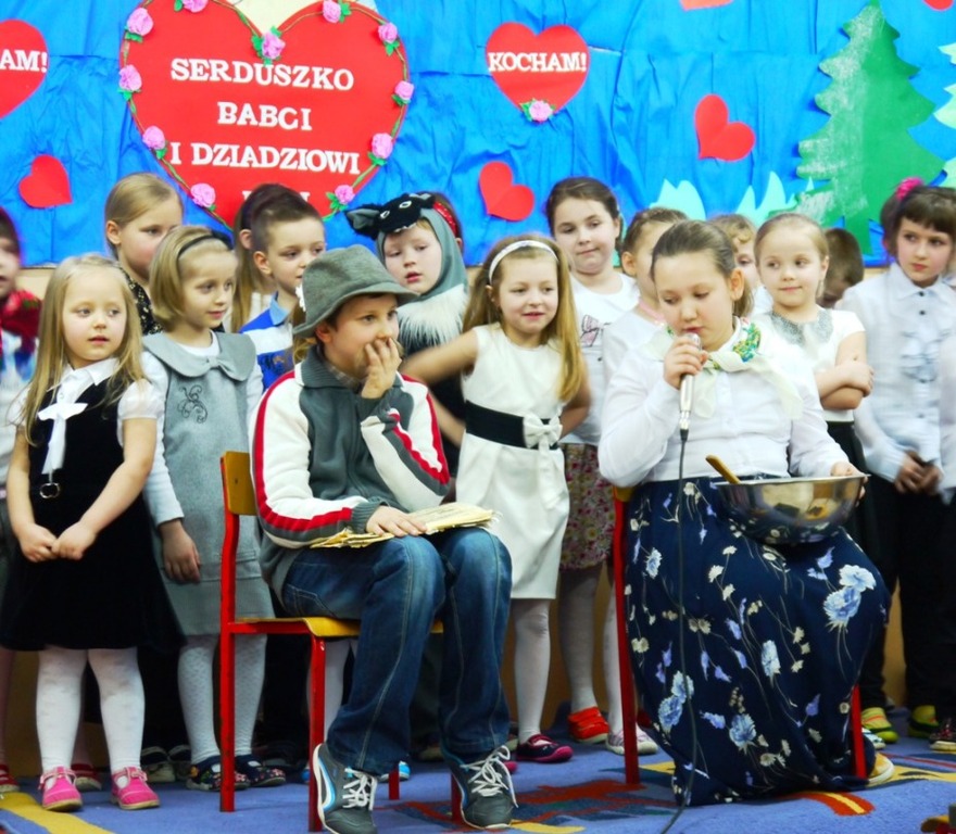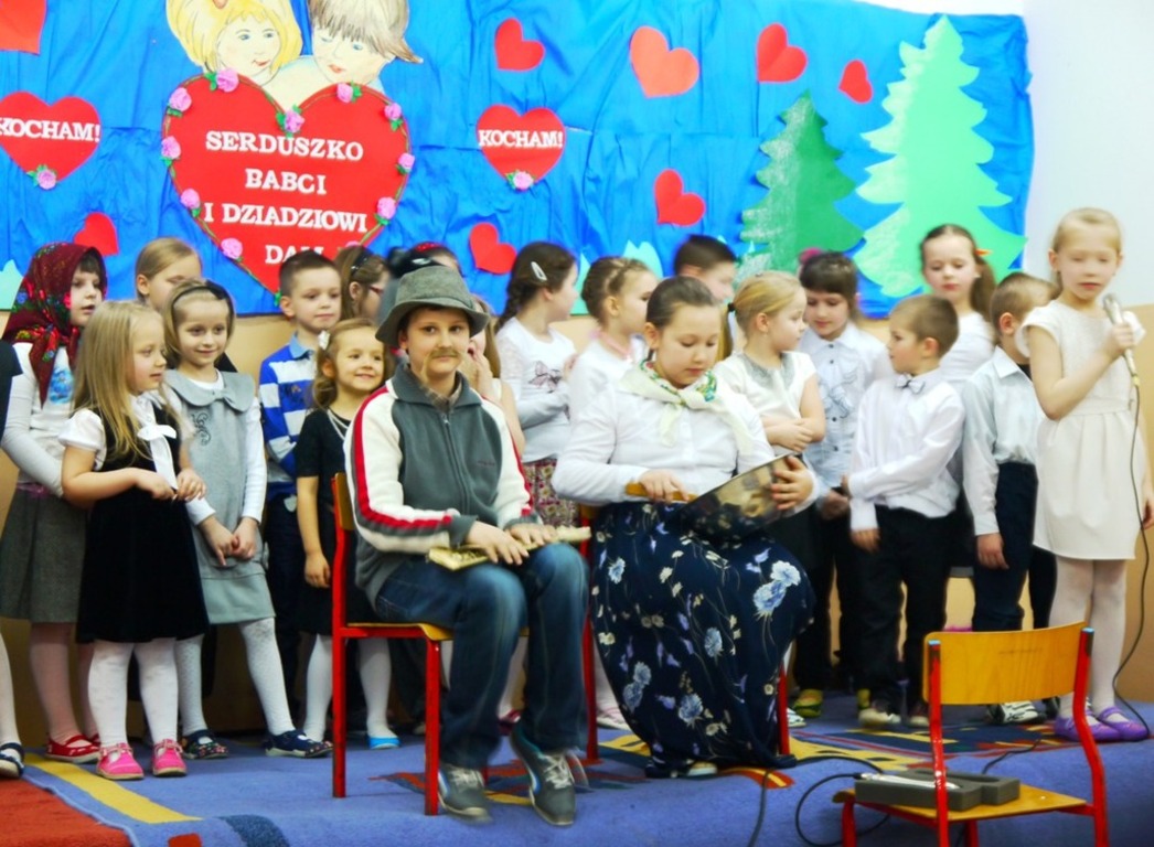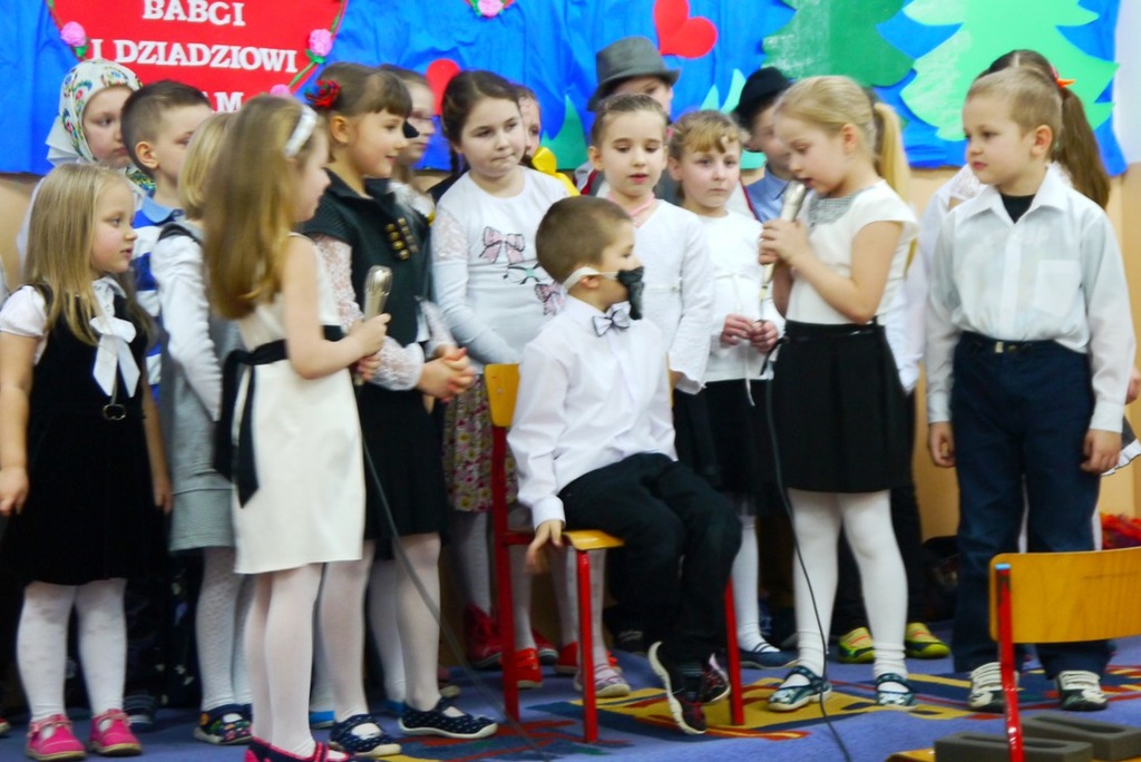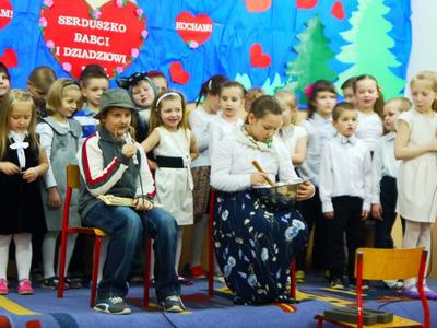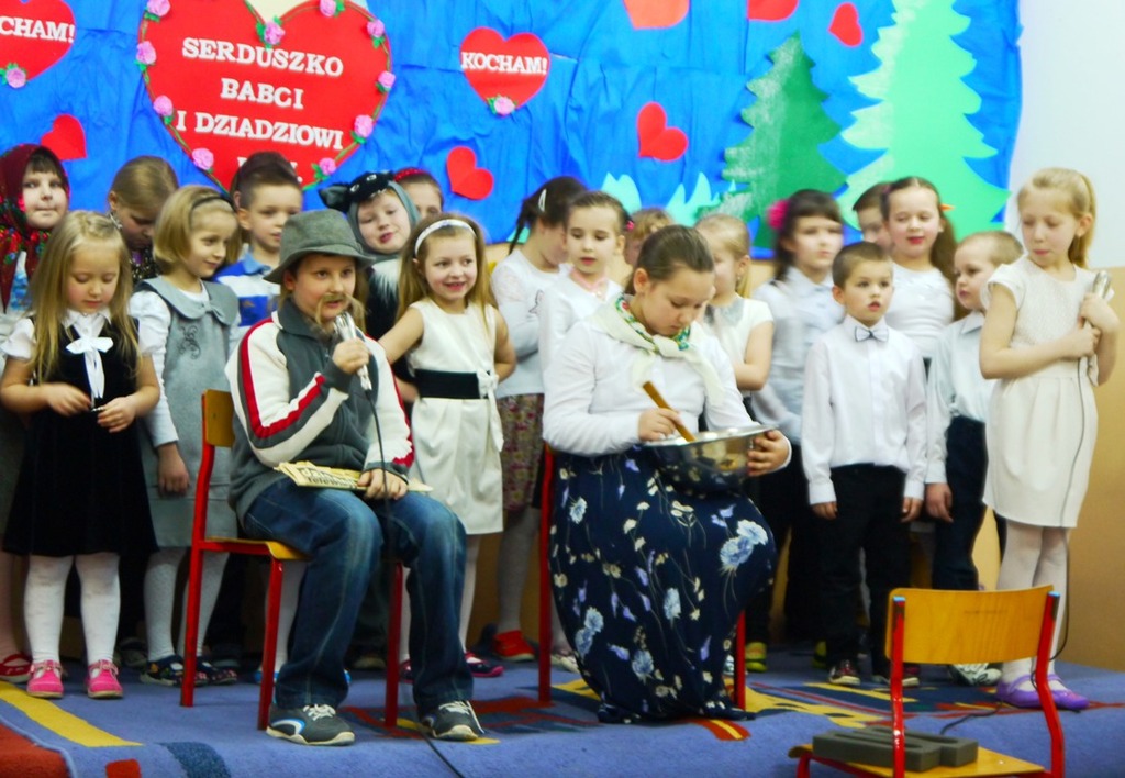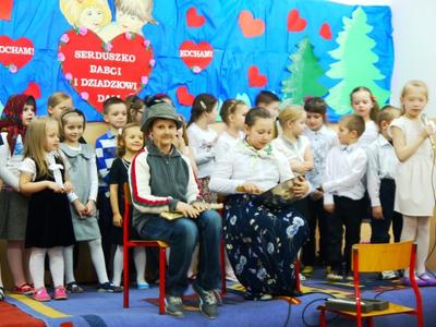 We wtorek o godzinie 12.00 w naszej szkole odbyła się uroczystość z okazji Dnia Babci i Dziadka. Pani B. Winiarczyk oraz p. A. Szabat wraz uczniami z klas I. II, III a także Oddziału Przedszkolnego, przygotowały inscenizację "W Dzień Babci i Dziadka niech muzyka zagra". Maluchy zaprezentowały licznie przybyłym gościom szereg scenek: "Kapcie", "Rozmowa z dziadkiem", "Wilk i zając", "Jak to z dziadkiem i babcią bywało", "Cztery babcie", "Babka z makutrą". Dialogi przeplatane były piosenkami przy akompaniamencie p. A. Wierzchowiaka. Mali artyści z przejęciem odtwarzali swoje role, a goście ze wzruszeniem odbierali czułe słowa kierowne pod ich adresem. Spotkanie upłynęło w miłej atmosferze, a po inscenizacji dzieci wręczyły własnoręcznie wykonane prezenty. Gościom towarzyszyły radość oraz łzy wzruszenia. Następnie wszyscy goście zostali zaproszeni na słodki poczęstunek.