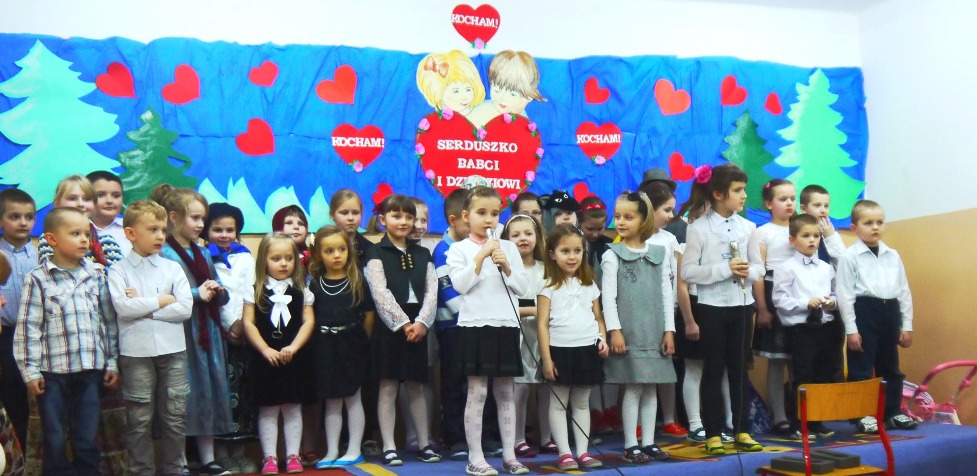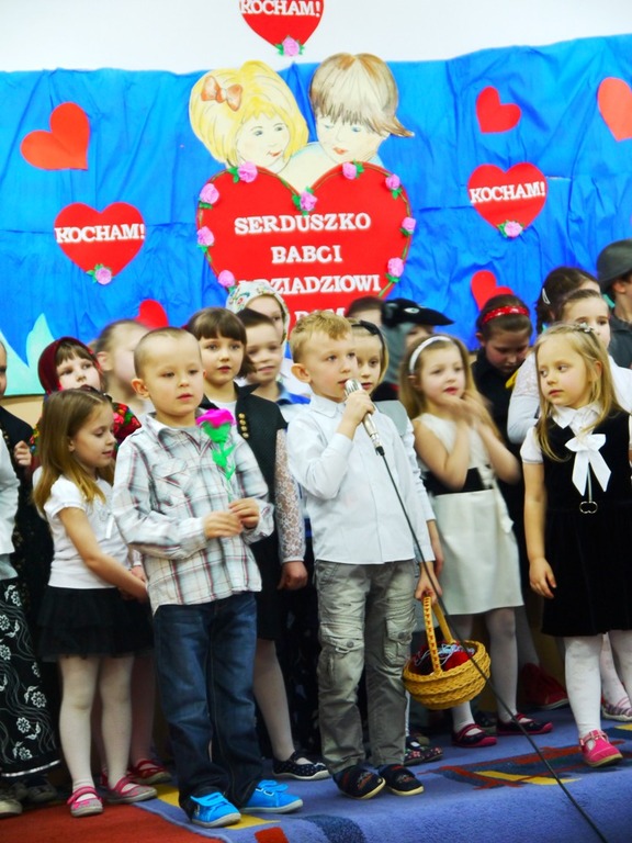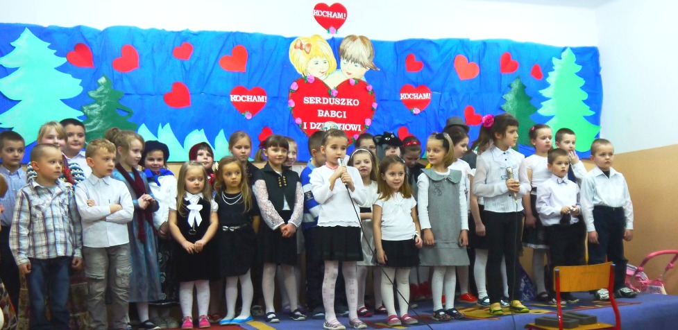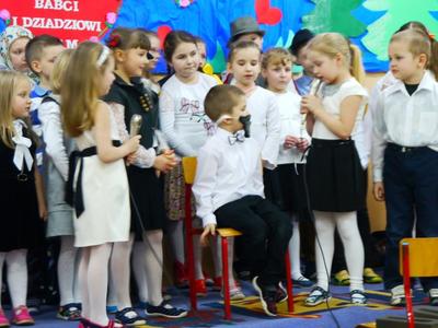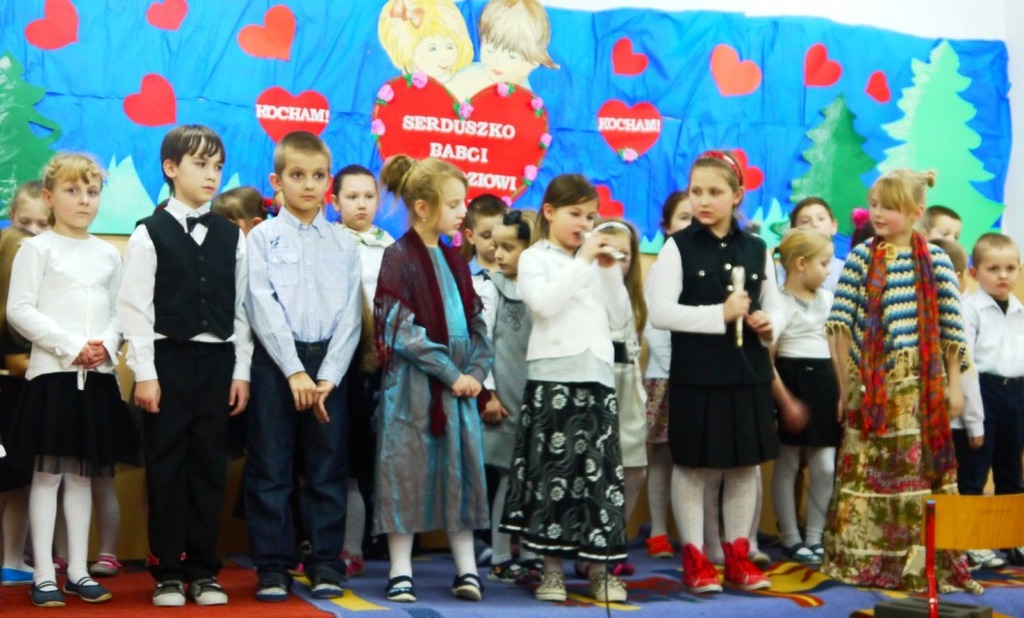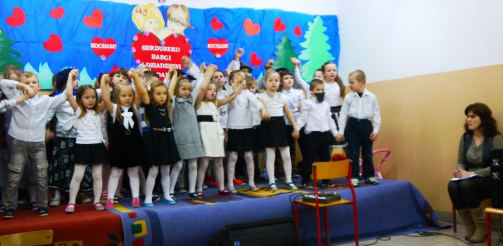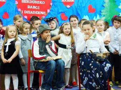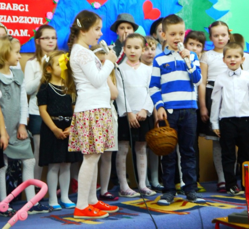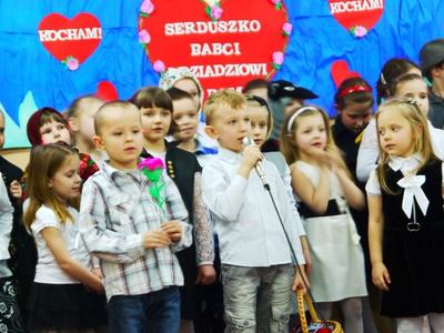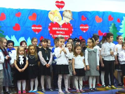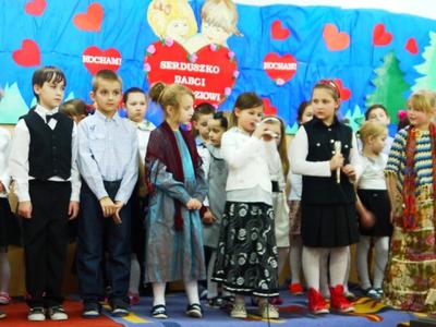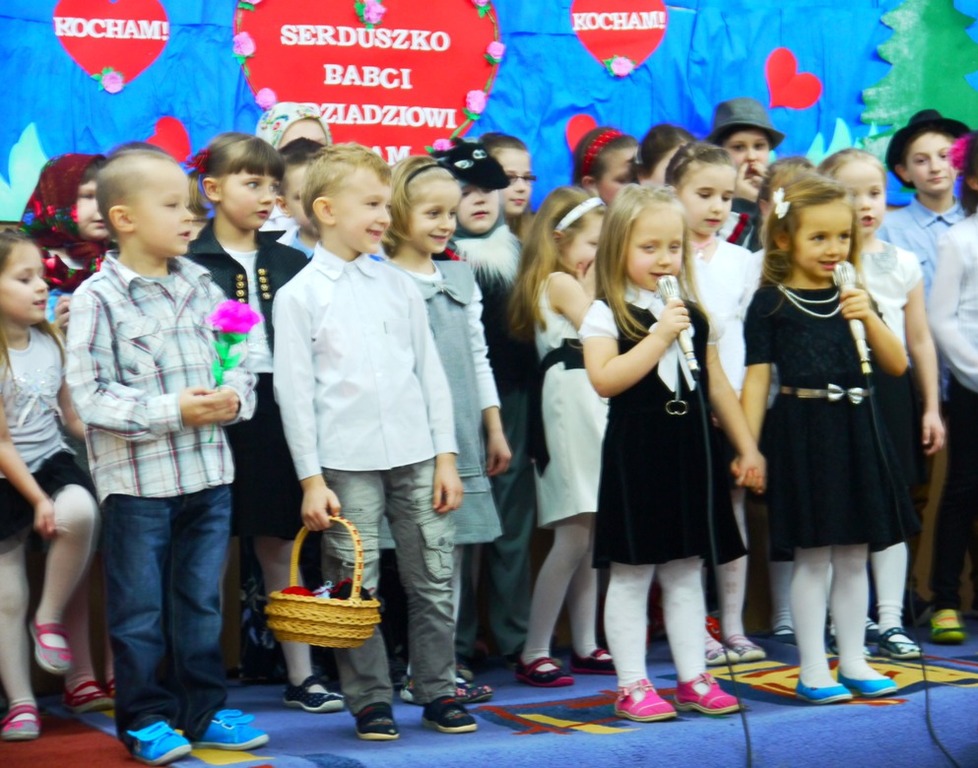 We wtorek o godzinie 12.00 w naszej szkole odbyła się uroczystość z okazji Dnia Babci i Dziadka. Pani B. Winiarczyk oraz p. A. Szabat wraz uczniami z klas I. II, III a także Oddziału Przedszkolnego, przygotowały inscenizację "W Dzień Babci i Dziadka niech muzyka zagra". Maluchy zaprezentowały licznie przybyłym gościom szereg scenek: "Kapcie", "Rozmowa z dziadkiem", "Wilk i zając", "Jak to z dziadkiem i babcią bywało", "Cztery babcie", "Babka z makutrą". Dialogi przeplatane były piosenkami przy akompaniamencie p. A. Wierzchowiaka. Mali artyści z przejęciem odtwarzali swoje role, a goście ze wzruszeniem odbierali czułe słowa kierowne pod ich adresem. Spotkanie upłynęło w miłej atmosferze, a po inscenizacji dzieci wręczyły własnoręcznie wykonane prezenty. Gościom towarzyszyły radość oraz łzy wzruszenia. Następnie wszyscy goście zostali zaproszeni na słodki poczęstunek.