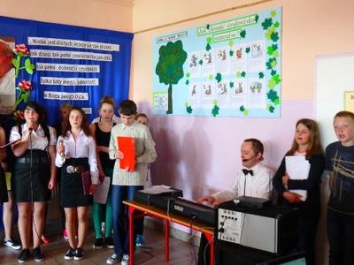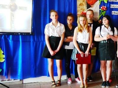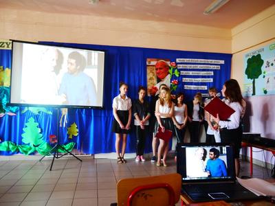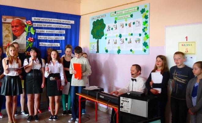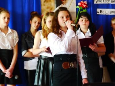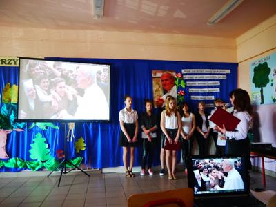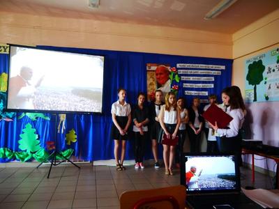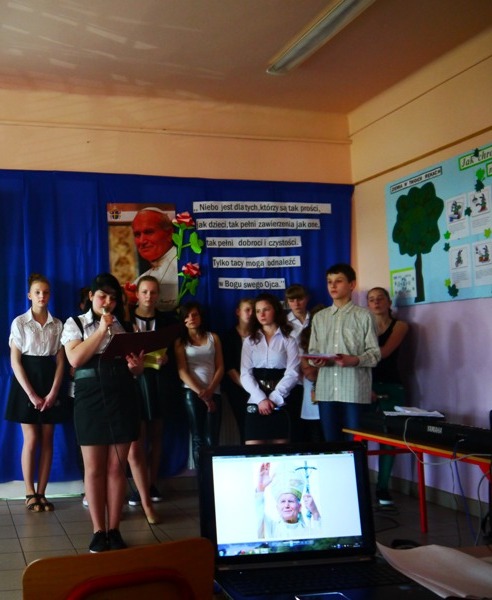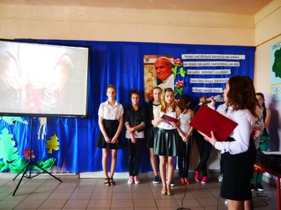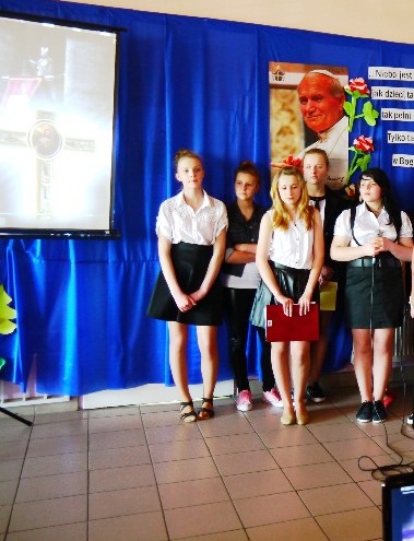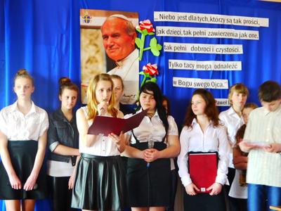 Uroczystość przygotowali uczniowie klas: IV i V oraz III gimnazjum pod opieką pani A. Dziadury i pana A. Wierzchowiaka. Podczas występu mieliśmy możliwość lepszego poznania życia naszego rodaka, które przepełnione było radością, umiłowaniem świata i ludzi, jak również bólem i cierpieniem. Jan Paweł II został kanonizowany 27 kwietnia 2014r. wraz z papieżem Janem XXIII. Śpiewem i recytacją uczniowie uczcili pamięć wielkiego Polaka-Papieża, wychowawcy i przyjaciela młodzieży. Dał świadectwo niezwykłej siły ducha, wiary, miłości Boga i człowieka . był uosobieniem dobra, prawdy i mądrości. Jego obecność na zawsze została zapisana w życiu każdego z nas.