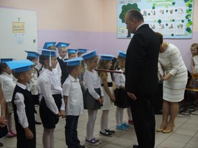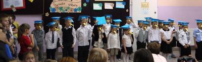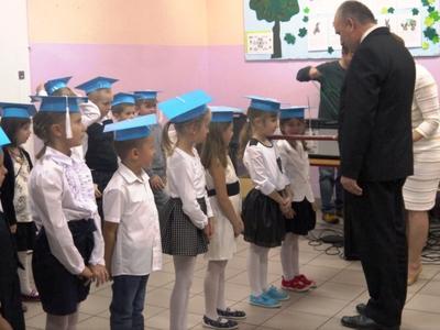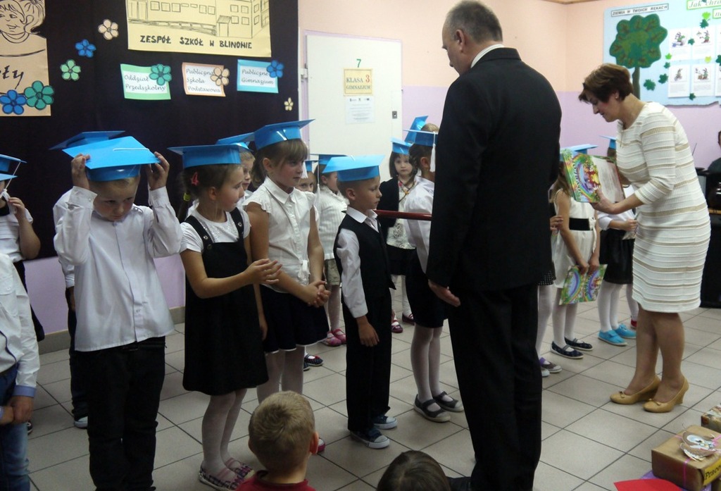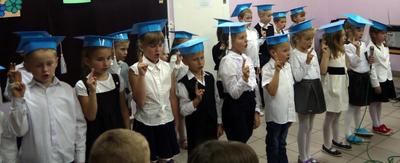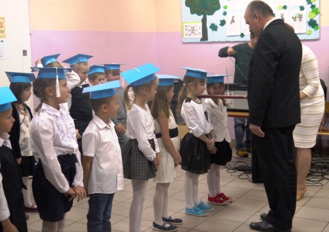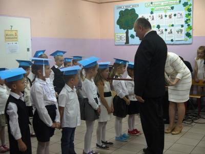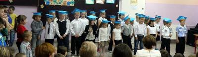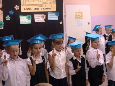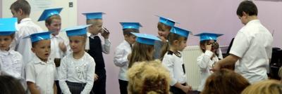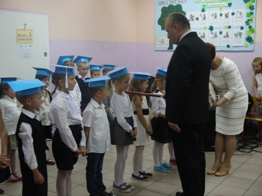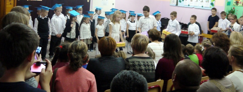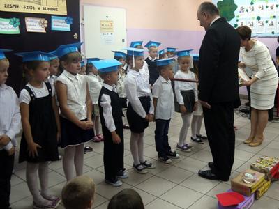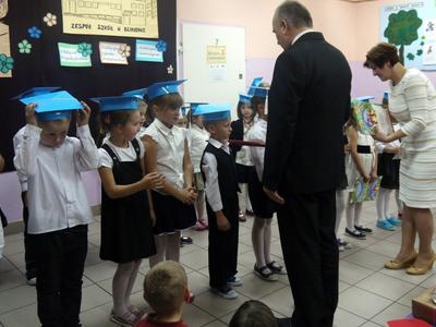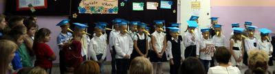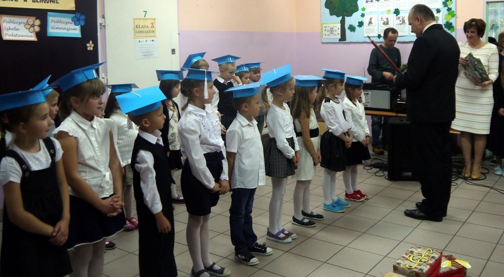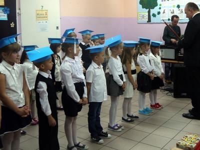 Ten dzień na długo pozostanie w pamięci uczniów, szczególnie pierwszoklasistów, którzy będą dzisiaj przyjmowani do społeczności szkolnej. Na początku uroczystości wychowawczyni klasy I Barbara Winiarczyk serdecznie powitała zgromadzonych gości: uczniów, nauczycieli i rodziców. Następnie uczniowie klasy I rozpoczęli część artystyczną. Starsze koleżanki z kl. IV - jako dobre wróżki ofiarowały pierwszakom dary przyjaźni, uśmiechu, życzliwości, pracowitości i ostrożności. Wszystko zepsuła zła wróżka, której nie zaproszono na uroczystości- zamieniła uczniów w żółtodzioby. Aby zdjąć ten czar uczniowie musieli wykonać rożne zadania. Było śpiewanie piosenek, recytacja wierszy, rozwiązywanie zagadek, zadania z matematyki. Okazało się, że pierwszoklasiści bezbłędnie wykonali zadania- czar prysł- zdali egzamin na szóstkę i mogli przystąpić do ślubowania. Po złożeniu przysięgi nastąpiło pasowanie uczniów. Pan dyrektor dotknął każdego z nich magicznym ołówkiem. Z rąk wychowawczyni pierwszoklasiści otrzymali dyplomy i drobne upominki. Później odbyła się sesja zdjęciowa do kroniki szkoły. Zaś sami uczniowie udali się do klasy na poczęstunek przygotowany przez rodziców.