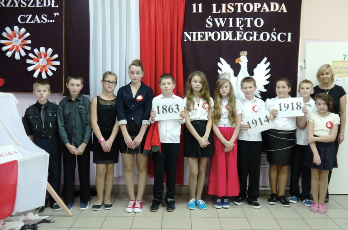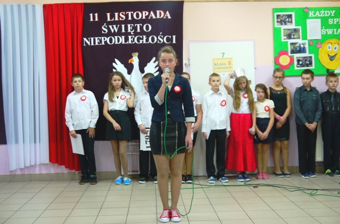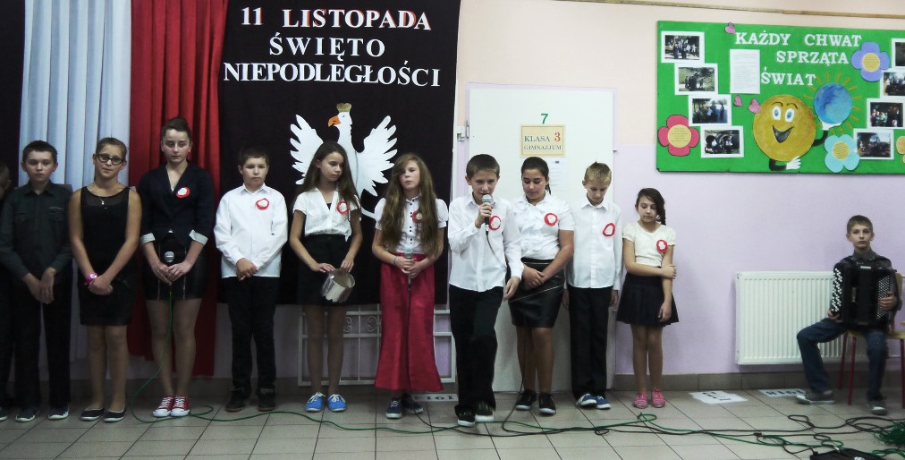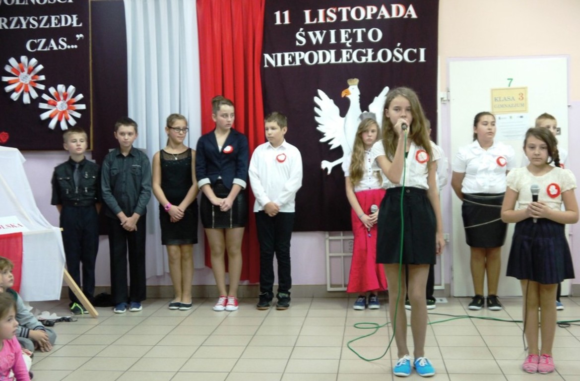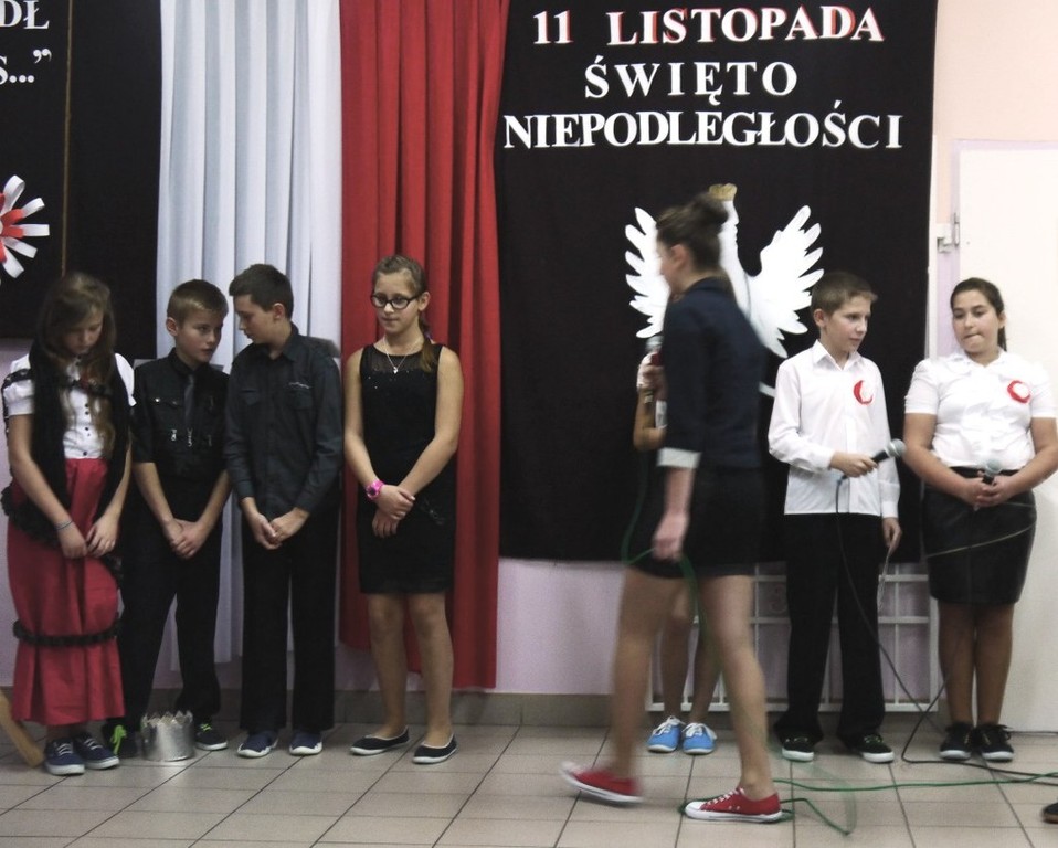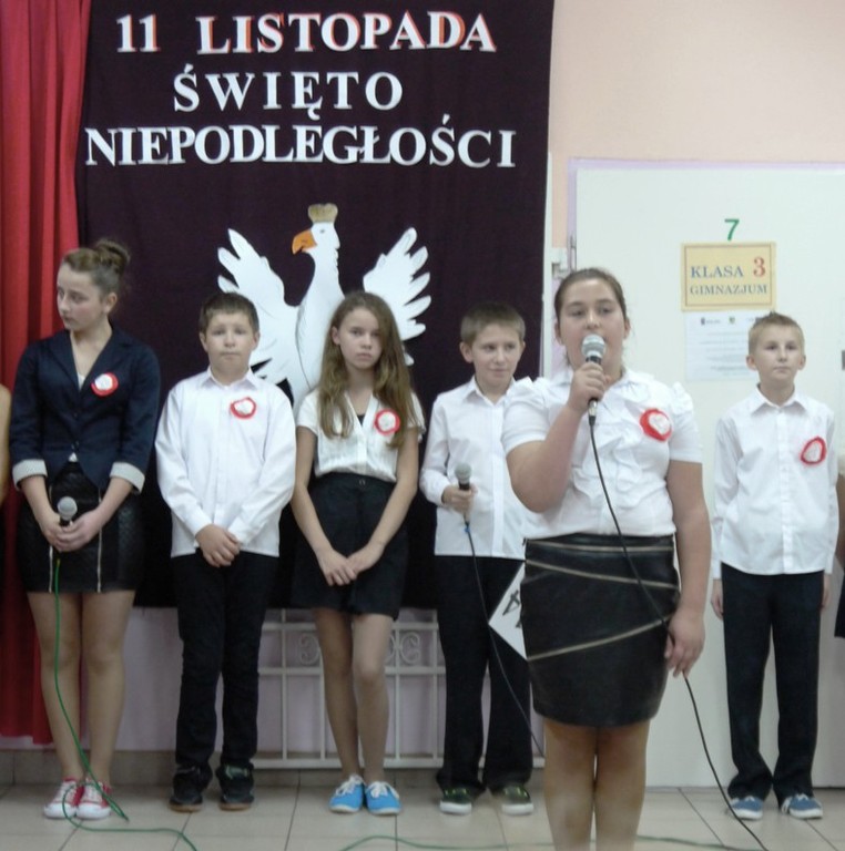 W czwartek odbyła sie uroczysta akademia zwiazana z 96 rocznicą odzyskania przez Polskę niepodległości. Montaż słowno-muzyczny przygotowali uczniowie klasy V pod opieką wychowawczyni p.Joanny Niezgody. Taniec z flagą zaprezentowały uczennice z klasy IV. Występujący ukazali sytuację polityczną kraju, jaka miała miejsce przed odzyskaniem niepodległości. Widzowie mieli okazję posłuchać pieśni patriotycznych w wykonaniu chórku chłopców z klasy II gimnazjum oraz przy akompaniamencie ucznia klasy I gim. Kamila Krawczyka i uczennicy klasy IV Aleksandry Mróz. Scenariusz akademii podkreslił jak ważny był "duch narodu", który w czasie 123 lat niewoli stale wychodził z inicjatywą walki o wolność ojczyzny. Uroczysty apel przypomniał nam, że 11 listopada to symbol miłości do ojczyzny, walki o wolność, symbol wiary i zwycięstwa. Ważne jest abyśmy pielegnowali historię naszego kraju.