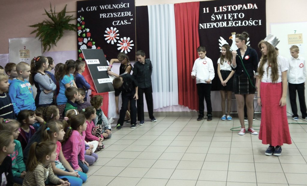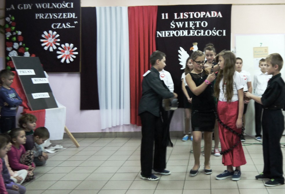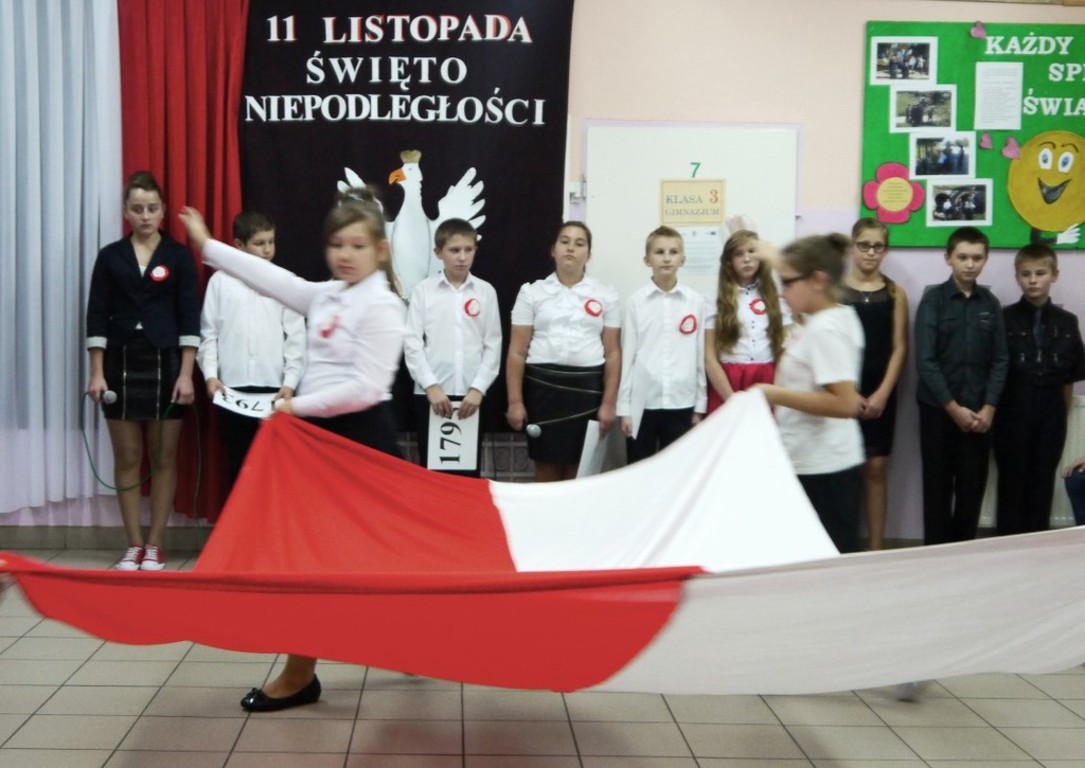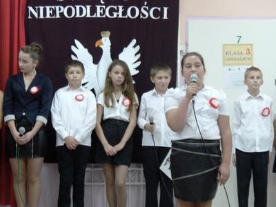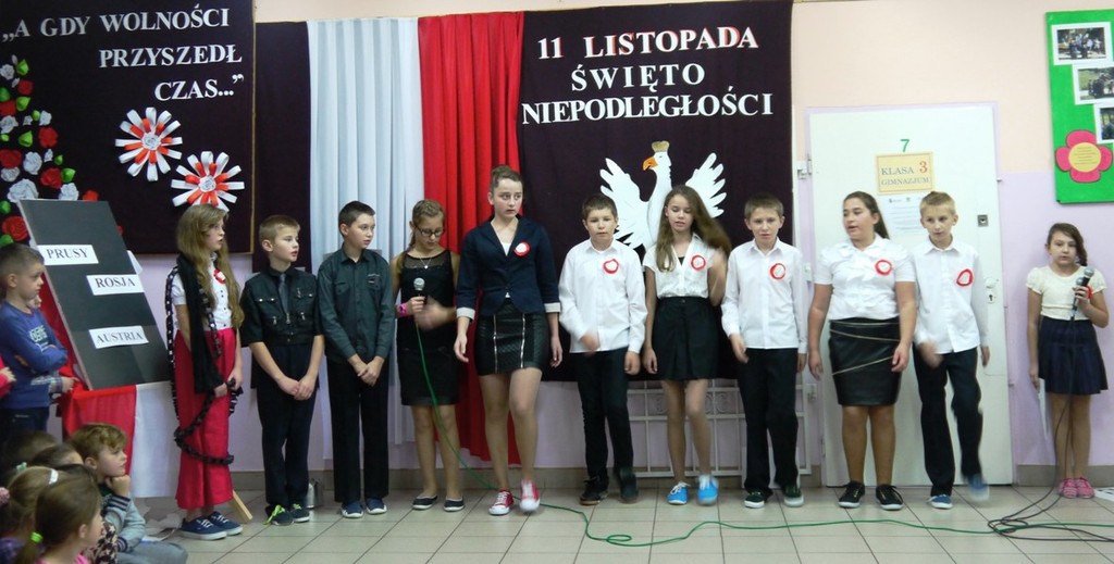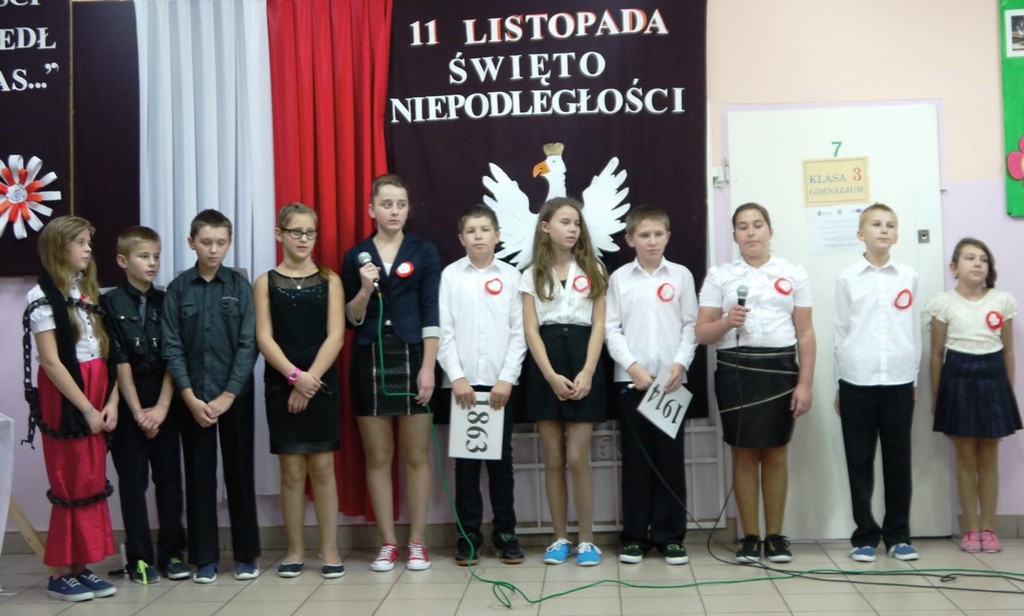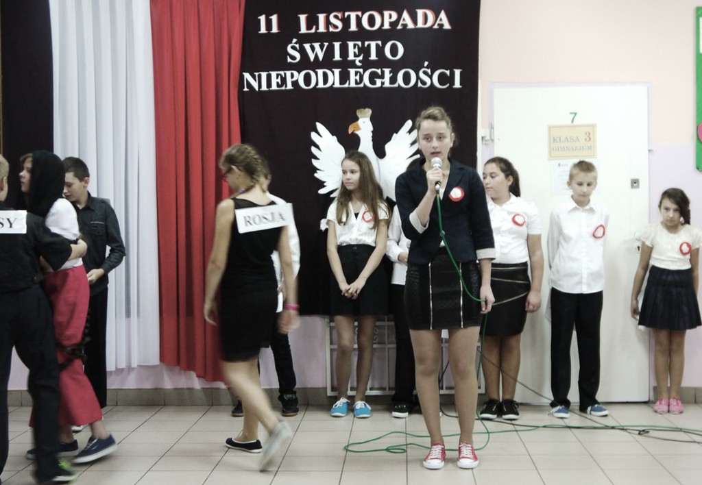 W czwartek odbyła sie uroczysta akademia zwiazana z 96 rocznicą odzyskania przez Polskę niepodległości. Montaż słowno-muzyczny przygotowali uczniowie klasy V pod opieką wychowawczyni p.Joanny Niezgody. Taniec z flagą zaprezentowały uczennice z klasy IV. Występujący ukazali sytuację polityczną kraju, jaka miała miejsce przed odzyskaniem niepodległości. Widzowie mieli okazję posłuchać pieśni patriotycznych w wykonaniu chórku chłopców z klasy II gimnazjum oraz przy akompaniamencie ucznia klasy I gim. Kamila Krawczyka i uczennicy klasy IV Aleksandry Mróz. Scenariusz akademii podkreslił jak ważny był "duch narodu", który w czasie 123 lat niewoli stale wychodził z inicjatywą walki o wolność ojczyzny. Uroczysty apel przypomniał nam, że 11 listopada to symbol miłości do ojczyzny, walki o wolność, symbol wiary i zwycięstwa. Ważne jest abyśmy pielegnowali historię naszego kraju.