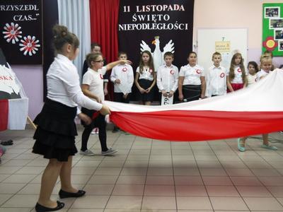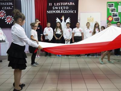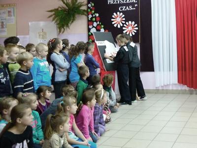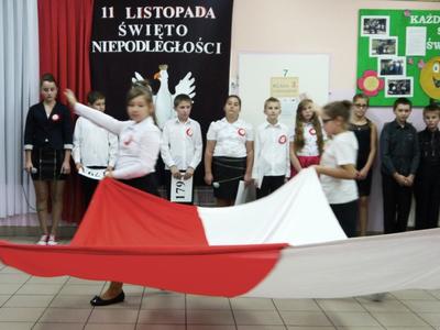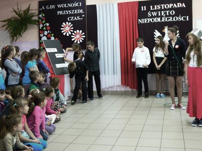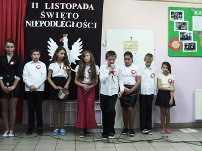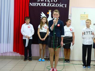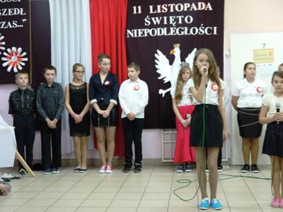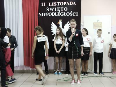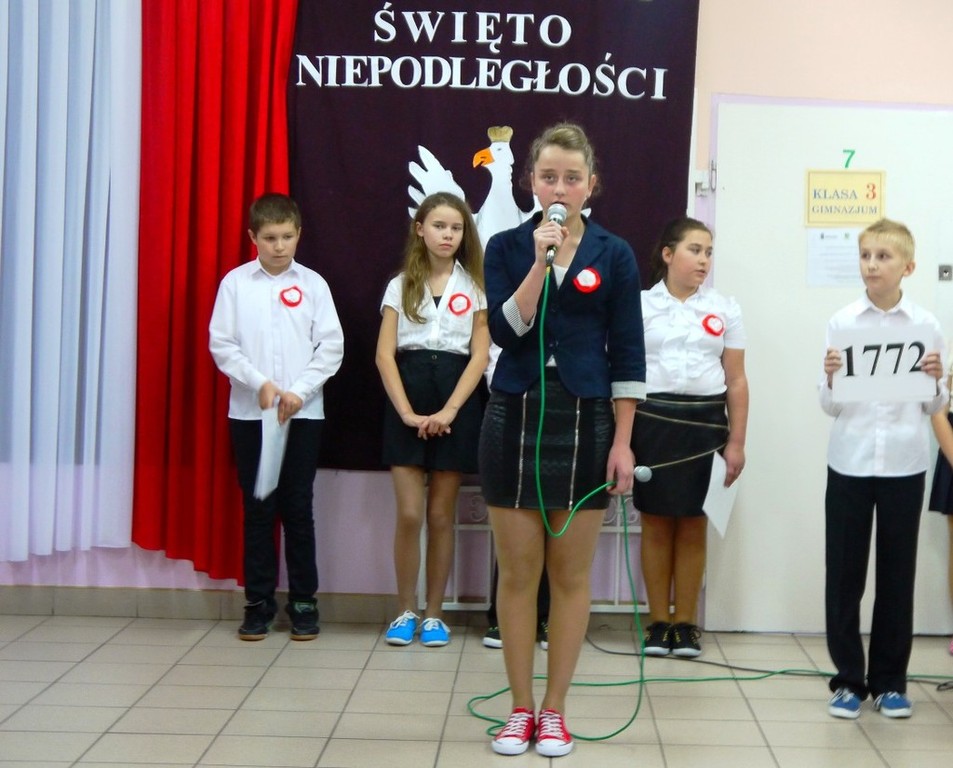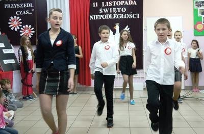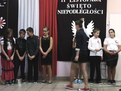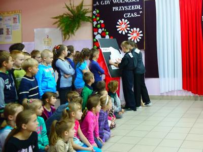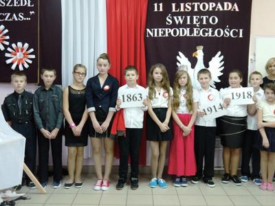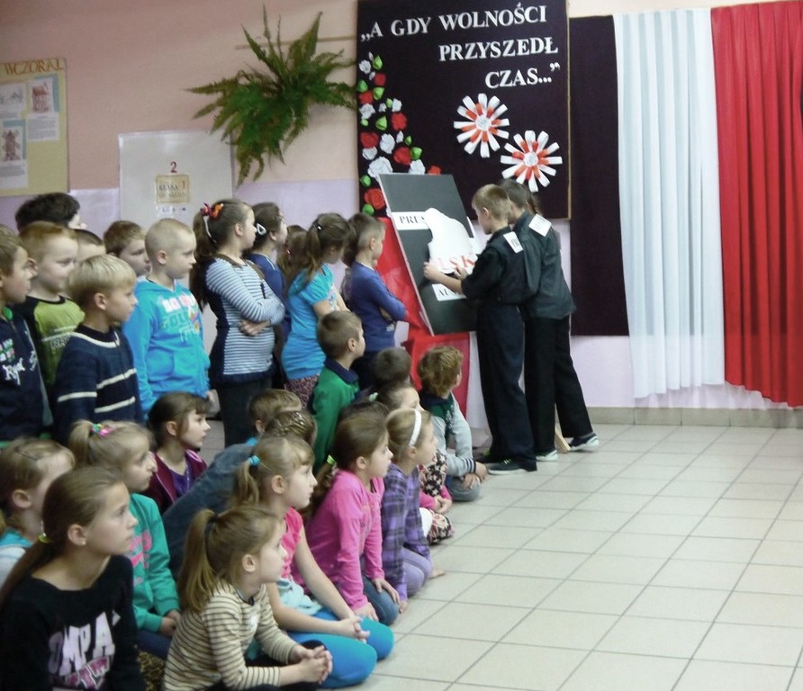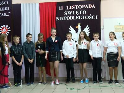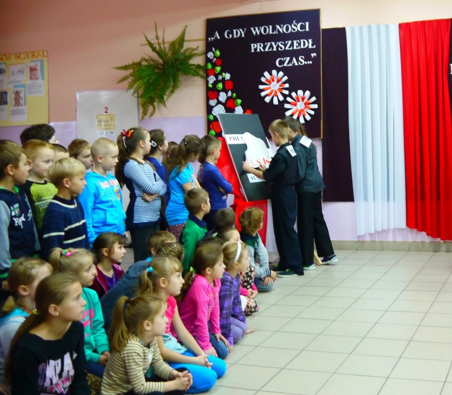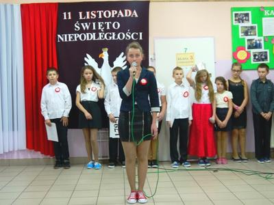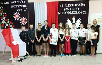 W czwartek odbyła sie uroczysta akademia zwiazana z 96 rocznicą odzyskania przez Polskę niepodległości. Montaż słowno-muzyczny przygotowali uczniowie klasy V pod opieką wychowawczyni p.Joanny Niezgody. Taniec z flagą zaprezentowały uczennice z klasy IV. Występujący ukazali sytuację polityczną kraju, jaka miała miejsce przed odzyskaniem niepodległości. Widzowie mieli okazję posłuchać pieśni patriotycznych w wykonaniu chórku chłopców z klasy II gimnazjum oraz przy akompaniamencie ucznia klasy I gim. Kamila Krawczyka i uczennicy klasy IV Aleksandry Mróz. Scenariusz akademii podkreslił jak ważny był "duch narodu", który w czasie 123 lat niewoli stale wychodził z inicjatywą walki o wolność ojczyzny. Uroczysty apel przypomniał nam, że 11 listopada to symbol miłości do ojczyzny, walki o wolność, symbol wiary i zwycięstwa. Ważne jest abyśmy pielegnowali historię naszego kraju.