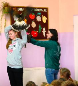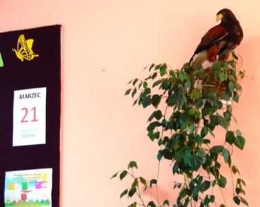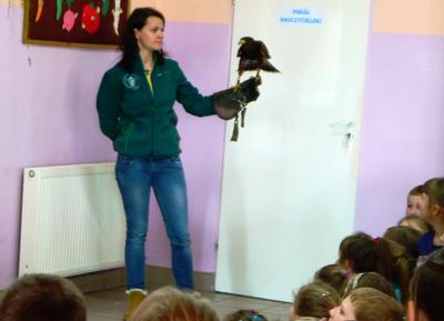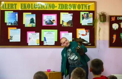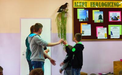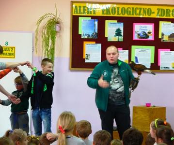 W środę o 11:30 odbyła się wyjątkowa lekcja przyrody. Naszymi gośćmi były żywe ptaki i ich opiekunowie. Wśród podopiecznych pani Anny i pana Grzegorza były: sowy – płomykówka, puchacz, sokół wędrowny i jastrząb. Prowadzący zajęcia w ciekawy sposób opowiadali o budowie ptaków, ich zwyczajach i przystosowaniu do środowiska. Wszyscy mieli okazję zobaczyć jak oswojone ptaki przelatywały nad głowami słuchających. Uczniowie dowiedzieli się co to jest i jakie znaczenie ma szlara, przekonali się z jaką łatwością sowy obracają głowę na boki i do tyłu oraz jak doskonały mają słuch. Podczas spotkania goście zadawali uczniom pytania. Dobre odpowiedzi nagradzane były zdjęciami. Wszystkie pokazane ptaki wzbudzały wielkie zainteresowanie wśród uczniów, zwłaszcza wśród tych najmłodszych z klasy ,,0”, którzy chcieli dotknąć skrzydlatych przyjaciół. Na zakończenie pokazu opiekunowie zaprosili zainteresowanych do odwiedzenia strony http://zielonelekcje.pl i zajrzenia do galerii ptaków. Wszyscy otrzymali na pamiątkę zdjęcia z ptakami. Spotkanie to dostarczyło niesamowitych wrażeń i na długo pozostanie w pamięci uczniów.