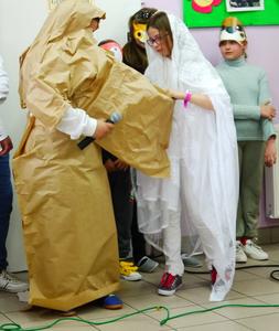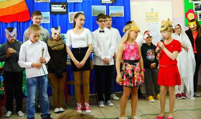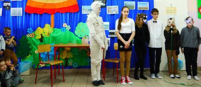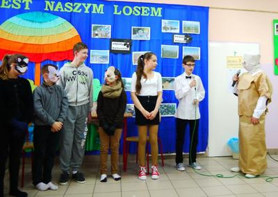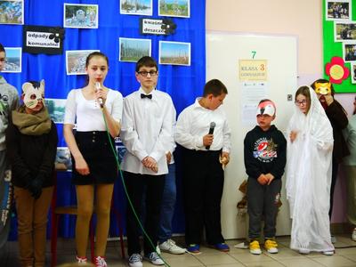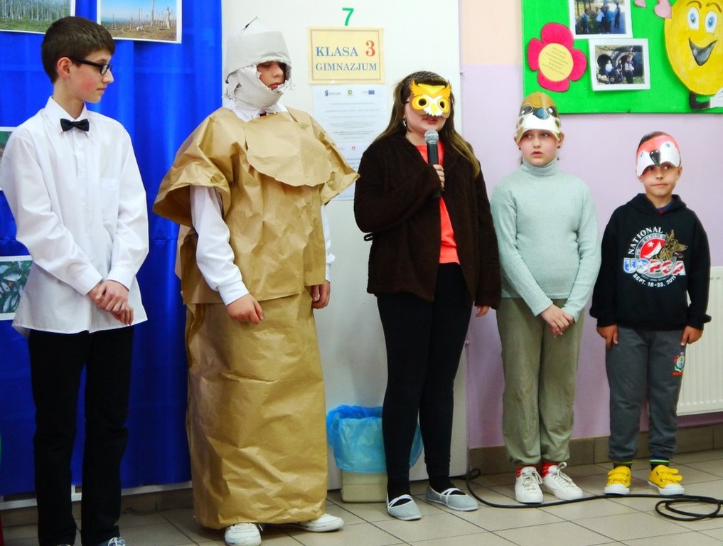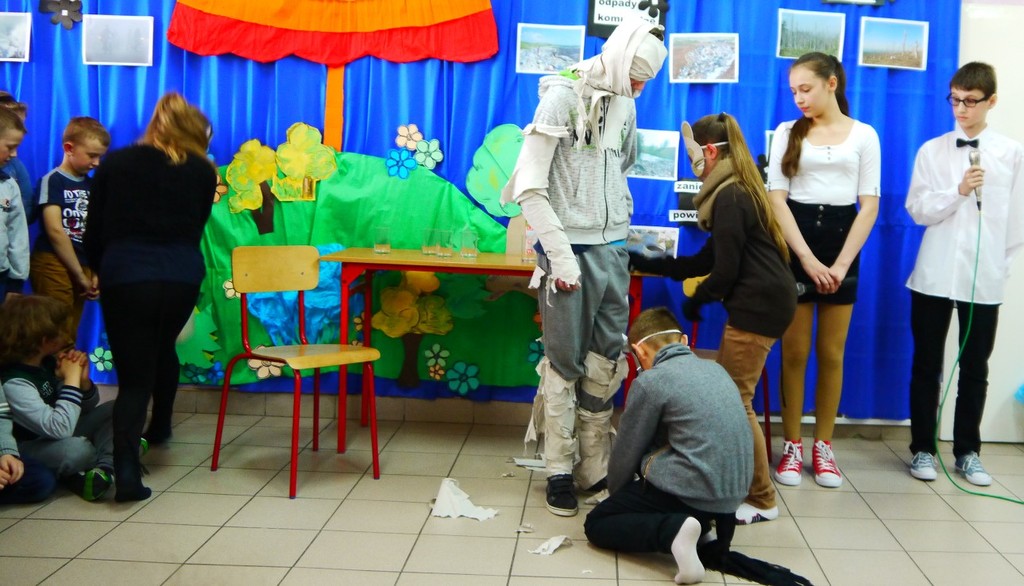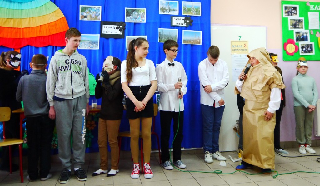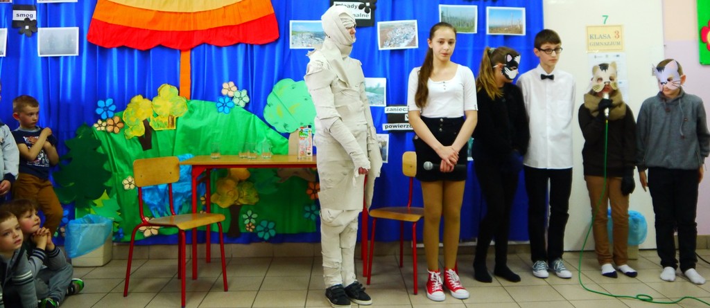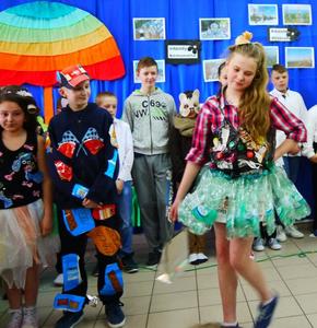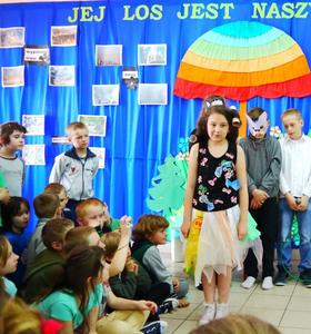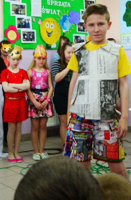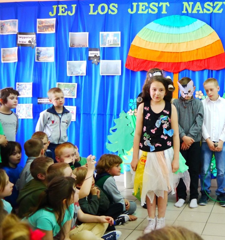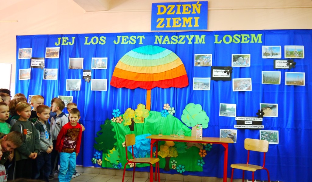 Każdego roku w naszej szkole obchodzimy Światowy Dzień Ziemi, który przypada na 22 kwietnia. W tym czasie zwracamy szczególną uwagę na problemy nekające naszą planetę. Tym bardziej, że w naszej mierze to człowiek jest odpowiedzialny za jej skażenie i zaśmiecanie. Z tej okazji 29 kwietnia odbył się w naszej szkole uroczysty apel. Uczniowie z klas IV, V, VI pod kierunkiem p.Urszuli Reszko i p. Teresy Kotuły przygotowali inscenizację pt. ''Zaklęci w kamień". Wystąpiły w niej: zwierzęta, profesor Pała Lapa oraz kamienne postacie. Owe kamienne postacie to osoby zamienione w kamień za złe zachowanie w stosunku do zwierząt. Strzelanie z procy, wybieranie jaj z ptasich gniazd, hałasowanie w lesie- to tylko niektóre ich przewinienia. Dopiero po objetnicy przez nich poprawy- profesor zdecydował się przywrócić kamieniom dawną, człowieka postać. W podsumowaniu uczniowie stwierdzili, że wszyscy ludzie, zwierzęta i rośliny oddychają tym samym powietrzem, żyją pod jednym niebem i żywią się owocami tej samej Matki-Ziemi. Od człowieka zależy jak nasza planeta będzie wyglądać. Jego celem jest ochrona Ziemi przed zniszczeniem. Inscenizację uświtliła scenka humorystyczna "Rozmowa ryb".Były też piosenki ekologiczne pięknie wykonane przez dziewczęcy chórek. Na zakończenie odbył się pokaz mody ekologicznej. Kolekcja została stworzona z róznorodnych materiałów przeznaczonych do recyklingu m.in. folii, papieru, gazet, opakowań, rolek po papierze toaletowym, tektury, torebek foliowych i papierowych, butelek plastikowych, nakrętek, zużytych płyt CD. Na pokazie mody można było zobaczyć stroje sportowe, wieczorowo-wizytowe i codzienne. Ciekawymi dodatkami były nietypowe nakrycia głowy i biżuteria z surowców wtórnych. Każda kreacja miała swoją nazwę i wyróżniała się oryginalnością. Pokaz jak i inscenizację bardzo spodobały się społeczności szkolnej i zostały nagrodzone gromkimi brawami.