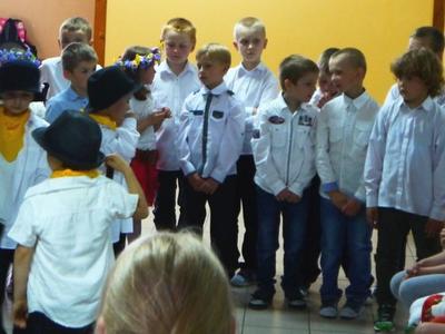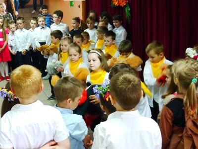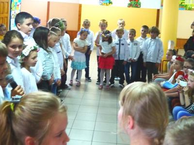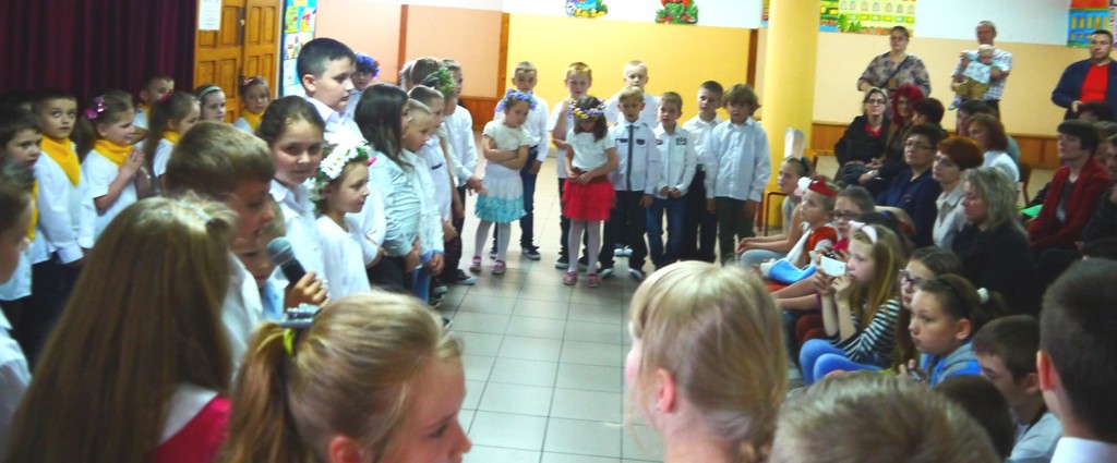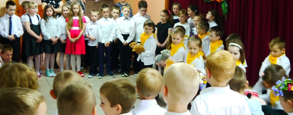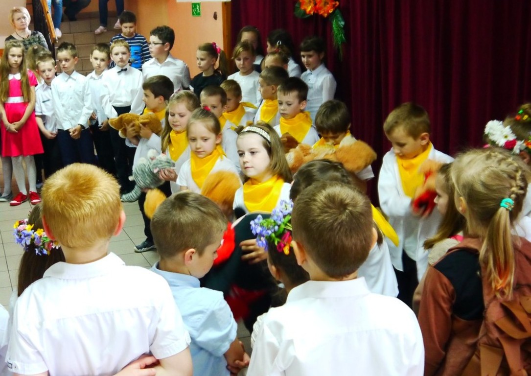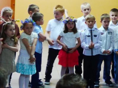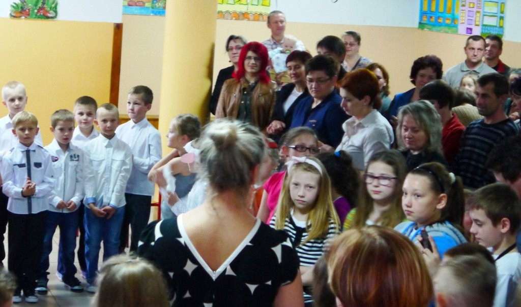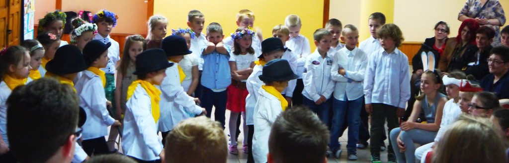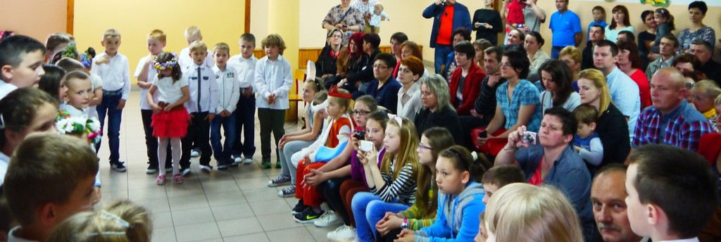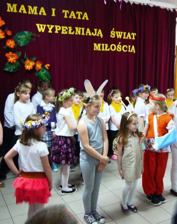 „TATA I MAMA WYPEŁNIAJĄ ŚWIAT MIŁOŚCIĄ” – takie hasło przewodnie przyświecało tegorocznej imprezie, która rozpoczęła się o 12:30. Wszystkim było bardzo miło, gdy hol szkoły zapełnił się zaproszonymi gośćmi. Inscenizację z tej okazji przygotowały: oddział przedszkolny oraz klasy I, II, III wraz z opiekunami p. A Kozik i p. B. Blajerską. Dyrektor szkoły p. A. Białek wygłosił słowo wstępu i złożył wszystkim najserdeczniejsze życzenia. Dzieci długo przygotowywały się do tej uroczystości i dzisiaj z niecierpliwością czekały aby zaprezentować się przed najbliższymi. Występ rozpoczęła klasa I, śpiewając piosenkę „Wiewióreczka mała” wraz z układem choreograficznym. Uczennica kl. II Wiktoria Kosidło wykonała utwór „Kochana mamo dla Ciebie majowe kwiaty”. Później rodzice wysłuchali recytacji wierszy. To nie koniec atrakcji przygotowanych przez dzieci. Najmłodsi zaprezentowali „Taniec z misiem”. Pokazali zgromadzonym jak dbają o swoje zabawki. Niezapomniane wrażenie wywarł układ taneczny przedszkolaków pt. „Kapelusz pełen marzeń” oraz taniec do piosenki Michela Telo „Ai Se Eu Te Pego”. Piękne życzenia, wiersze, słowa piosenek i ciekawe tańce dostarczyły zaproszonym wiele radości i wzruszeń. Po części artystycznej dzieci wręczyły swoim bliskim przygotowane własnoręcznie wykonane laurki i upominki. Uściskom i całusom nie było końca. Na zakończenie rodzice zostali zaproszeni na słodki poczęstunek.
