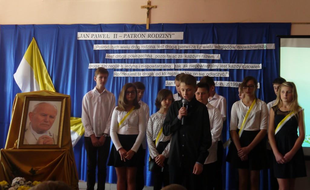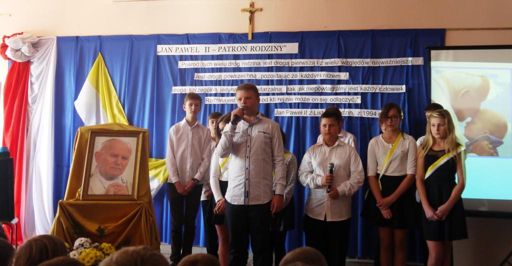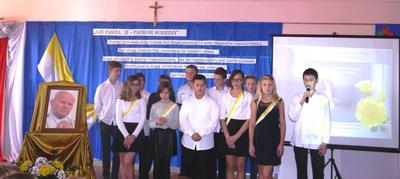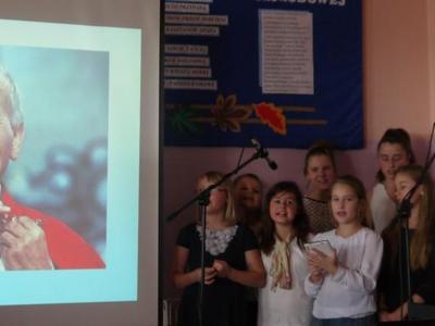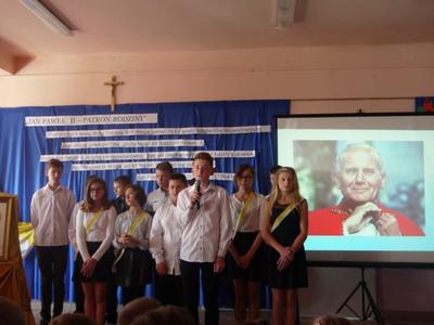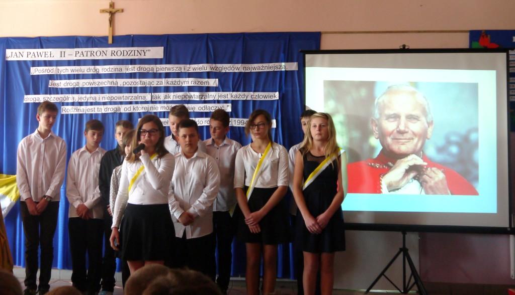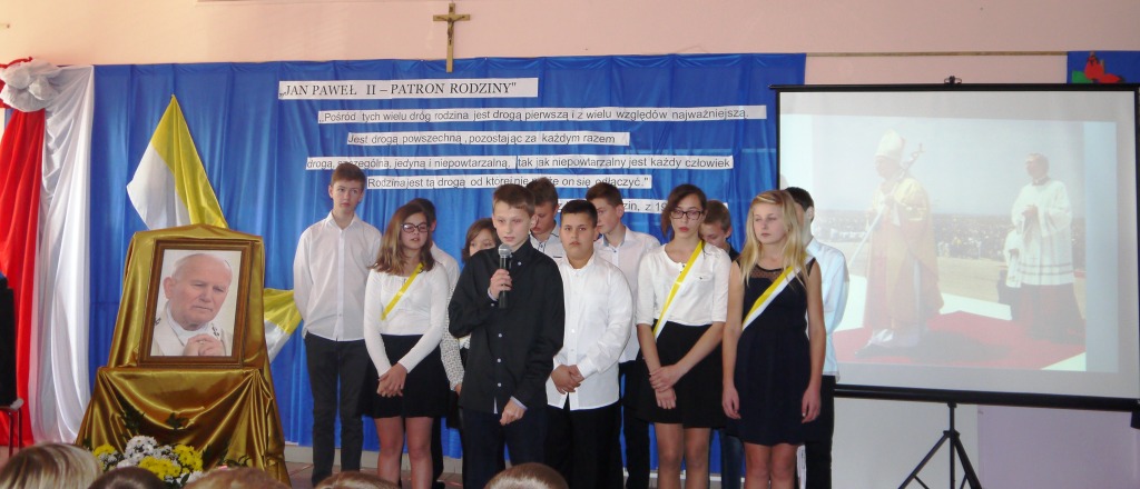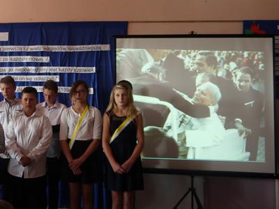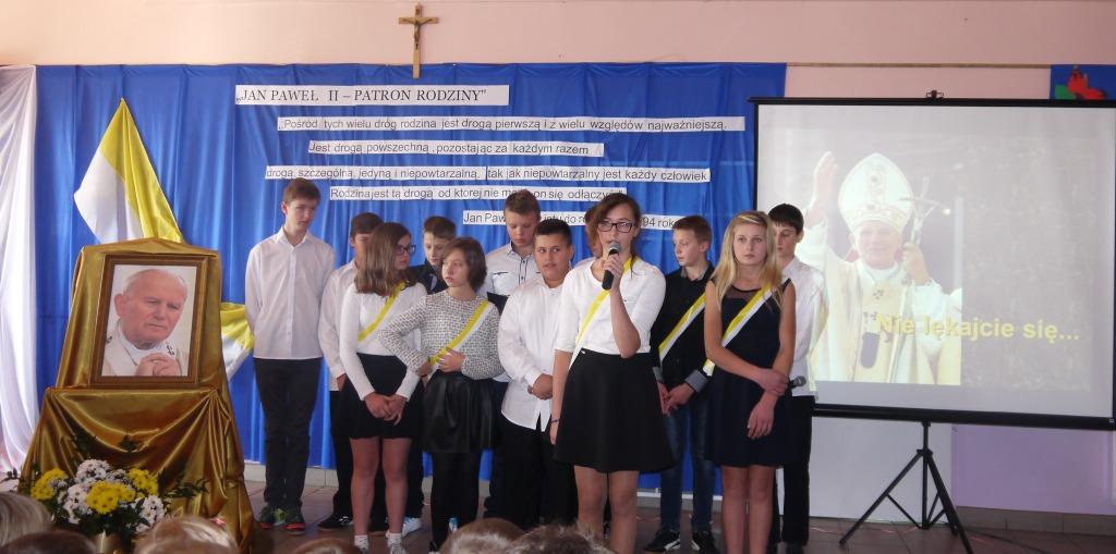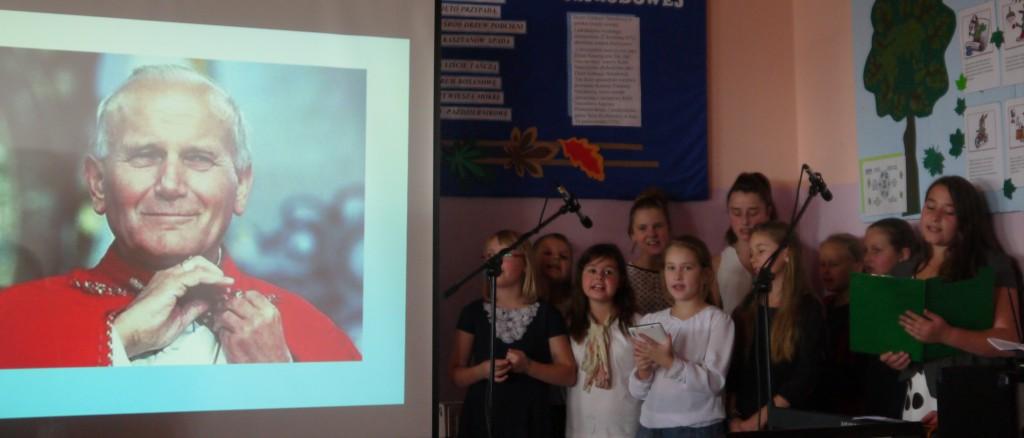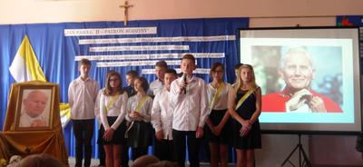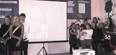 Uczniowie klasy I gimnazjum pod opieką p.A Dziadury, p. R. Wosia oraz chórek składający się z uczennic klasy IV-VI pod "batutą" p. A. Wierzchowiaka przygotowali apel o papieżu Janie Pawle II. Na dużym ekranie wyświetlane były slajdy z czasów młodości Karola Wojtyły, a później święceń, pełnienia posługi jako następcy św. Piotra i ciężkich zmagań z chorobą. Papież Jan Paweł II , dziś zwany wielkim zmienił oblicze tego świata swoją osobą, swoim słowem, podróżami, miłością do każdego człowieka. Uczniowie ukazali go także jako papieża pokoju, wielkiego pielgrzyma, teologa, przyjaciela dzieci a także uosobienie skromności i pokory. Charakterystyczną cechą jego pontyfikatu były liczne podróże do niemal wszystkich krajów świata. W niektórych krajach papież był nawet kilka razy. Dotarł z Orędziem Pokoju i Miłości do najbardziej egzotycznych zakątków świata. Uczniowie przytoczyli zebranym, śmieszne zdarzenia podczas jego podróży po świecie. Niepowtarzalne miejsce w sercu papieża zajmowały dzieci. Często brał je na ręce, przytulał, na czole kreślił krzyż lub całował z największą miłością. Napisał też do dzieci list, w którym prosi o modlitwę, dobre życie i słuchanie słów Pana Jezusa. Jan Paweł II bardzo lubił góry, piesze wędrówki i górali, a szczególnie muzykę góralską. Zawsze z serdecznym słowem zwracał się do mieszkańców naszych gór. Papież lubił wędrówki górskie, jazdę na nartach. Bardzo lubił kremówki, o których często wspominał będąc w swoich rodzinnych Wadowicach. Ojciec Święty był wielką osobowością. Kształtował nasze charaktery, wpływał na losy świata, a jednocześnie wydawał się taki bliski, przyjacielski, żartował, płakał, modlił się i uśmiechał. Uczniowie nie tylko popisali się obszerną wiedzą o papieżu, ale również zdolnościami wokalnymi - poprzez śpiew przywoływali wspomnienie o tej niezwykłej postaci.