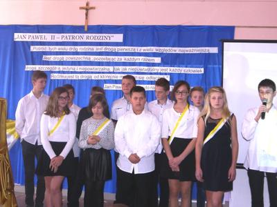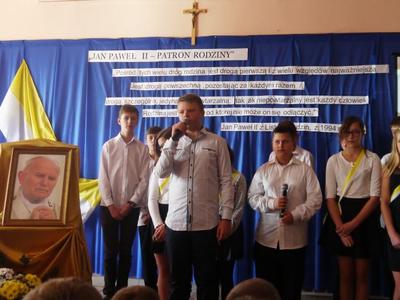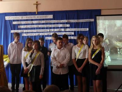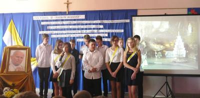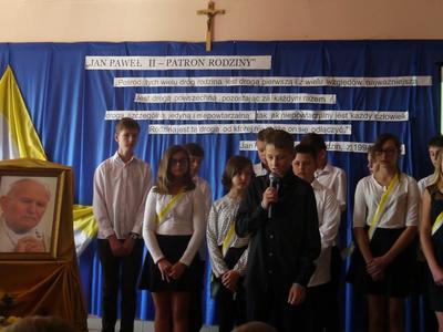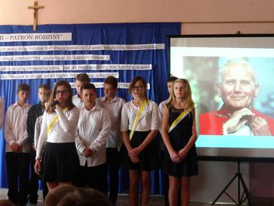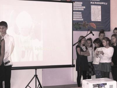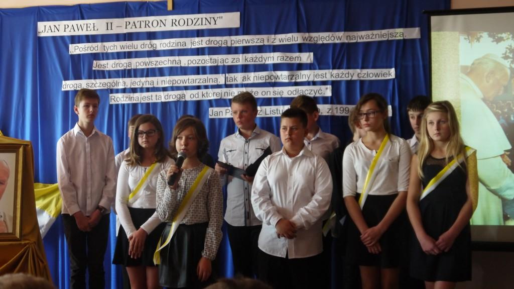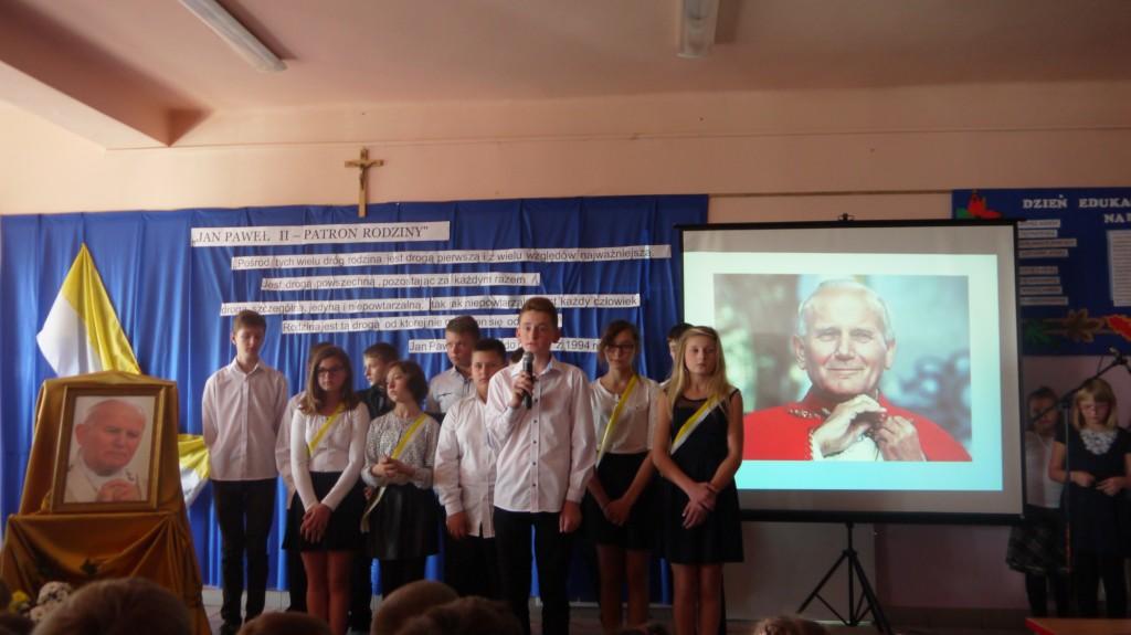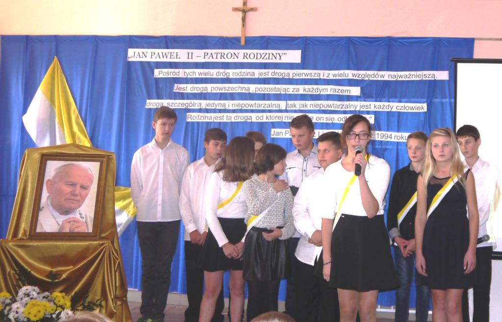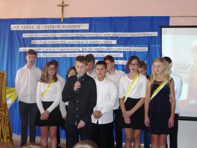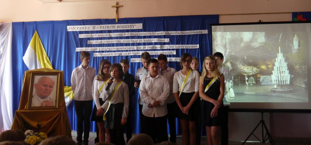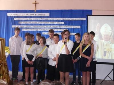 Uczniowie klasy I gimnazjum pod opieką p.A Dziadury, p. R. Wosia oraz chórek składający się z uczennic klasy IV-VI pod "batutą" p. A. Wierzchowiaka przygotowali apel o papieżu Janie Pawle II. Na dużym ekranie wyświetlane były slajdy z czasów młodości Karola Wojtyły, a później święceń, pełnienia posługi jako następcy św. Piotra i ciężkich zmagań z chorobą. Papież Jan Paweł II , dziś zwany wielkim zmienił oblicze tego świata swoją osobą, swoim słowem, podróżami, miłością do każdego człowieka. Uczniowie ukazali go także jako papieża pokoju, wielkiego pielgrzyma, teologa, przyjaciela dzieci a także uosobienie skromności i pokory. Charakterystyczną cechą jego pontyfikatu były liczne podróże do niemal wszystkich krajów świata. W niektórych krajach papież był nawet kilka razy. Dotarł z Orędziem Pokoju i Miłości do najbardziej egzotycznych zakątków świata. Uczniowie przytoczyli zebranym, śmieszne zdarzenia podczas jego podróży po świecie. Niepowtarzalne miejsce w sercu papieża zajmowały dzieci. Często brał je na ręce, przytulał, na czole kreślił krzyż lub całował z największą miłością. Napisał też do dzieci list, w którym prosi o modlitwę, dobre życie i słuchanie słów Pana Jezusa. Jan Paweł II bardzo lubił góry, piesze wędrówki i górali, a szczególnie muzykę góralską. Zawsze z serdecznym słowem zwracał się do mieszkańców naszych gór. Papież lubił wędrówki górskie, jazdę na nartach. Bardzo lubił kremówki, o których często wspominał będąc w swoich rodzinnych Wadowicach. Ojciec Święty był wielką osobowością. Kształtował nasze charaktery, wpływał na losy świata, a jednocześnie wydawał się taki bliski, przyjacielski, żartował, płakał, modlił się i uśmiechał. Uczniowie nie tylko popisali się obszerną wiedzą o papieżu, ale również zdolnościami wokalnymi - poprzez śpiew przywoływali wspomnienie o tej niezwykłej postaci.