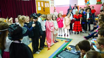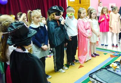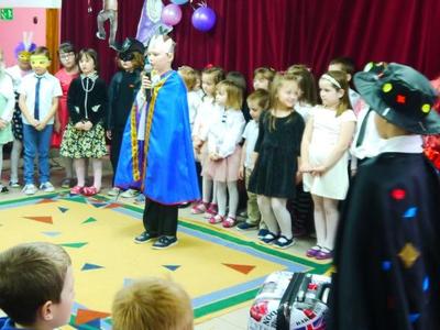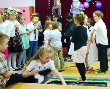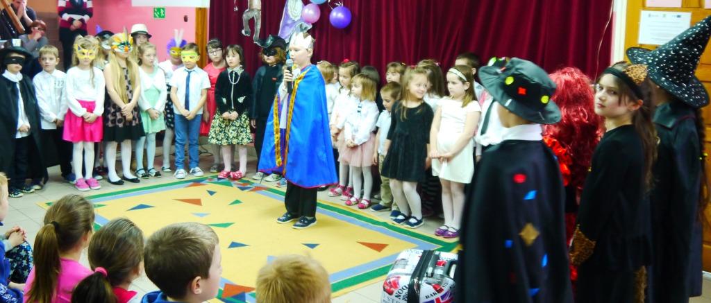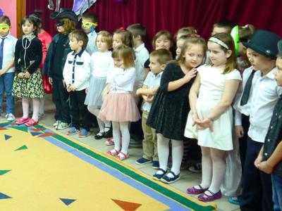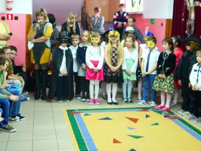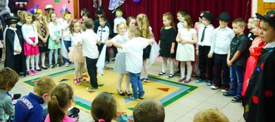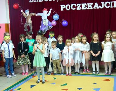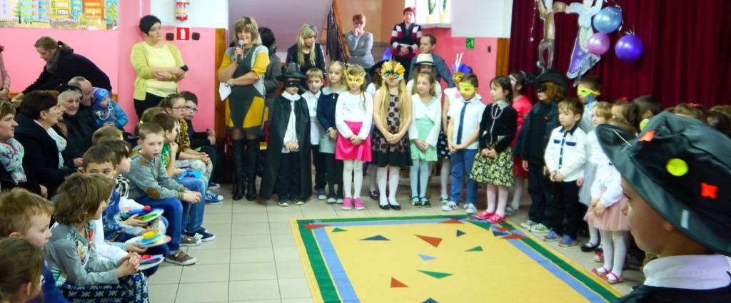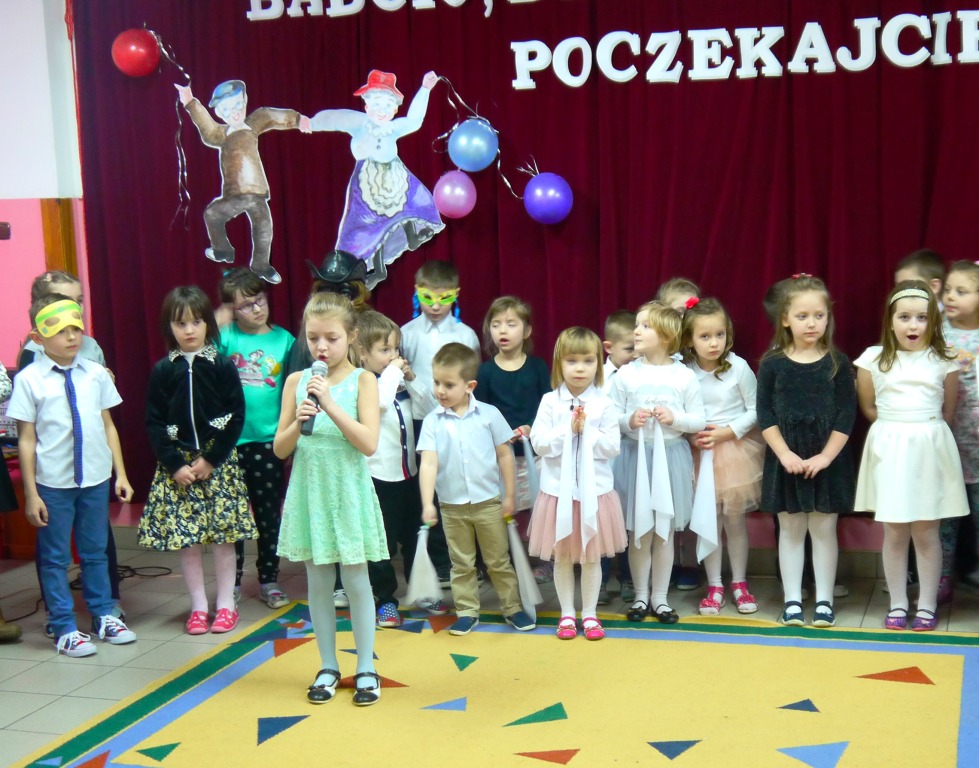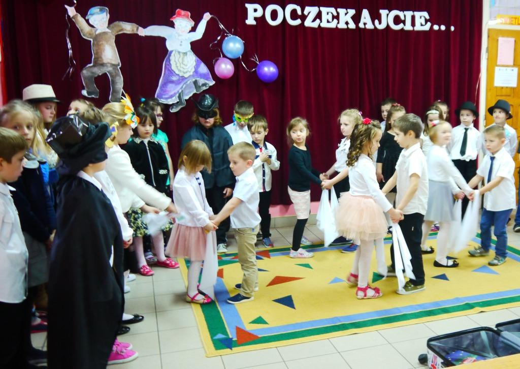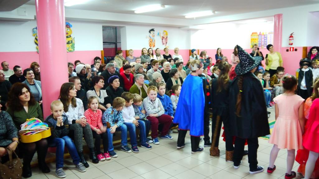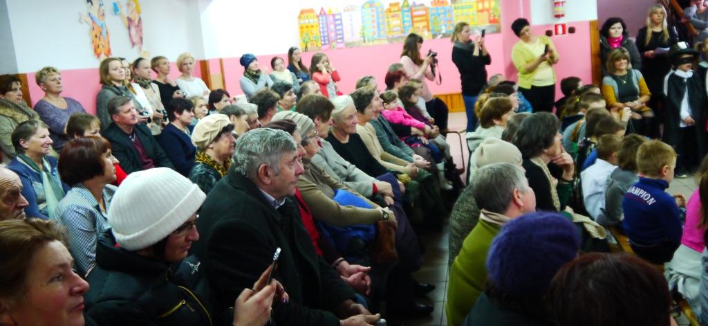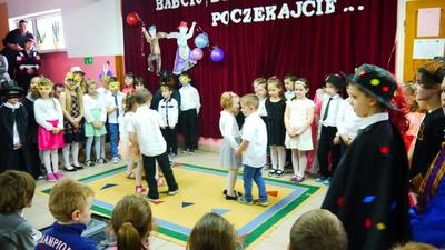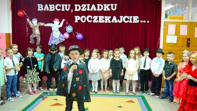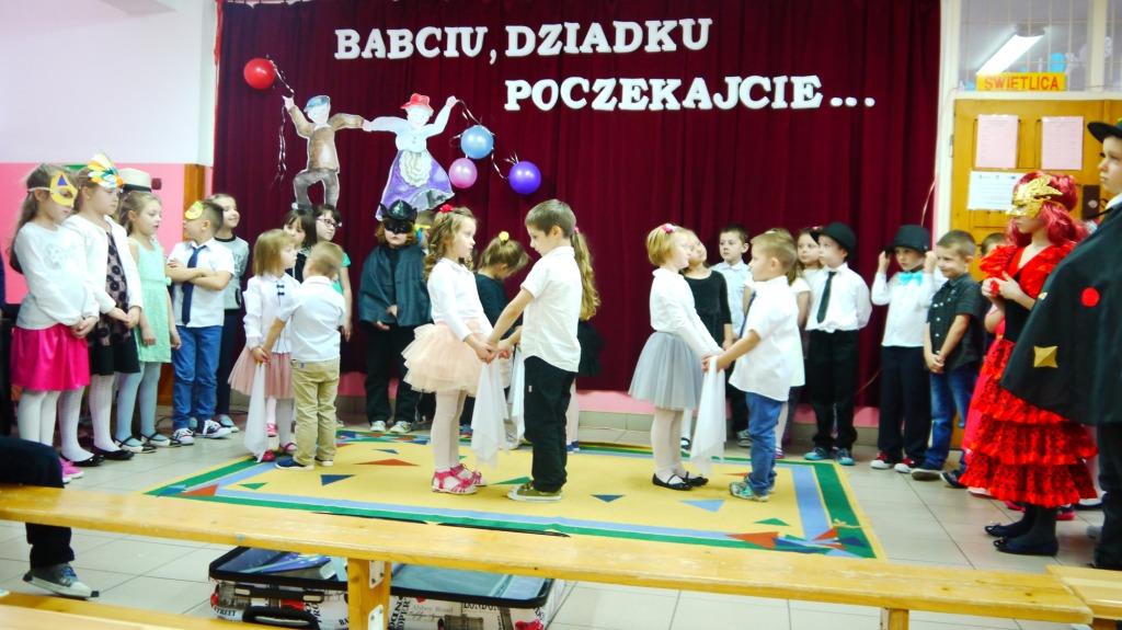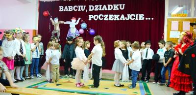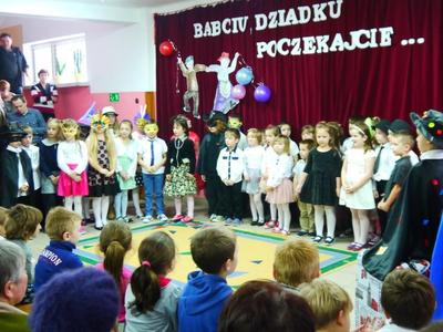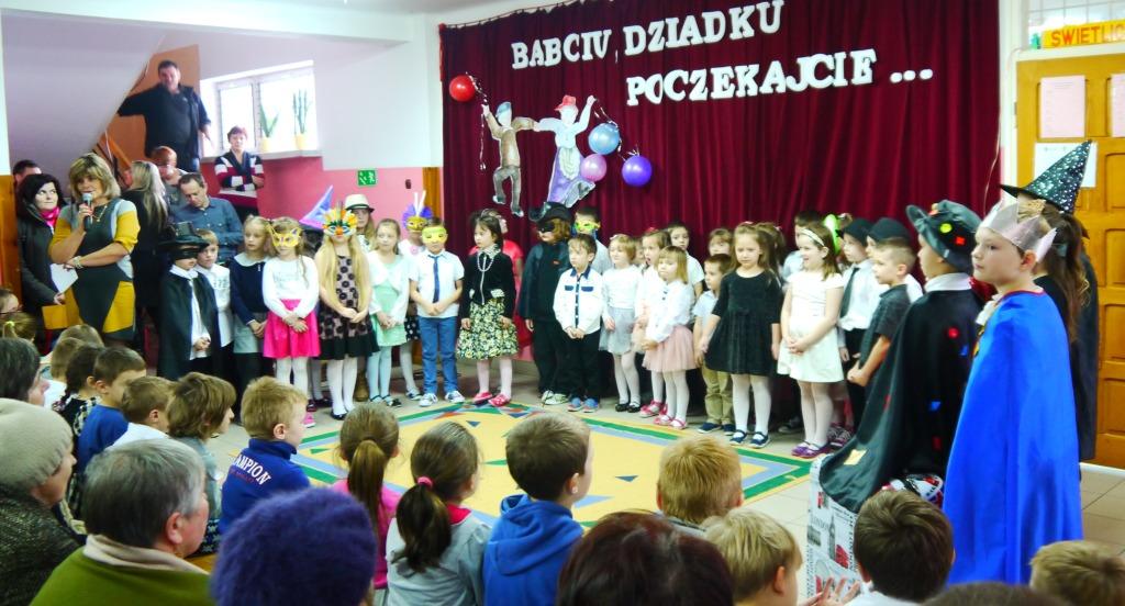 Licznie zgromadzoną publiczność bardzo serdecznie powitała pani Dyrektor Marzena Suchora, kierując jednocześnie kilka wzruszających słów do tak zacnych gości. Później scenę zdominowały dzieci z montażem słowno- muzycznym pt. „Babciu, Dziadku poczekajcie…”, przygotowanym pod kierunkiem p. A. Kozik przy współpracy p .A. Spławskiej- Kozieł i p .J. Dziurawiec. W trakcie uroczystości babcie i dziadkowie mogli podziwiać swoje pociechy w różnych formach artystycznych. Starsze dzieci z przejęciem odtwarzały swoje role przeglądając kartki starego albumu, a czcigodni goście ze wzruszeniem odbierali czułe słowa, kierowane pod ich adresem. Najmłodsi zaprezentowali swoje umiejętności taneczne, czym wzbudzili ogromny aplauz publiczności. Nie mniejszym zainteresowaniem cieszył się konkurs dotyczący znajomości ścieżek dźwiękowych polskich filmów i seriali.