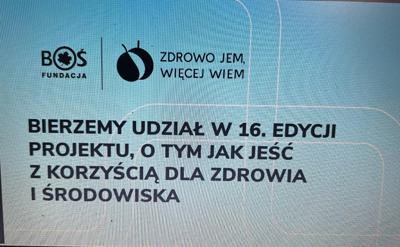 „Zdrowo jem, więcej wiem” to ogólnopolski projekt edukacyjny, pod patronatem honorowym Ministerstwa Edukacji, który klasa II właśnie zaczęła realizować. Etap I poświęcony jest wyborom żywieniowym, które mają wpływ zarówno na zdrowie jak i środowisko....