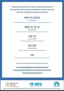 Podajemy do wiadomości telefony zaufania oraz infolinii wsparcia dzieci i młodzieży oraz dorosłych, którzy potrzebują pomocy. Dzieci i młodzież w kryzysie psychicznym, które mają problemy w domu, w szkole, w tym w relacjach rówieśniczych, przy zapewnieniu anonimowości i...