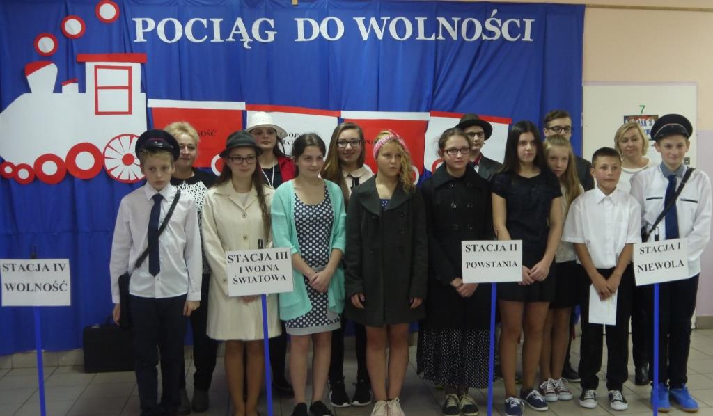 Dnia 13 listopada w naszej szkole odbyła się uroczysta akademia z okazji Święta Niepodległości, którą przygotowali uczniowie z klasy VII przy współpracy uczennic z klasy VI pod opieką pani Joanny Niezgody. Chórek śpiewający pieśni stanowiły uczennice z klasy II gimnazjum. Uroczystość rozpoczęła się hymnem odśpiewanym przez całą społeczność uczniowską. Scenografię stanowił pociąg oraz 4 stacje kolejowe. 1. stacja - NIEWOLA 2. stacja - POWSTANIA 3. stacja: I WOJNA ŚWIATOWA a 4. Stacja: WOLNOŚĆ.