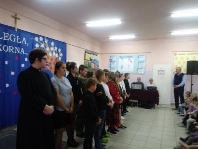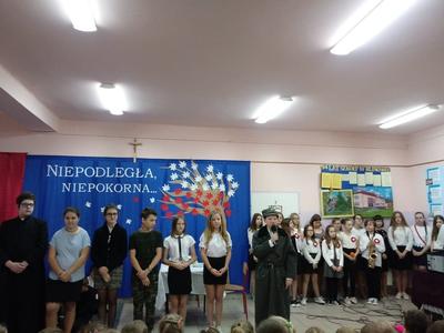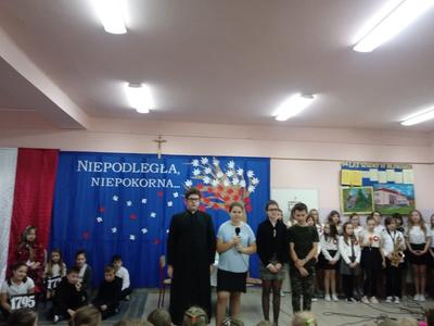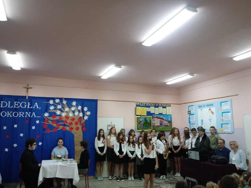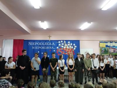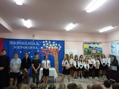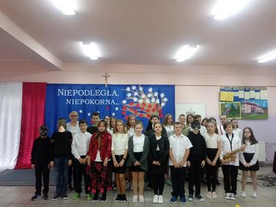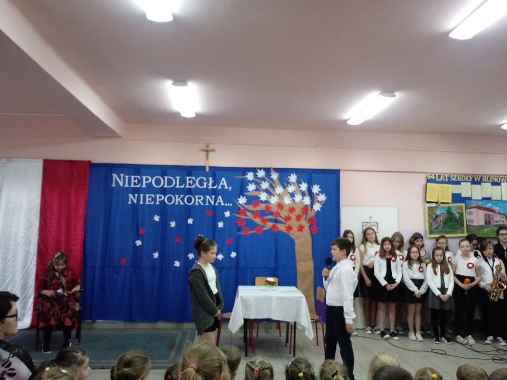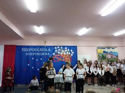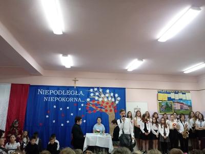 Uczniowie z klasy IV, VI i VII pod opieką mgr Joanny Niezgody przygotowali podniosłą i wzruszającą akademię. Przypomnieli trudną drogę Polaków do upragnionej wolności. W sugestywnej scence przedstawili tło historyczne tego doniosłego wydarzenia. Ukazali heroizm i determinację naszych przodków, którzy doprowadzili Polskę do niepodległości. Występ wzbogaciły piękne wiersze i pieśni patriotyczne. Była to ważna lekcja historii i patriotyzmu.