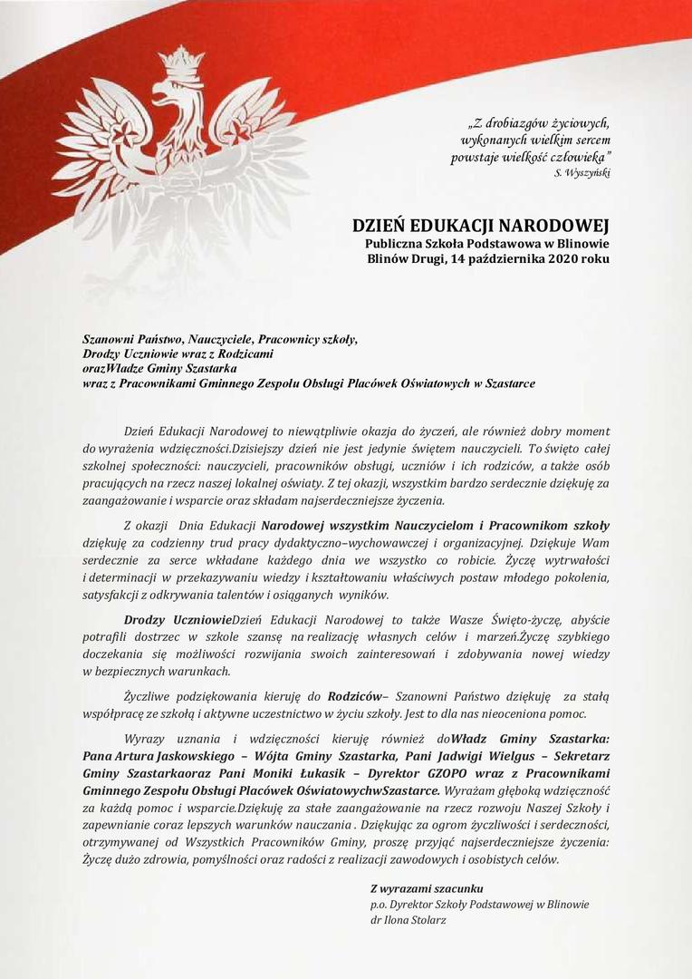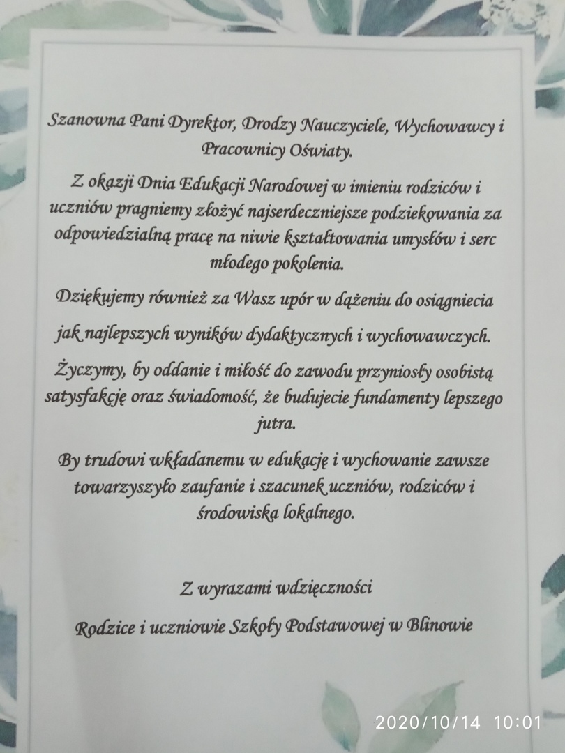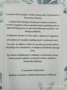 Dzień Edukacji Narodowej to niewątpliwie okazja do życzeń, ale również dobry moment do wyrażenia wdzięczności.Dzisiejszy dzień nie jest jedynie świętem nauczycieli. To święto całej szkolnej społeczności: nauczycieli, pracowników obsługi, uczniów i ich rodziców, a także osób pracujących na rzecz naszej lokalnej oświaty. Z tej okazji, wszystkim bardzo serdecznie dziękuję za zaangażowanie i wsparcie oraz składam najserdeczniejsze życzenia.
