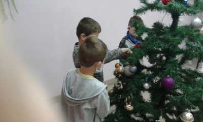 Ubieranie choinki to jeden z najprzyjemniejszych momentów w życiu każdego dziecka. 4 grudnia, tuż przed wizytą Świętego Mikołaja, dzieci z obydwóch grup przedszkolnych z wielkim zapałem zabrały się do ubierania szkolnych choinek. Z wielką radością i zaangażowaniem wieszały bombki, kolorowe łańcuchy i światełka. Dzięki pomocy pracowników szkoły na szkolnym holu stanęła także szopka bożonarodzeniowa. Nie zabrakło również dekoracji na korytarzach i w przedszkolnych salach. Efekt tej wspólnej pracy okazał się zachwycający. Teraz pozostaje nam tylko czekać na święta.