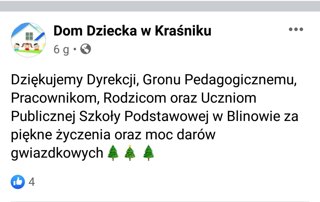 W dniach od 14 grudnia 2020 roku do 22 grudnia 2020 roku w naszej szkole organizowana była zbiórka słodyczy i artykułów szkolnych dla dzieci z Domu Dziecka w Kraśniku.