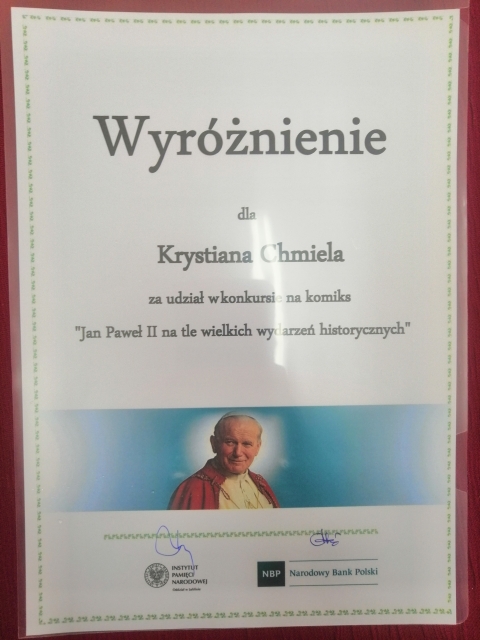 Wyróżnienie otrzymał uczeń klasy 5 Krystian Chmiel za pracę pt. „Powrót do Polski”.