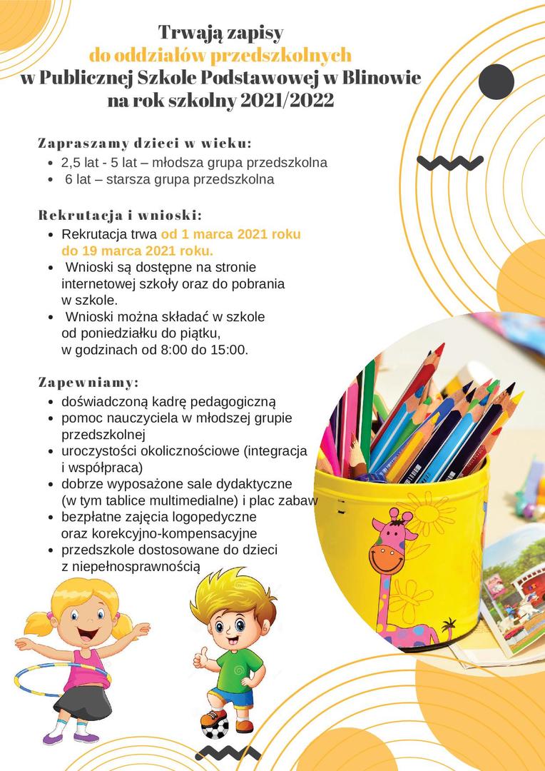 Dyrektor Publicznej Szkoły Podstawowej w Blinowie ogłasza rekrutację dzieci do oddziałów przedszkolnych na rok szkolny 2021/2022:
