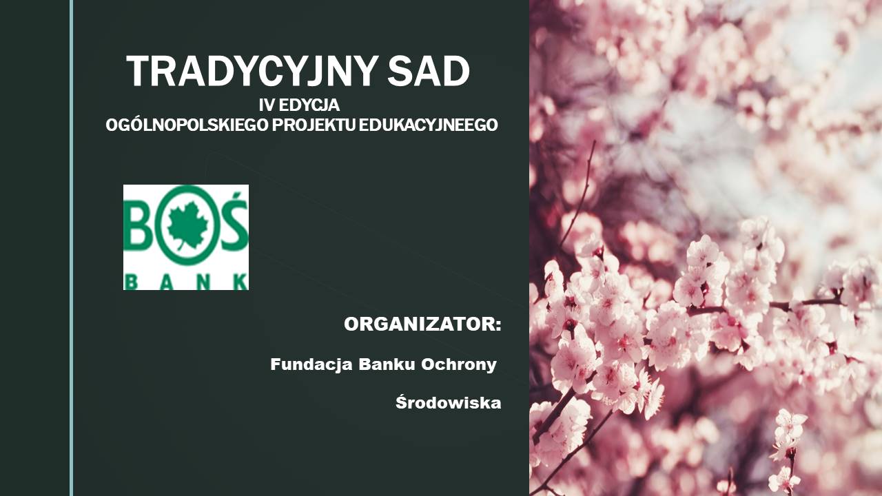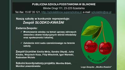 W tym roku Publiczna Szkoła Podstawowa w Blinowie przystąpiła do konkursu  w ramach IV Edycji Ogólnopolskiego  Projektu Edukacyjnego organizowanego przez Fundację Banku Ochrony Środowiska. Celem projektu jest  poznanie sadowniczego dziedzictwa polskich ziem i restytucji starych odmian drzew w formie szkolnego mini sadu składającego się z co najmniej 5 drzew sadzonych swobodnie na ogólnodostępnym terenie. Tegoroczna edycja dotyczy naturalnych odmian czereśni.