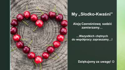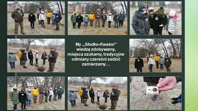 • Na naszym terenie nie ma wielu sadów drzew owocowych, ale kolejnym zadaniem Słodko -Kwaśnych było znalezienie  takiego właśnie sadu. Zgodnie z powiedzeniem "Kto szuka ten znajdzie" Sandra Obydź - lider zespołu, znalazła taki sad na działce należącej do swojego dziadka. Właściciel 60-cio letniego sadu pan Jan Sulowski - emerytowany nauczyciel  został naszym ekspertem w dziedzinie naturalnej uprawy czereśni, a przy okazji opowiedział nam   tradycjach sadowniczych na terenie naszej szkoły. Tradycje te sięgają przełomu XIX  i XX wieku, kiedy to na terenie naszej szkoły był dwór folwarczny.  Lipy ("Lipki"), jabłonie oraz inne drzewa parkowe na terenie szkoły, wokół boiska szkolonego, gdzie często spędzamy czas,  zostały posadzone na polecenie dziedzica Kończyńskiego na początku XX wieku.
