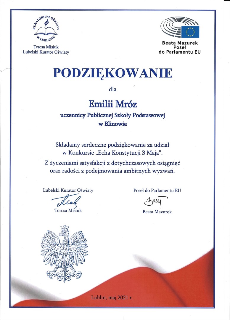 Odbył się szkolny konkurs literacki na wiersz patriotyczny „POLSKA – MOJA OJCZYZNA”, w którym uczestniczyli uczniowie z klas IV - VIII. Celem konkursu było: rozwijanie uczuć patriotycznych wśród dzieci i młodzieży, propagowanie piękna języka polskiego, rozbudzanie zainteresowań twórczością poetycką, a także promowanie uzdolnionych młodych twórców.