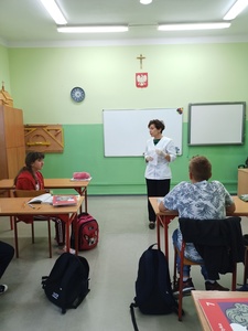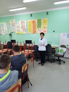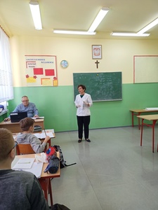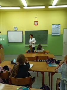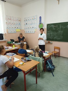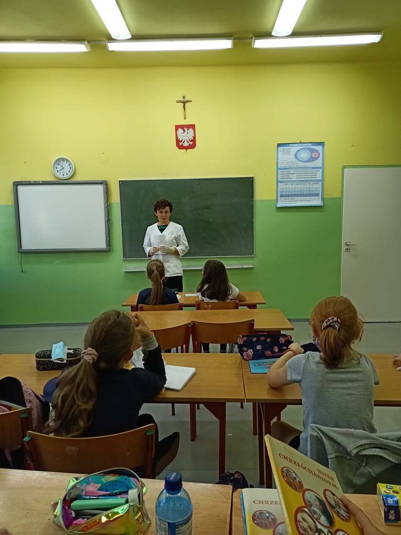 W trosce o bezpieczeństwo uczniów , pracowników szkół i ich najbliższych dnia 10 września odbyło się spotkanie w naszej szkole z panią Marzeną Witkowską. Wizyta higienistki miała na celu przypomnienie zasad funkcjonowania uczniów w szkole w czasie reżimu sanitarnego w związku z pandemią Covid 19 oraz promocją szczepień dla uczniów od 12 roku życia . Podczas spotkania uczniowie mieli okazję przypomnieć sobie o tym ,że do szkoły mogą uczęszczać osoby bez objawów sugerujących infekcję dróg oddechowych ,oraz gdy domownicy nie przebywają na kwarantannie, lub w izolacji w warunkach domowych.