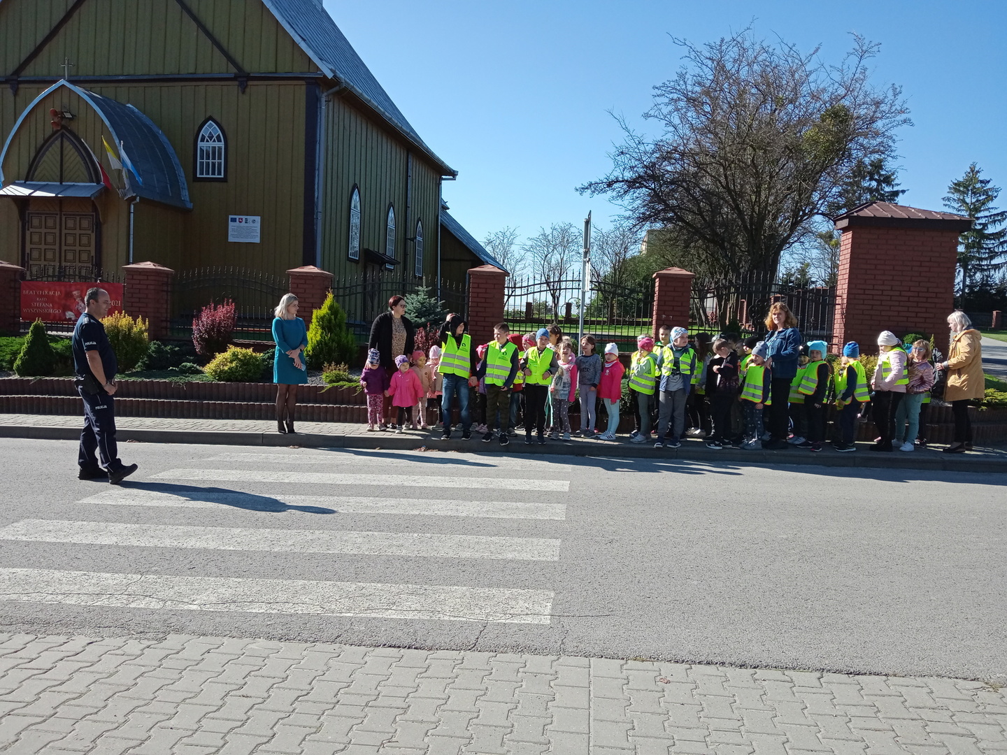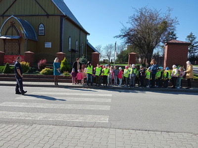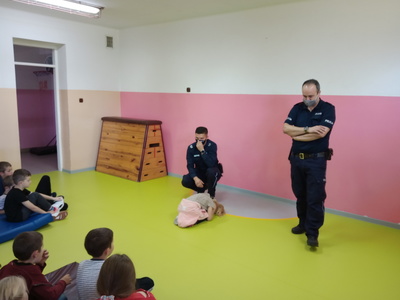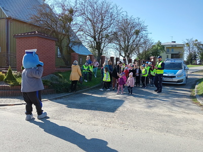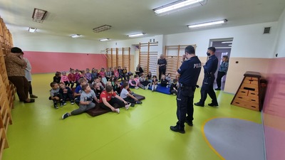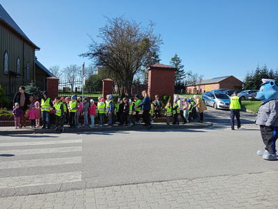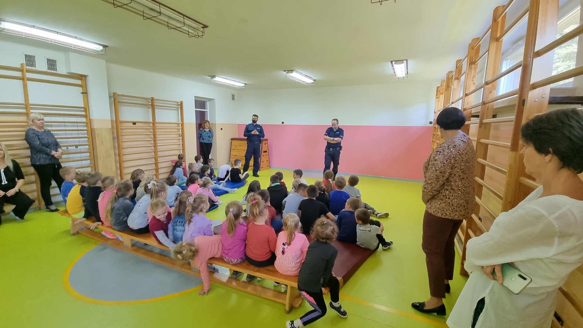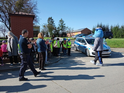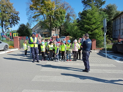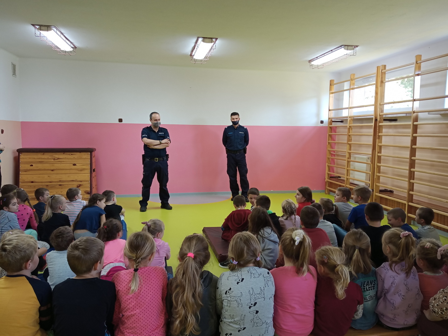 Tematem spotkania było utrwalenie z dziećmi zasad ruchu drogowego oraz przypomnienie zagadnień dotyczących bezpieczeństwa dzieci w szkole i poza nią. Panowie policjanci przypomnieli dzieciom podstawowe zasady zachowania się podczas przechodzenia przez jezdnię. Następnie tłumaczyli jak należy zachować się w kontaktach z obcymi ludźmi, jak dbać o bezpieczeństwo własne i innych oraz do kogo zwracać się o pomoc w sytuacji zagrożenia. Policjanci zademonstrowali dzieciom również, w jaki sposób należy się zachowywać podczas ataku psa. Po interesującej pogadance przyszedł czas na część praktyczną. Pod czujnym okiem policjantów i w asyście „Inspektora Kraśniczka” dzieci przechodziły przez jezdnię zgodnie z zasadami bezpieczeństwa. Miały możliwość obejrzenia z bliska radiowozu i posłuchania sygnałów policyjnej syreny. Uwieńczeniem spotkania z policjantami było wykonanie pamiątkowych zdjęć.