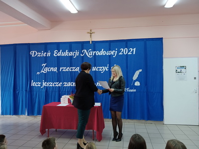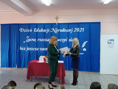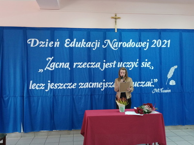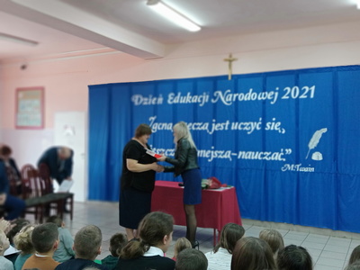 Na zakończenie uroczystości wystąpiła pani Katarzyna Krawczyk -przewodnicząca Rady Rodziców. W imieniu wszystkich rodziców podziękowała za opiekę i wsparcie w wychowaniu ich dzieci oraz poświęcenie w pracy dydaktycznej, która w tych czasach jest trudna i wymagająca. Wyrazem podziękowań i wdzięczności był także słodki poczęstunek.