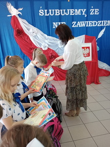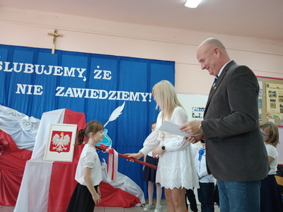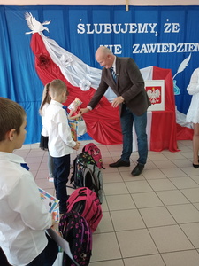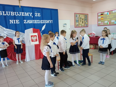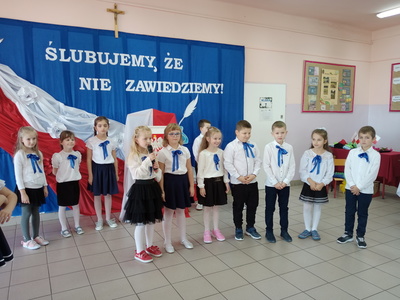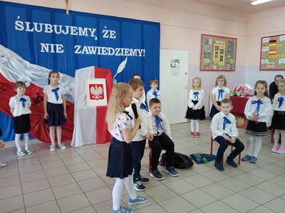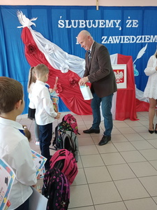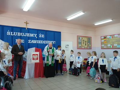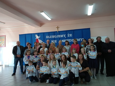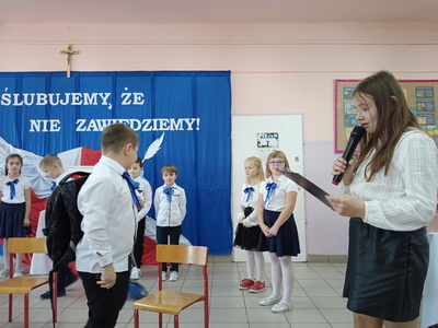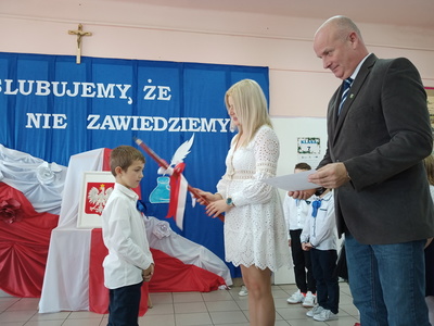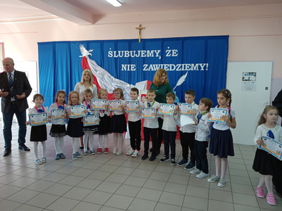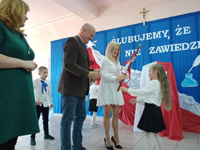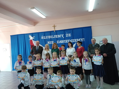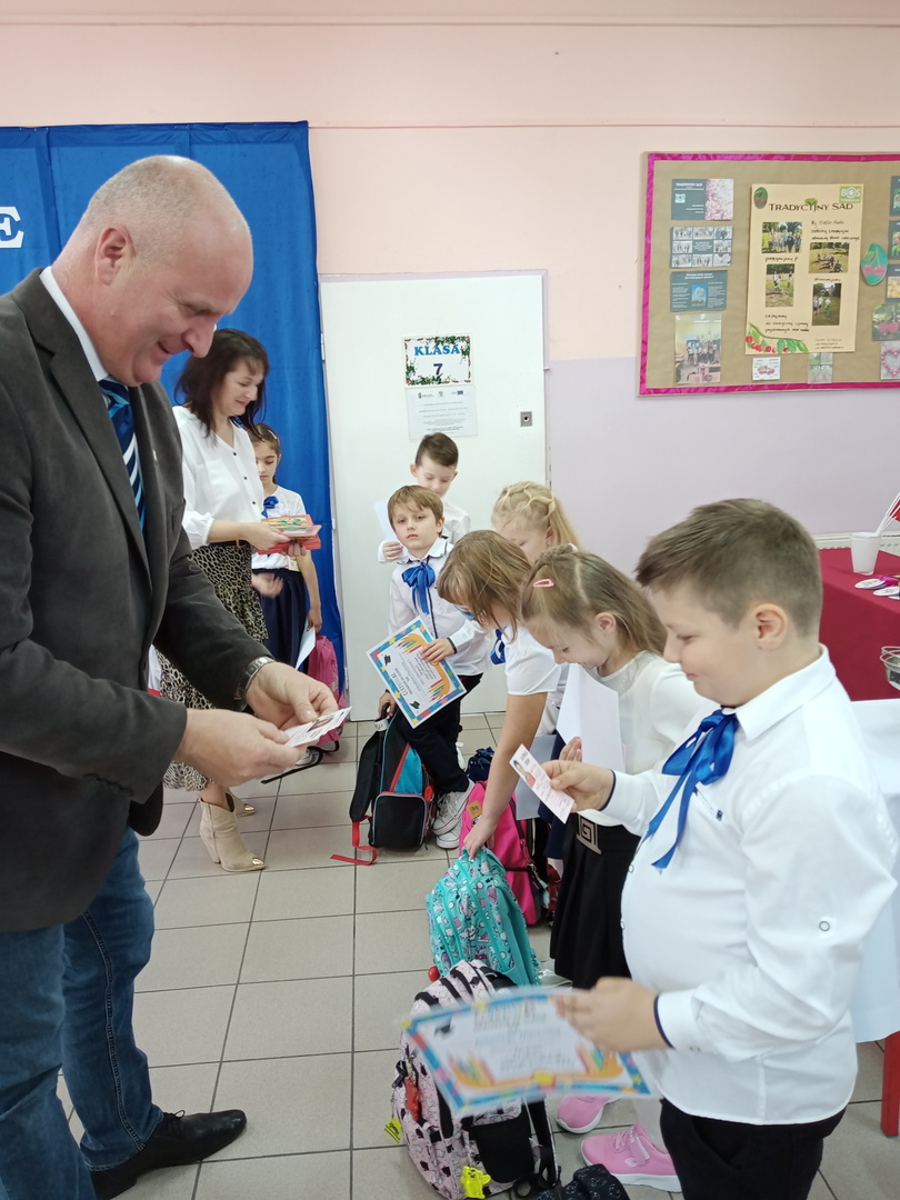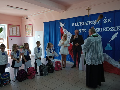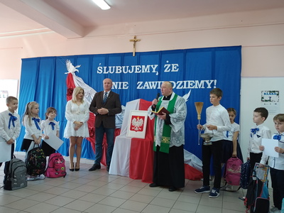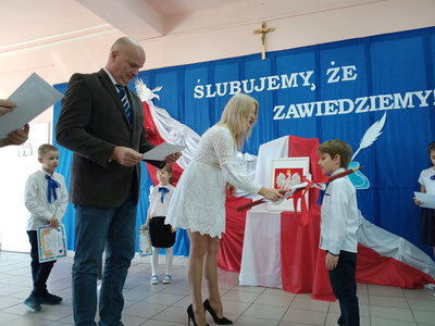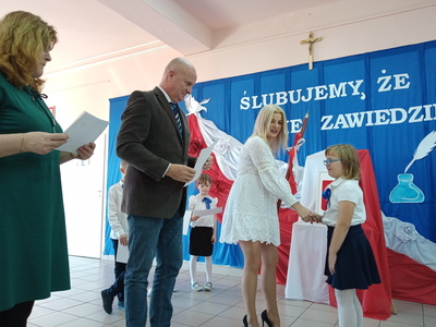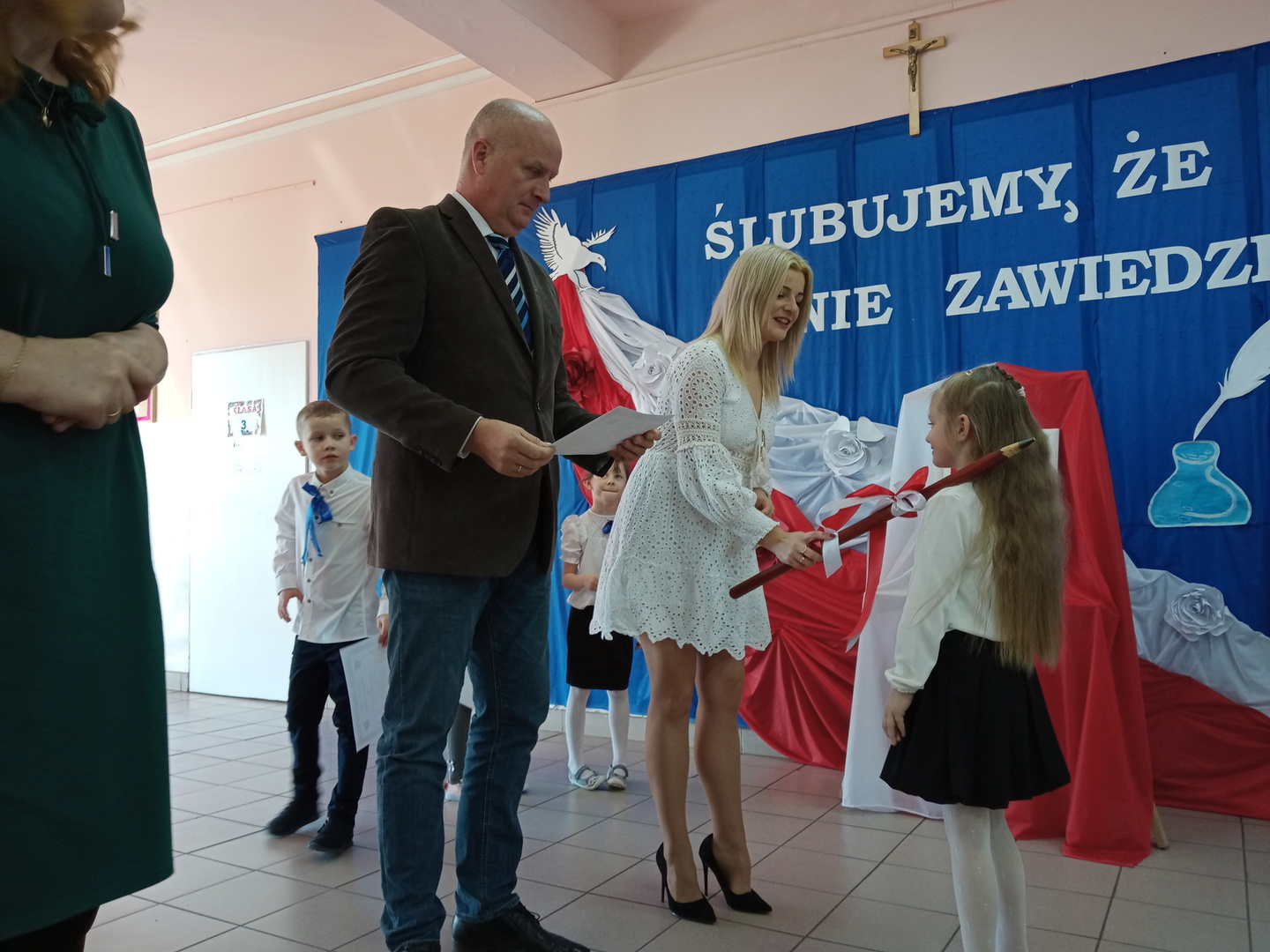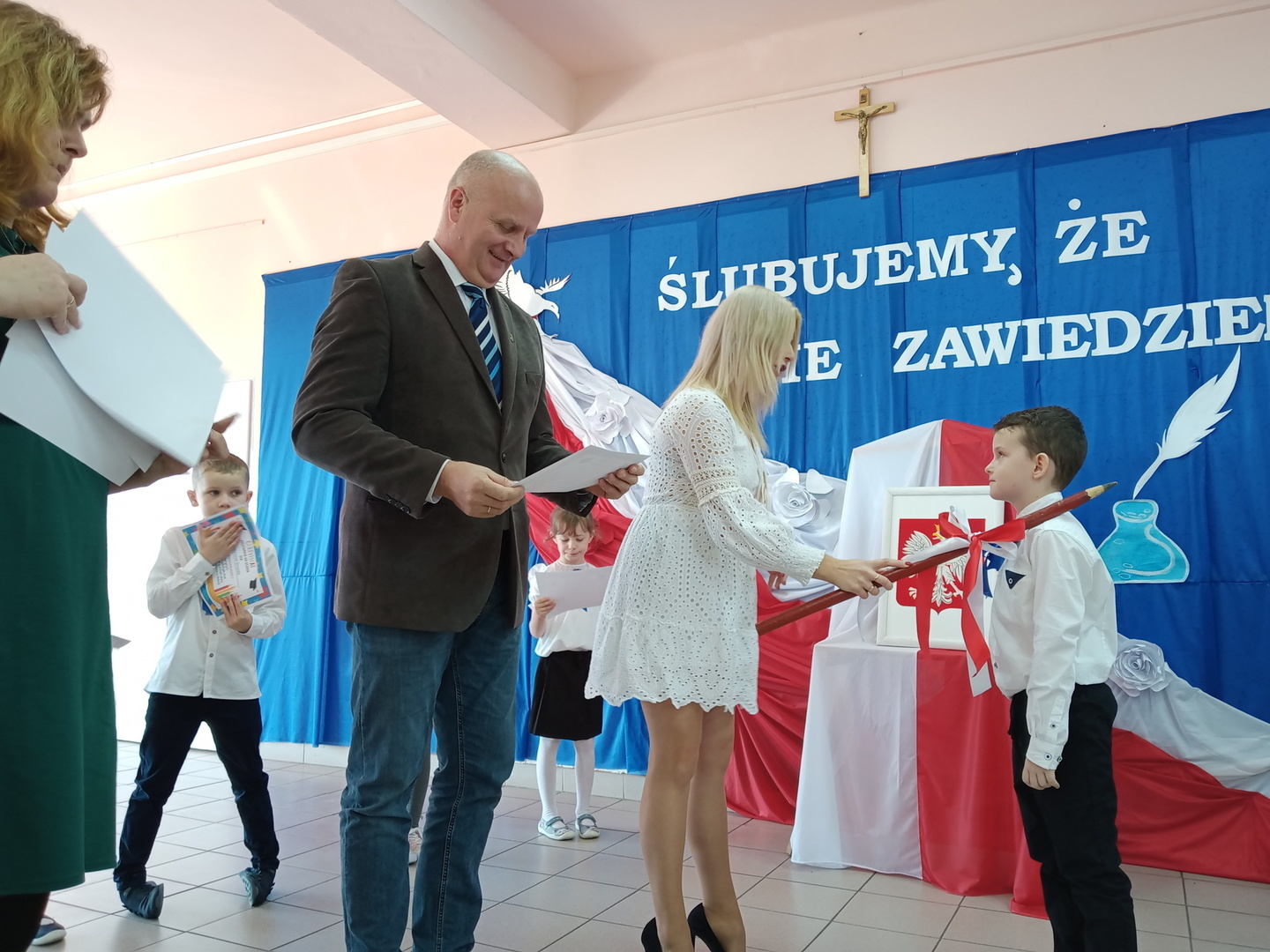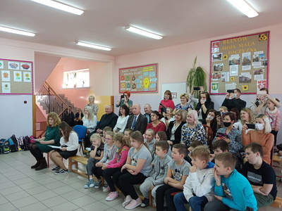 Dnia 25 października 2021roku odbyła się w naszej szkole uroczystość ślubowania uczniów klasy pierwszej. To bardzo ważne wydarzenie nie tylko dla najmłodszych, ale również dla ich rodziców. Na uroczystość przybyli zaproszeni goście: Wójt Gminy Szastarka Artur Jaskowski, Pani Sekretarz Jadwiga Wielgus, Ks. Proboszcz Piotr Wąsek oraz nauczyciele i rodzice uczniów klas pierwszych. Wszystkich zebranych powitała Pani dyrektor dr Ilona Stolarz. Zanim pierwszoklasiści zostali przyjęci do grona społeczności szkolnej musieli przedstawić to, czego już się w szkole nauczyli. Gotowi, odświętnie ubrani i bardzo przejęci przystąpili do zaprezentowania swoich umiejętności. Doniosłym momentem uroczystości było ślubowanie pierwszoklasistów, które wzbudziło wiele emocji. Aktu pasowania dokonała Pani Dyrektor drewnianym ołówkiem. Tym samym pierwszaki zostały włączone do społeczności uczniowskiej Publicznej Szkoły Podstawowej w Blinowie. Następnie Ks. Proboszcz poświęcił uczniom klasy pierwszej szkolne plecaki. Najmłodsi otrzymali wspaniałe upominki od Pana Wójta i Pani Sekretarz. Od Pani Dyrektor dostali pamiątkowe książki, dyplomy oraz legitymacje szkolne. Przedstawiciele Samorządu Uczniowskiego wręczyli pierwszakom kolorowe medale. Rodzice także sprawili swoim pociechom piękne niespodzianki. Po pamiątkowej sesji zdjęciowej uczniowie oraz zaproszeni goście udali się do sali gimnastycznej na poczęstunek zorganizowany przez rodziców. Pierwszakom życzymy wielu sukcesów w murach naszej szkoły, a rodzicom raz jeszcze serdecznie dziękujemy!