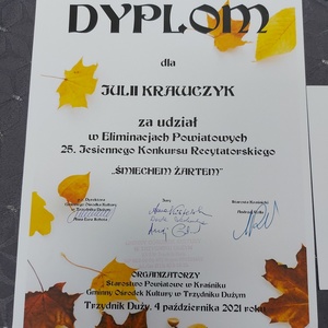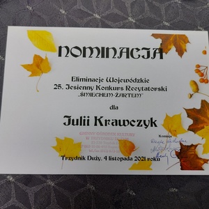 Julia uzyskała nominację do finału wojewódzkiego w Lublinie, który zaplanowany jest na 26.11.2021 roku. Dodać należy, że wraz z nią wystąpi tylko jeszcze dwóch uczniów z naszego powiatu. Gratulujemy serdecznie tak udanego występu podopiecznej pani Marzeny Kwiatkowskiej i życzymy powodzenia w finale
