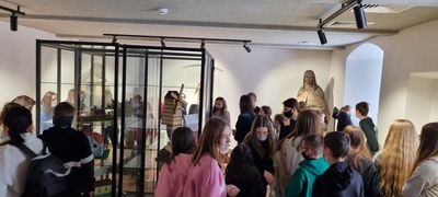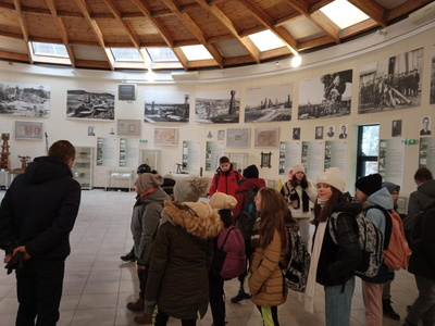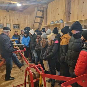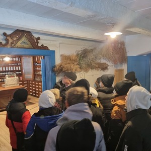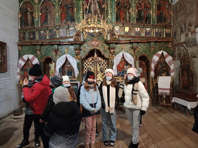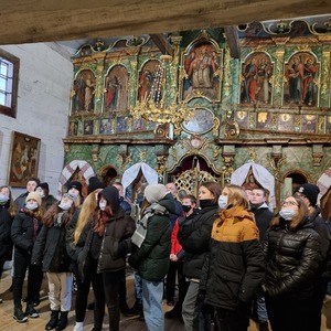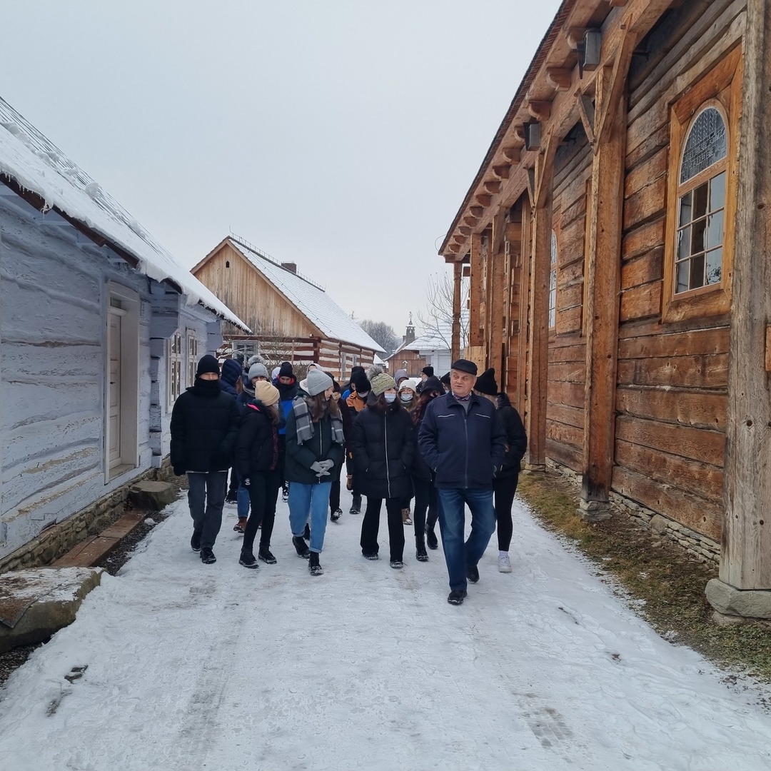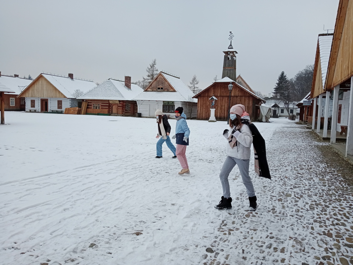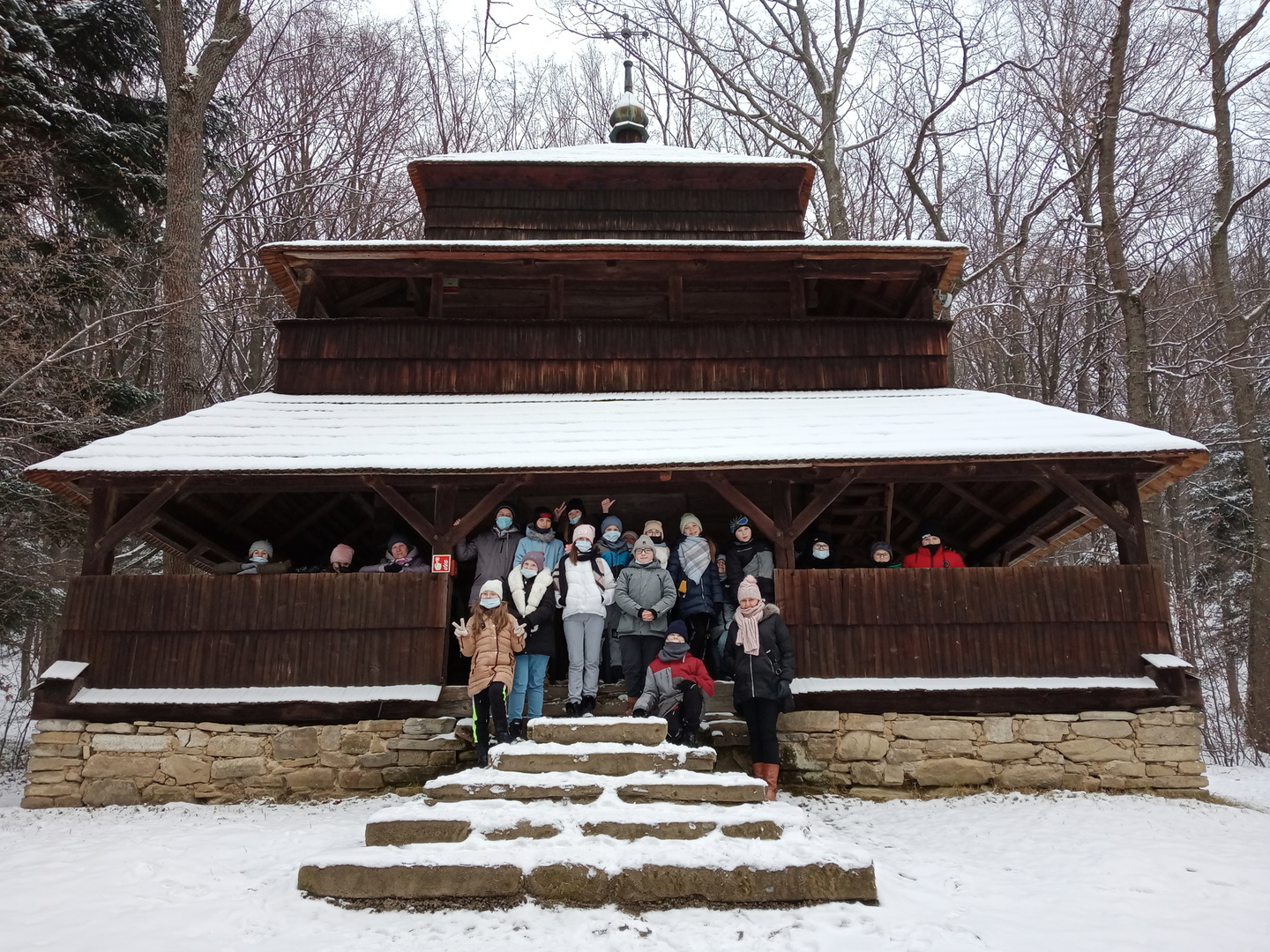 Później pojechaliśmy do Muzeum Budownictwa Ludowego w Sanoku – jednego z największych muzeów na wolnym powietrzu w Polsce. Na początku obejrzeliśmy Galicyjski Rynek – rekonstrukcje centrum galicyjskiego miasteczka z równoczesnym pokazaniem jego wszystkich funkcji: społecznych, gospodarczych i kulturowych. Weszliśmy między innymi do domów: zegarmistrza, fryzjera, aptekarza. Potem kolejno zwiedzaliśmy wiejskie chaty, cerkiew, szkołę i plebanię. Warto zauważyć, że wszystkie te obiekty są w pełni wyposażone w sprzęty, którymi posługiwali się ówcześni mieszkańcy.