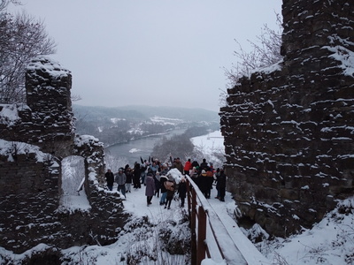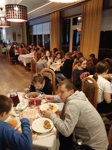 Potrzeby kulturalne mieliśmy już zaspokojone, więc trzeba było zaspokoić te pierwotne, co uczyniliśmy w „restauracji” McDonald. Następnie spotkaliśmy się z przewodnikiem panem Danielem, który w drodze autokarem do Soliny przybliżył nam geografię, historię i kulturę związaną z terenem Bieszczadów. Jeszcze po drodze weszliśmy na górę Sobień, gdzie zobaczyliśmy ruiny zamku Kmitów. Trudy podejścia wynagrodził nam piękny widok na zakola rzeki San i Bieszczady. Po tak długim dniu udaliśmy się do pensjonatu „Amelia” w Solinie, by zjeść obiadokolację, odpocząć i nabrać sił przed kolejnym, pełnym wrażeń dniem.
