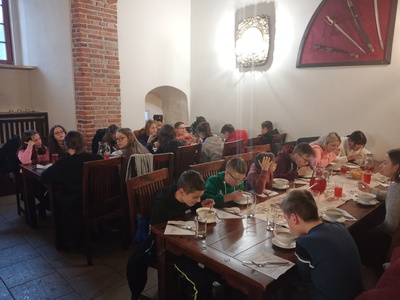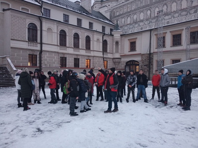 Wreszcie przyszedł czas na ostatni punkt programu i o godzinie 14.00 zameldowaliśmy się przed bramą zamku w Krasiczynie, jednego z najpiękniejszych pomników polskiego renesansu. Pobyt w zamku rozpoczęliśmy do zjedzenia obiadu. Następnie wraz z przewodnikiem obejrzeliśmy najpierw przepiękną bryłę zamku z czterema wieżami, później kryptę, kaplicę i kilka pomieszczeń. Największe jednak wrażenie na uczestnikach wycieczki zrobiła sala tortur w zamkowych lochach. I tak nasza przygoda dobiegła końca i ruszyliśmy w drogę do Blinowa.