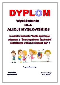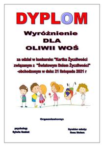 Uczennice kl . „IV” : Alicja Mysłowska i Oliwia Woś zostały wyróżnione za udział w konkursie „Kartka Życzliwości” organizowanym z okazji „Światowego Dnia Życzliwości” obchodzonym w dniu: 21 listopada 2021 r.