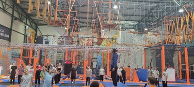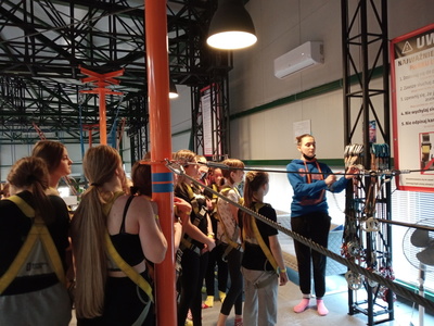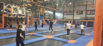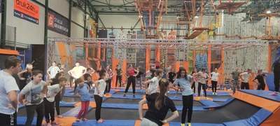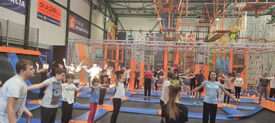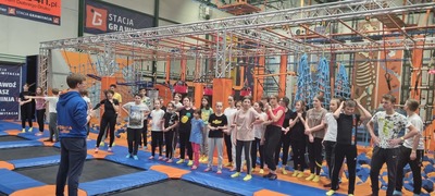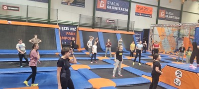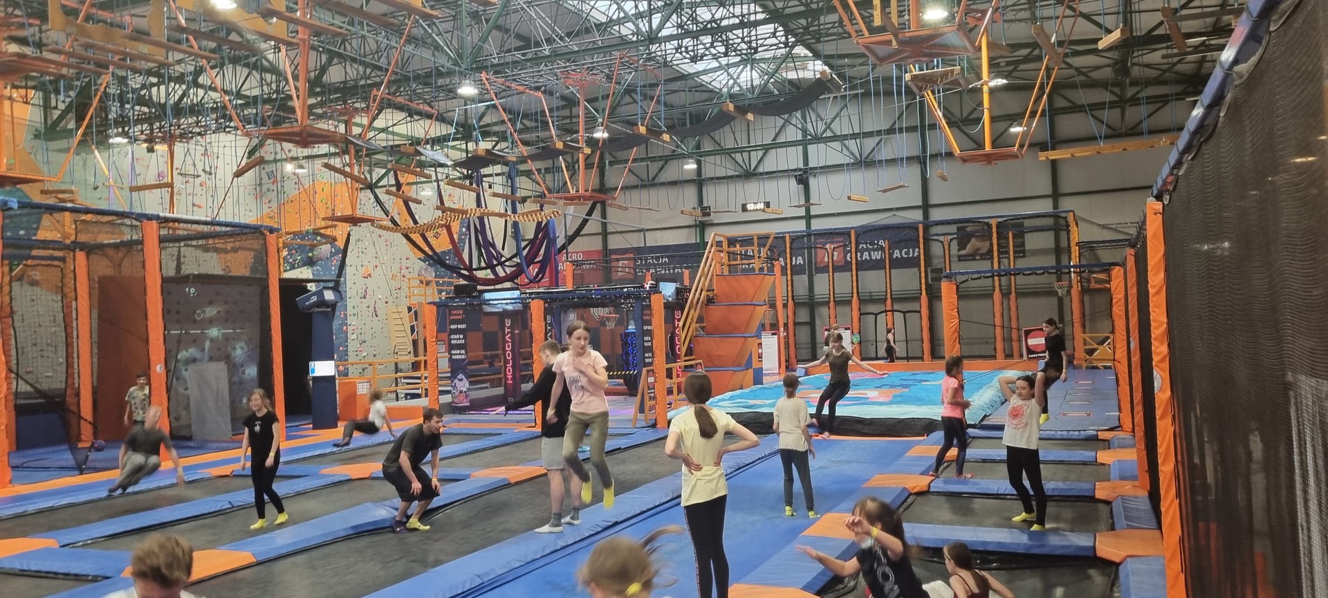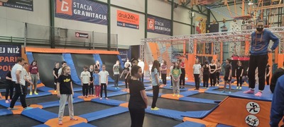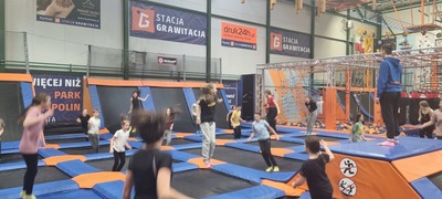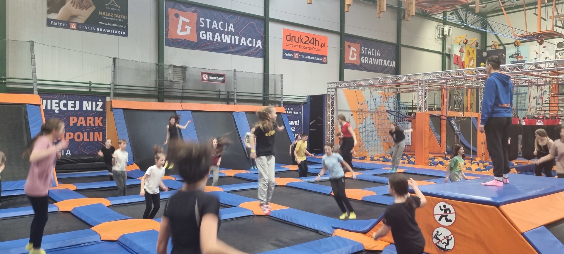 Po posiłku przyszedł czas na pożegnanie się z Sejmem, lecz nie był to koniec wycieczki. W planach mieliśmy jeszcze największy Park Trampolin w Europie. Pobyt tam był świetnym sposobem do aktywnego spędzania wolnego czasu oraz rozwijania zainteresowania sportem. Po profesjonalnej rozgrzewce pod okiem instruktora korzystaliśmy z szeregu atrakcji m.in. trampolin akrobatycznych, parku linowego, trampolin sportowych oraz basenów wypełnionych gąbkami. Wszyscy z radością skakaliśmy na trampolinach na różne sposoby. Dużym zainteresowaniem cieszyły się skoki do basenu z gąbkami. Pobyt w STACJI GRAWITACJI sprzyjał wyrabianiu nawyku aktywnego spędzania wolnego czasu oraz integracji naszego zespołu szkolnego. Ta coraz bardziej popularna forma aktywności fizycznej dostarczyła nam wielu niezapomnianych wrażeń. Na trampolinach było zabawnie i wesoło. Chcemy pojechać tam jeszcze raz. Dwugodzinny pobyt w tym wielkim i efektownym obiekcie, pozwolił nam się odprężyć przed powrotem do domu.