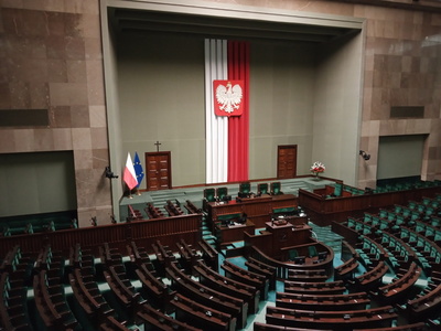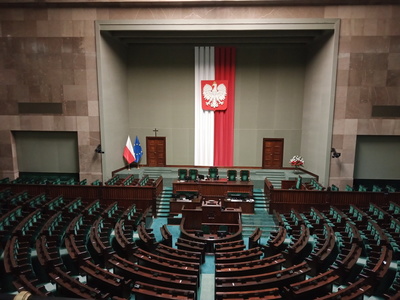 Rejestracja gości i skomplikowane procedury bezpieczeństwa mogły nieco zniechęcić wycieczkowiczów, tak się jednak nie stało. Zaraz po tym wkroczyliśmy w towarzystwie przewodniczki do budynku i po obejrzeniu wystawy informującej o historii siedziby władzy ustawodawczej, przeszliśmy do najbardziej znanej sali w polskiej polityce - Sali Posiedzeń Sejmu. Widzieć takie miejsce na żywo, to coś zupełnie innego niż transmisje telewizyjne. Chciałoby się powiedzieć, że jest dostojna i monumentalna. Bardzo odczuwało się w niej atmosferę czegoś reprezentacyjnego i doniosłego. Na miejscu wysłuchaliśmy krótkiego wykładu naszej przewodniczki i zrobiliśmy pamiątkowe zdjęcia.