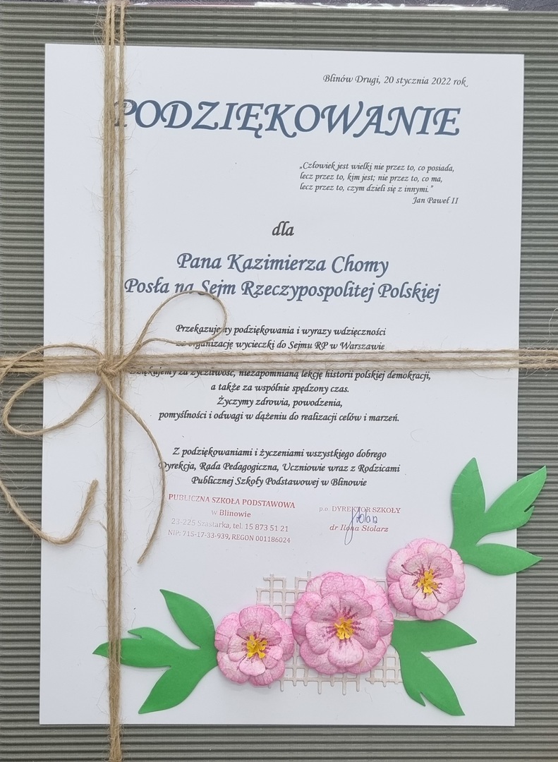 Wizyta W Sejmie RP była ważnym doświadczeniem. W imieniu uczestników wycieczki i całej szkoły, składamy podziękowania i wyrazy wdzięczności dla Pana Posła na Sejm RP Kazimierza Chomy oraz Pana Michała Stawiarskiego – „Stowarzyszenie Wschód Lubelskich Serc” za ufundowanie i organizację wycieczki do Sejmu RP w Warszawie. Dziękujemy za życzliwość, niezapomniana lekcje historii polskiej demokracji, a także za wspólnie spędzony czas.
