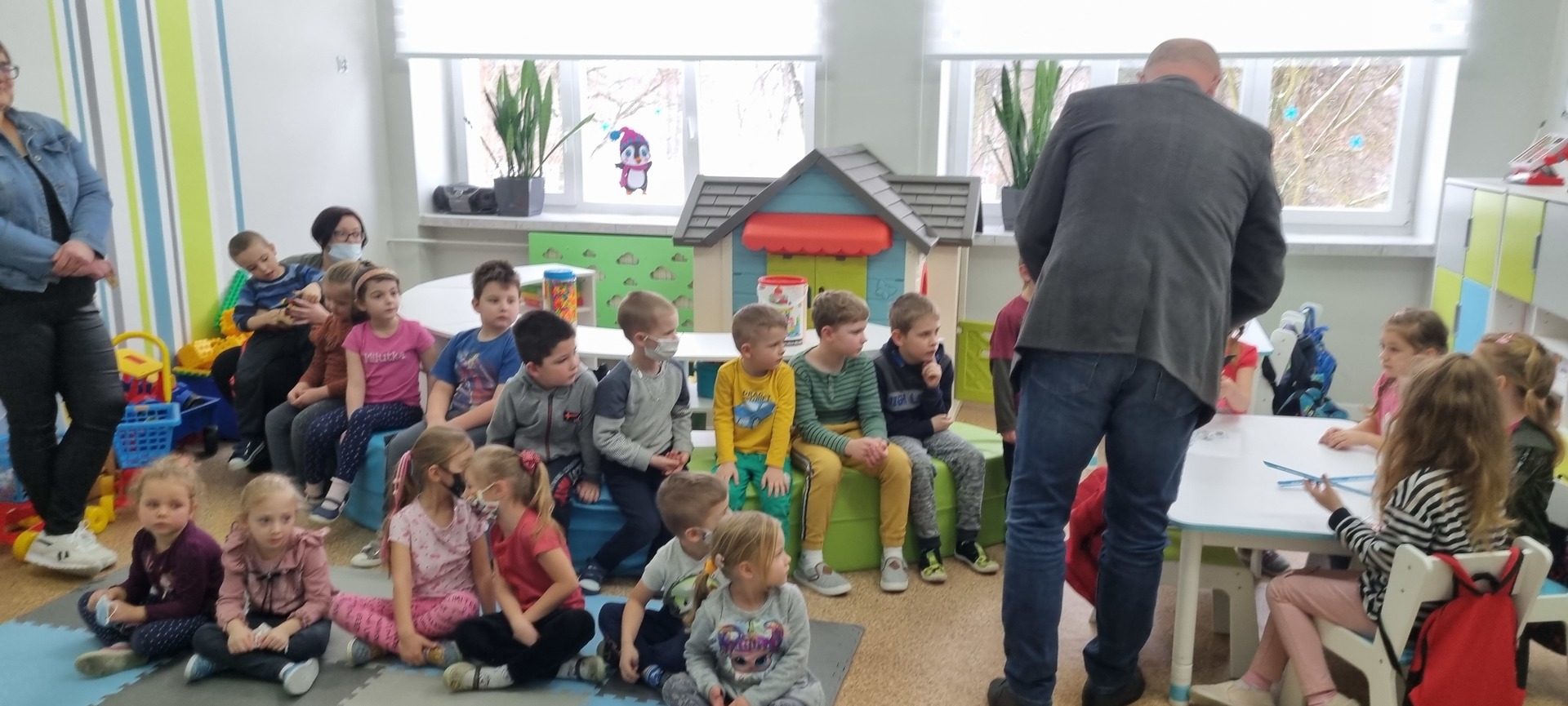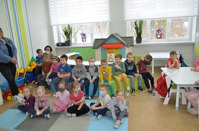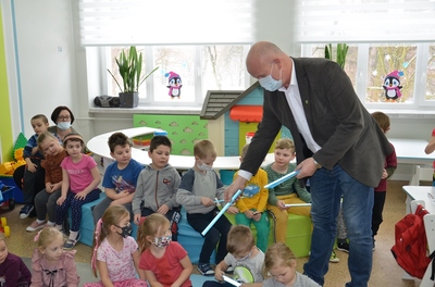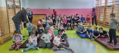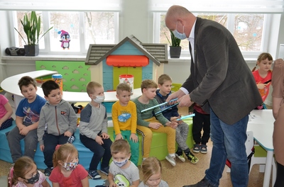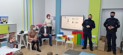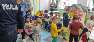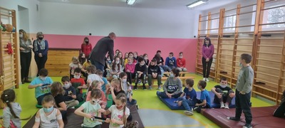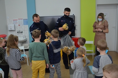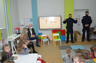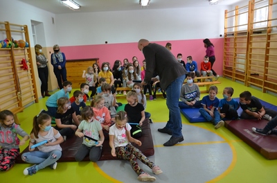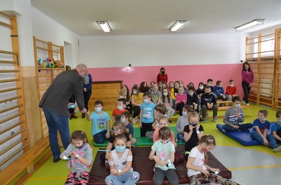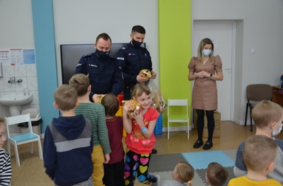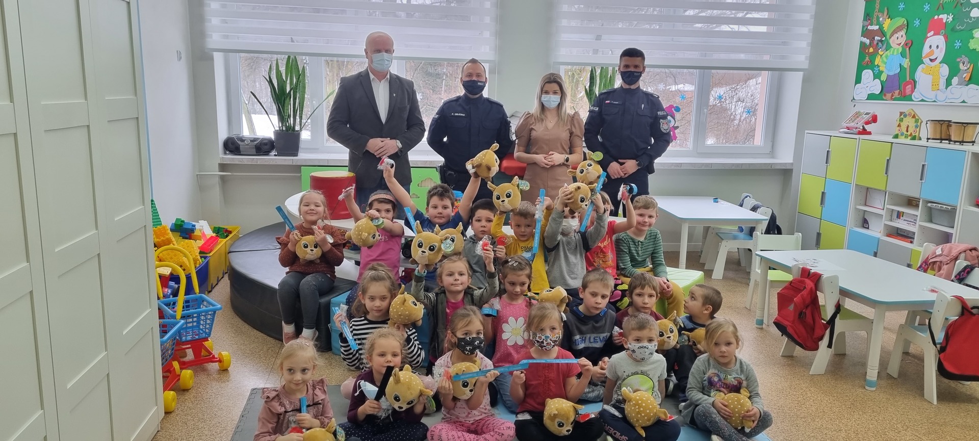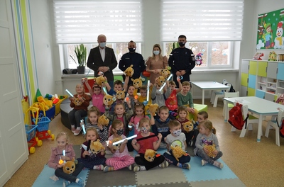 Spotkaniu towarzyszyła przyjazna, otwarta atmosfera pozwalająca dzieciom na aktywny udział. Dzieci czuły się swobodnie, zadawały mnóstwo pytań i prezentowały przykłady nieodpowiedzialnego zachowania. Na koniec Pan Wójt wszystkim wręczył praktyczne opaski odblaskowe i odblaskowe zawieszki do plecaka. Dzięki temu dzieci pełne pozytywnych emocji mogły nabyć praktycznych umiejętności prawidłowego zakładania tych drobnych, ale jakże ważnych gadżetów. Panowie Policjanci obdarowali dzieci z oddziałów przedszkolnych maskotkami.