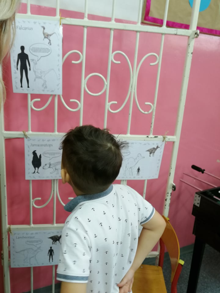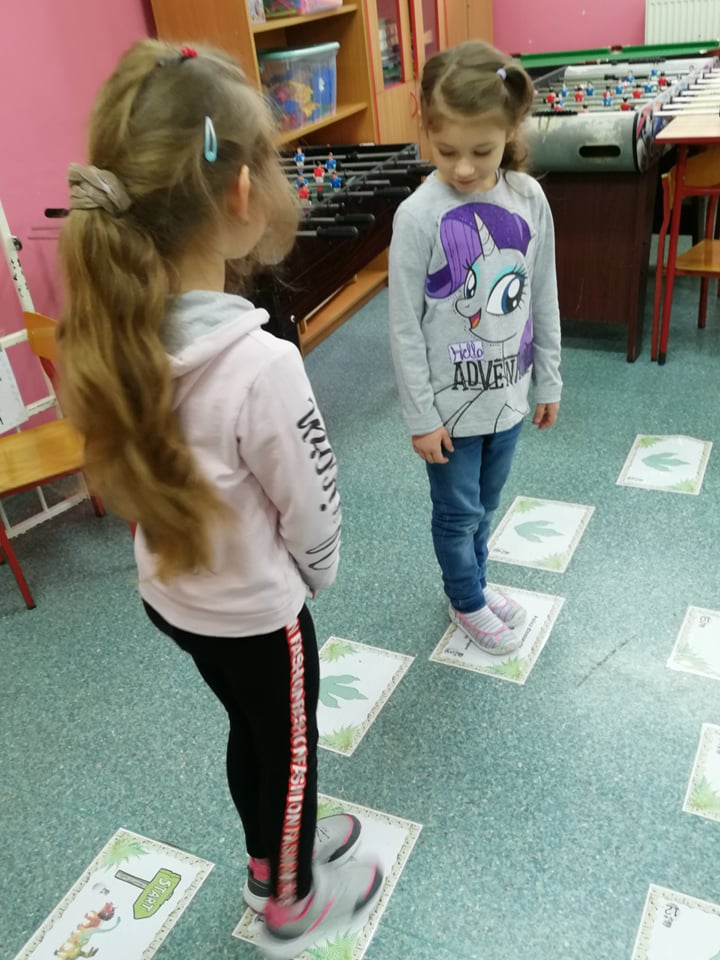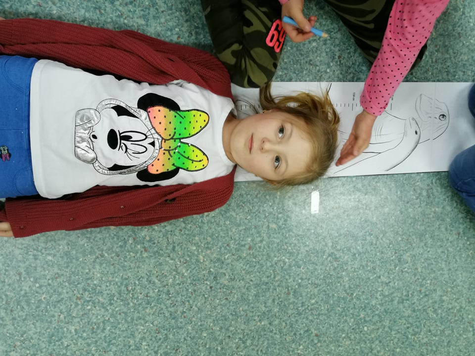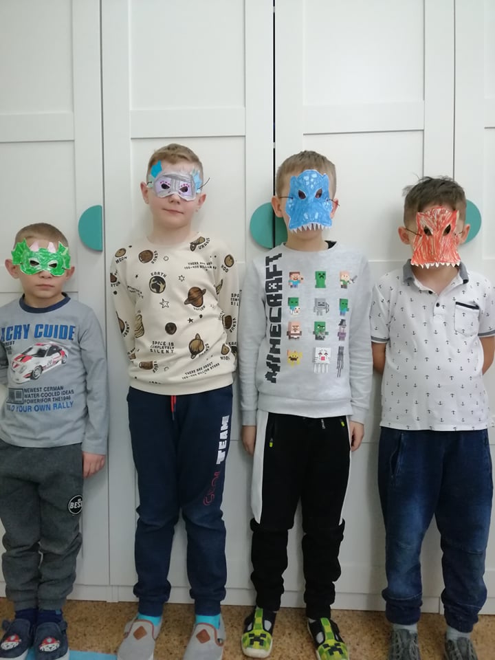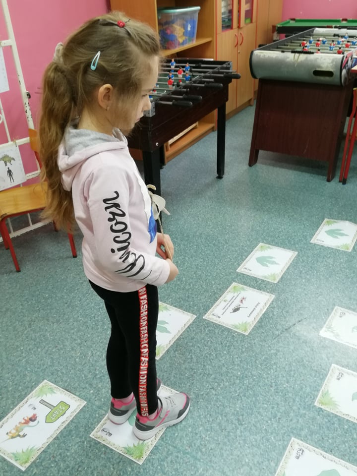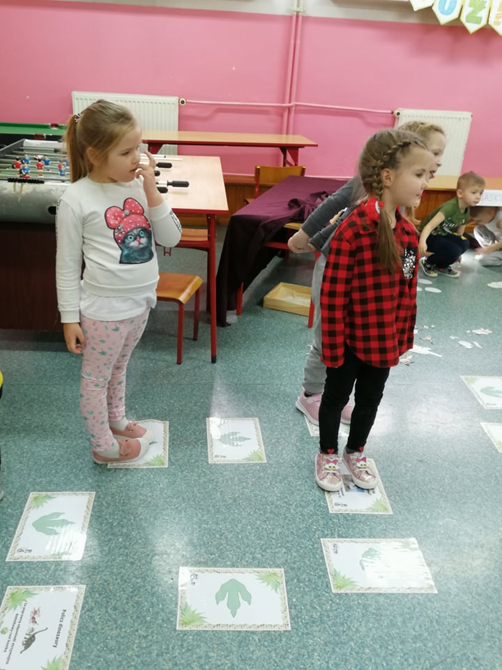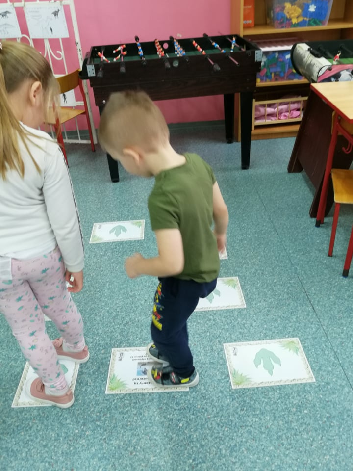 Dnia 4 marca przedszkolaki przeniosły się do czasów, w których żyły dinozaury. Był to dzień pełen wrażeń, wyzwań i niespodzianek. Na początku, dzieci podążały śladami dinozaurów, które zaprowadziły je do kolejnych zadań. Dzieciaki z uwagą oglądały prezentację i chłonęły informacje o życiu i rodzajach prehistorycznych gadów. Przedszkolaki miały możliwość pobawić się w paleontologa i wyszukać szczątki dinozaurów oraz jaja ich młodych, w których ukryły się młode dinozaury. Poćwiczyliśmy również motorykę małą, kolorując wspólnie linijkę z tymi niezwykłymi okazami oraz zmierzyć swój wzrost. Ponadto, pograliśmy w podłogową grę planszową i grę ruchową, gdzie trzeba było naśladować ruchy dinozaurów. Po wspólnych zabawach dzieci dostały książeczki zręcznościowe, a w nich wiele cennych i ciekawych zadań do wykonania.