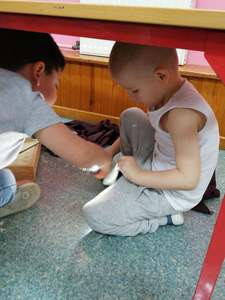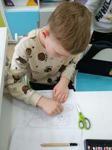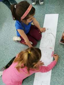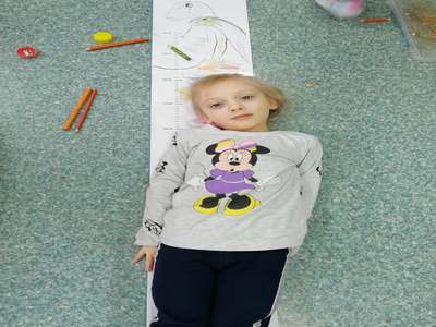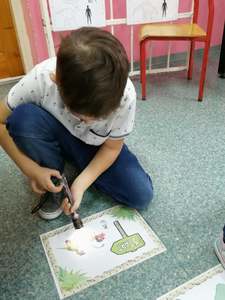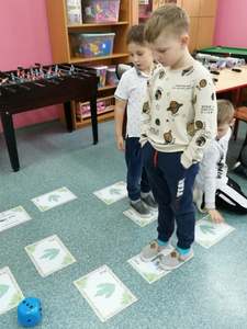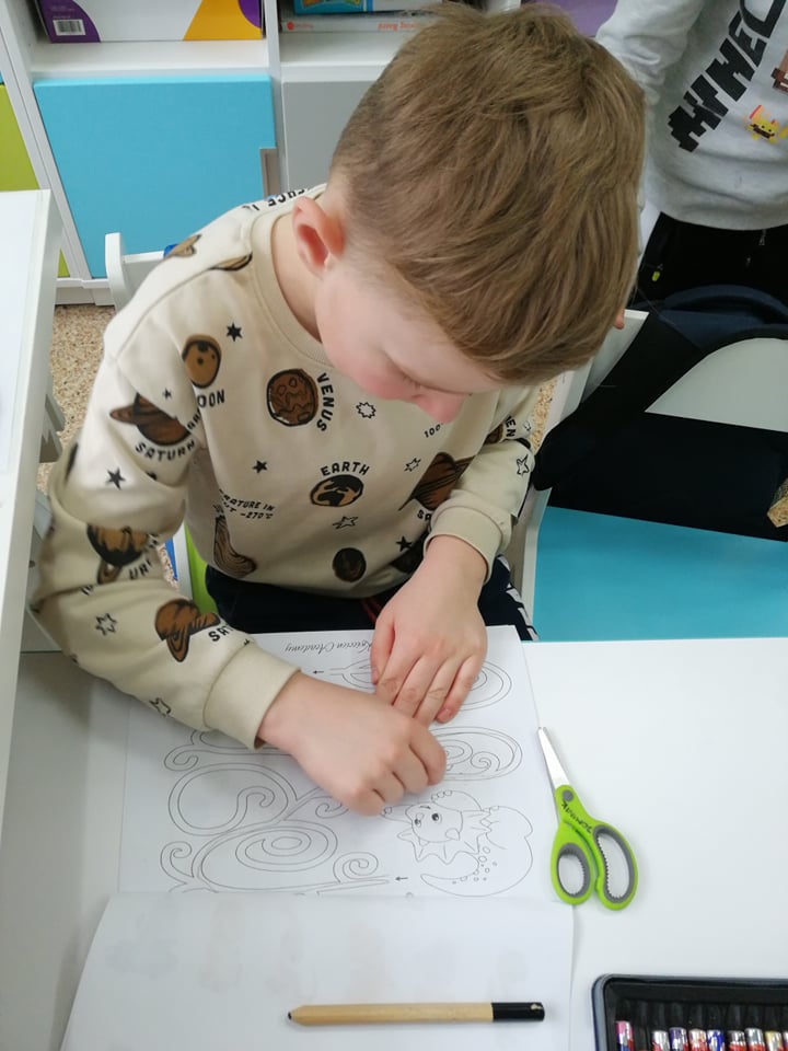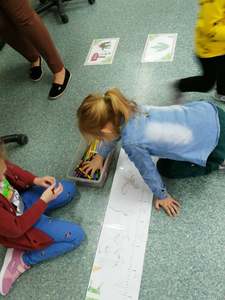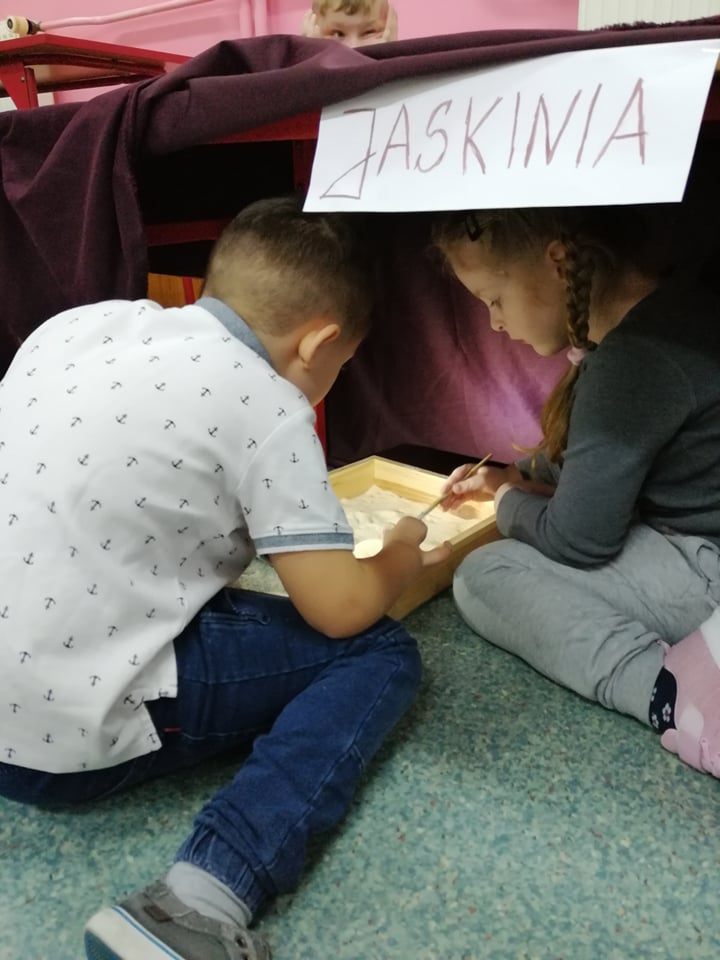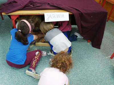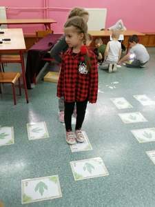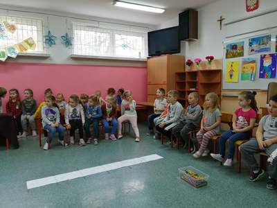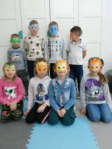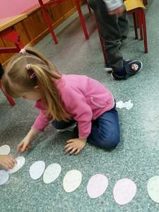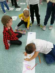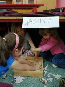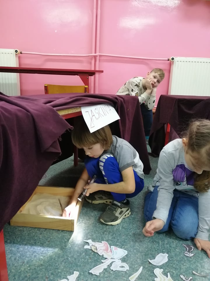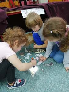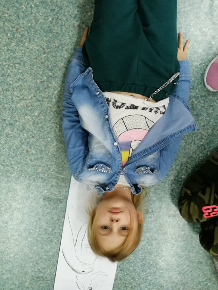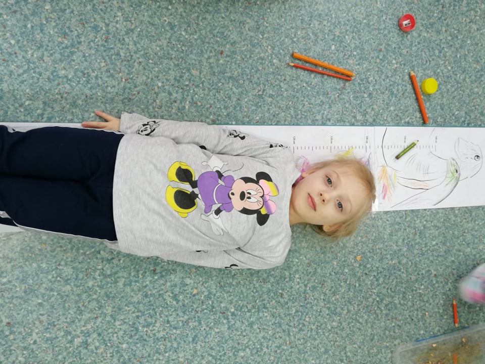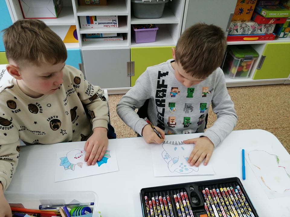 Dnia 4 marca przedszkolaki przeniosły się do czasów, w których żyły dinozaury. Był to dzień pełen wrażeń, wyzwań i niespodzianek. Na początku, dzieci podążały śladami dinozaurów, które zaprowadziły je do kolejnych zadań. Dzieciaki z uwagą oglądały prezentację i chłonęły informacje o życiu i rodzajach prehistorycznych gadów. Przedszkolaki miały możliwość pobawić się w paleontologa i wyszukać szczątki dinozaurów oraz jaja ich młodych, w których ukryły się młode dinozaury. Poćwiczyliśmy również motorykę małą, kolorując wspólnie linijkę z tymi niezwykłymi okazami oraz zmierzyć swój wzrost. Ponadto, pograliśmy w podłogową grę planszową i grę ruchową, gdzie trzeba było naśladować ruchy dinozaurów. Po wspólnych zabawach dzieci dostały książeczki zręcznościowe, a w nich wiele cennych i ciekawych zadań do wykonania.