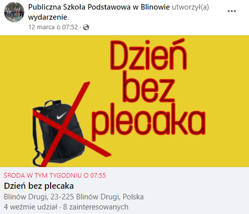 "Dzień bez plecaka" - 16 marca 2022 - Tego dnia należy zamienić tradycyjną torbę lub plecak na inne nosidła – kosze, walizki, wózki itp. Oczywiście przyjście do szkoły bez plecaka nie zwalnia z zabrania wszystkich potrzebnych tego dnia rzeczy. Osoby, które włączą się w akcję tego dnia nie będą pytane. Wszystkie zaplanowane wcześniej prace pisemne zaliczamy normalnie. Zapraszamy i życzymy świetnej zabawy.Najciekawsze pomysły zostaną nagrodzone :-)
