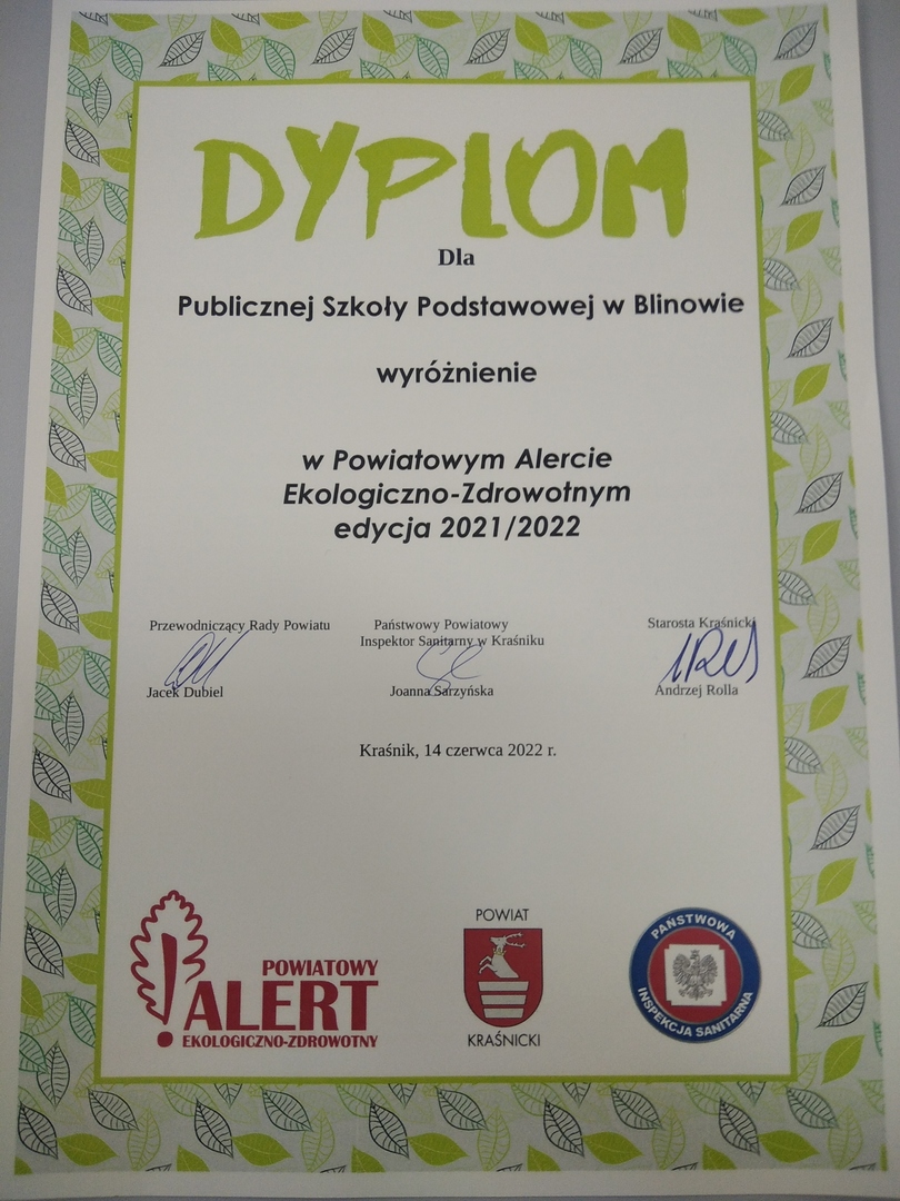 W Alercie nasza szkoła otrzymała wyróżnienie. Nagrody wręczali Starosta Powiatu Andrzej Rolla, Przewodniczący Rady Powiatu Jacek Dubiel oraz Kierownik Oddziału Sanitarnego PSSE w Kraśniku Agnieszka Kaczmarska.