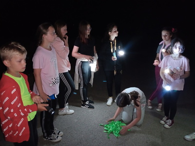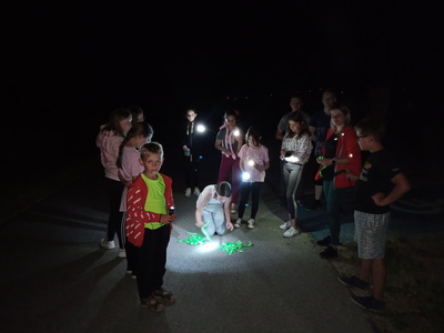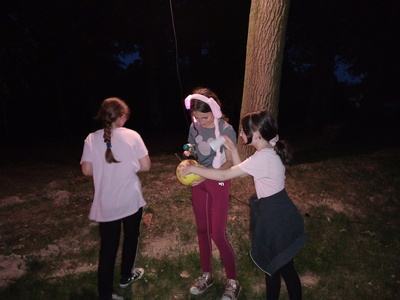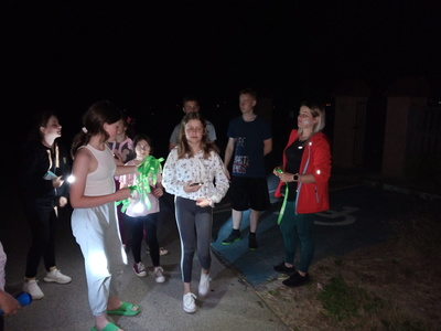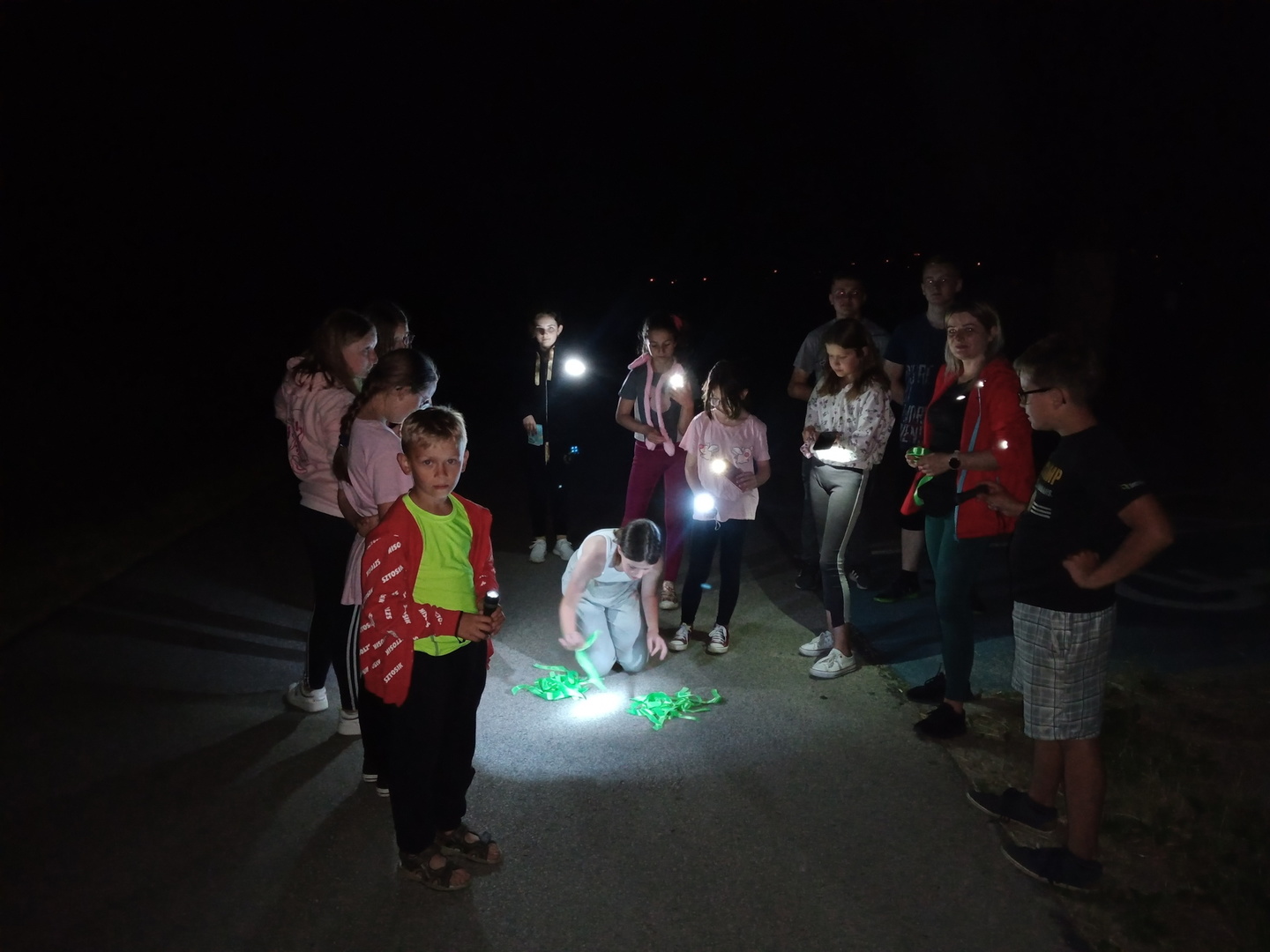 . Gdy już oswoiliśmy się z ciemnością wyruszyliśmy na grę terenową "podchody" po Blinowie. Tu podzieleni na dwie drużyny rozwiązywaliśmy zagadki, poszukiwaliśmy zostawionych śladów i wykonywaliśmy wyznaczone zadania. Obie drużyny odnalazły tyle samo śladów i tym samym zremisowały. Szczęśliwi i pełni wrażeń udaliśmy się na odpoczynek.