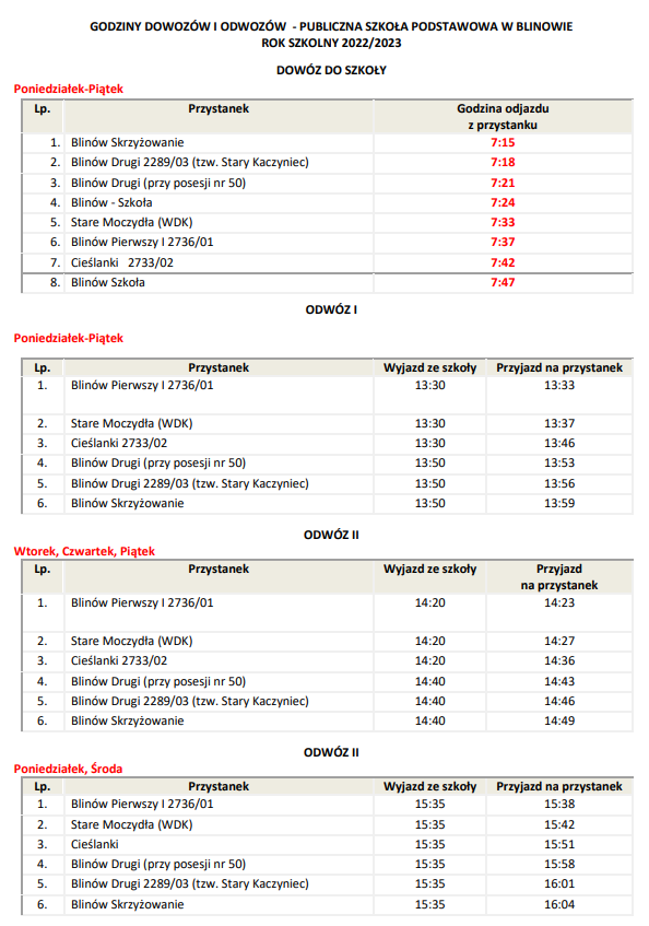 Harmonogram dowozów i odwozów jest dostępny również w zakładce Harmonogram dowozu w lewym menu.