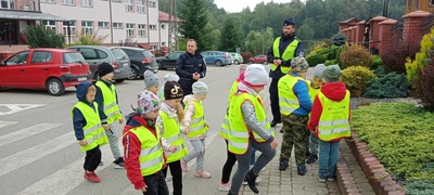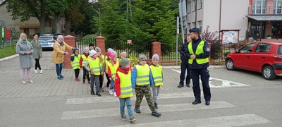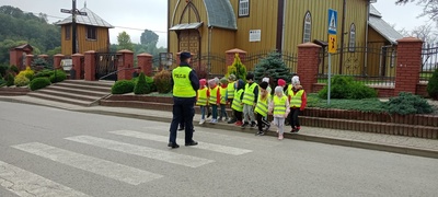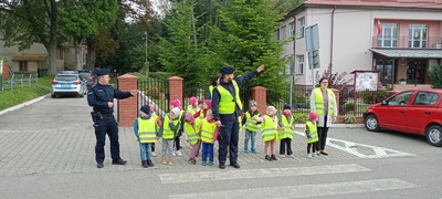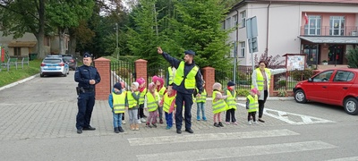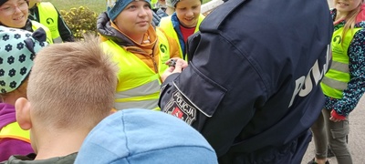 Po przeprowadzeniu części teoretycznej udało się przeprowadzić praktyczne zajęcia „w terenie” na zewnątrz budynku szkoły. Zajęcia praktyczne polegały na nauce prawidłowego przechodzenia przez przejście dla pieszych, a następnie samodzielne przechodzenie przez pasy. Niespodzianką i najprzyjemniejszą częścią dla najmłodszych było oglądanie radiowozu oraz przyniesionych przez naszych gości podstawowych akcesoriów policjanta. Dzieci mogły przymierzyć czapkę oraz dokładnie obejrzeć kajdanki a nawet zrobić selfie z policjantem.