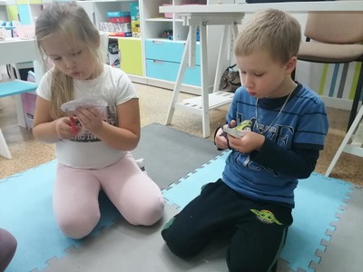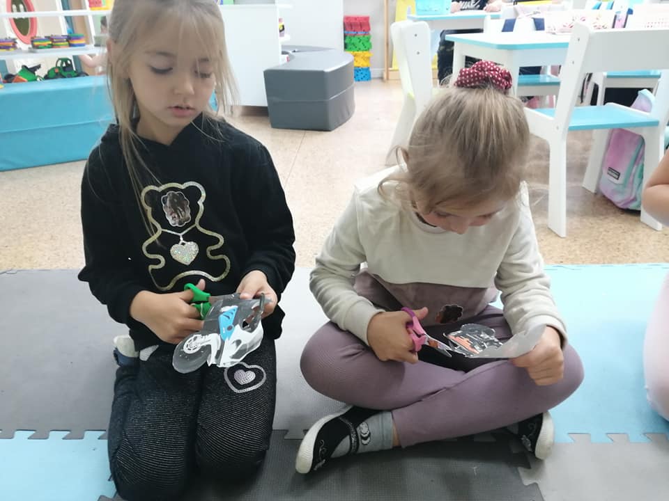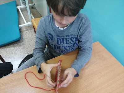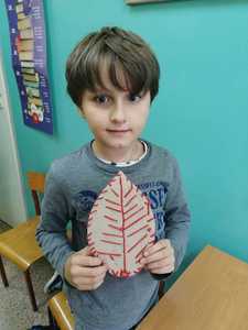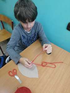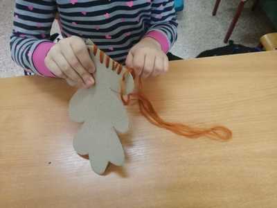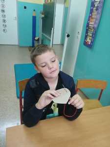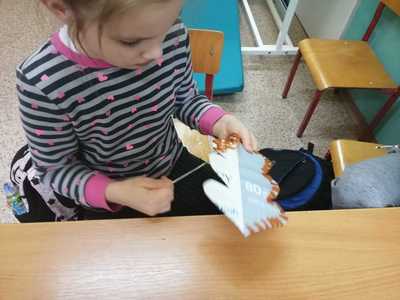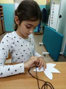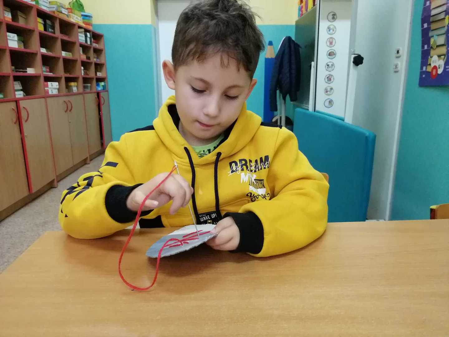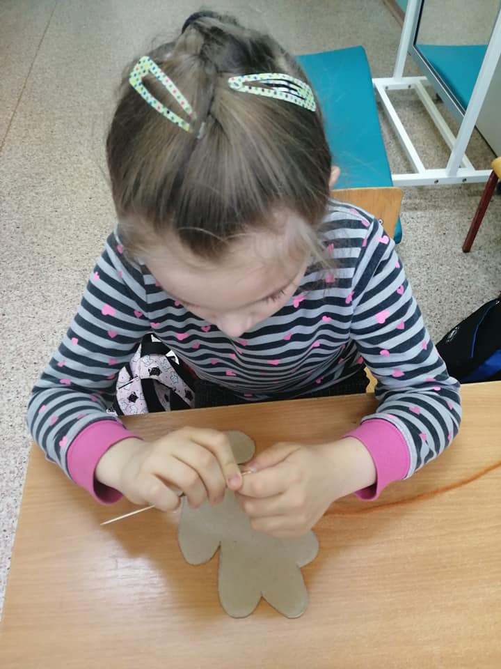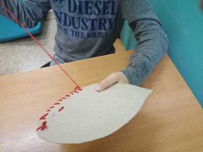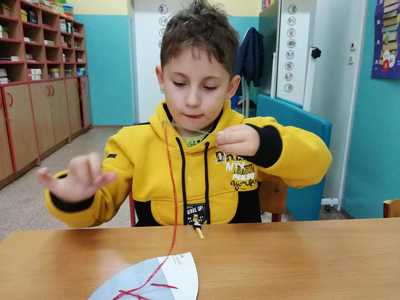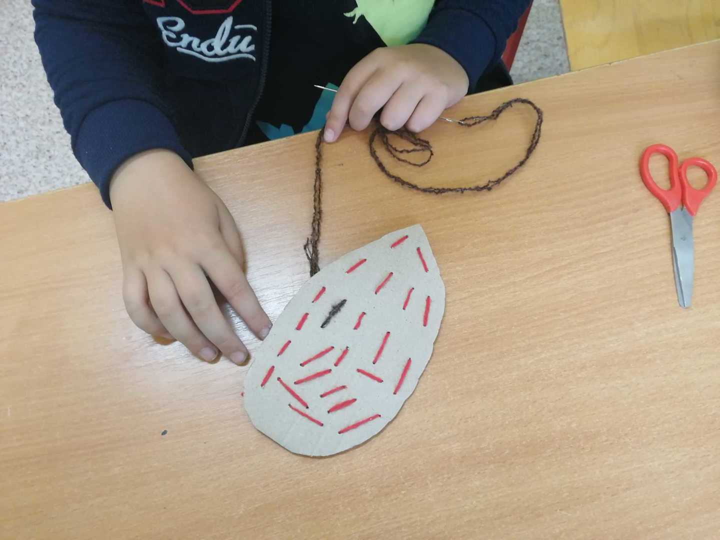 2. Tekturowe liście szyjemy i igłą ostrożnie się posługujemy – nauka szycia z wykorzystaniem tekturowych szablonów liści.