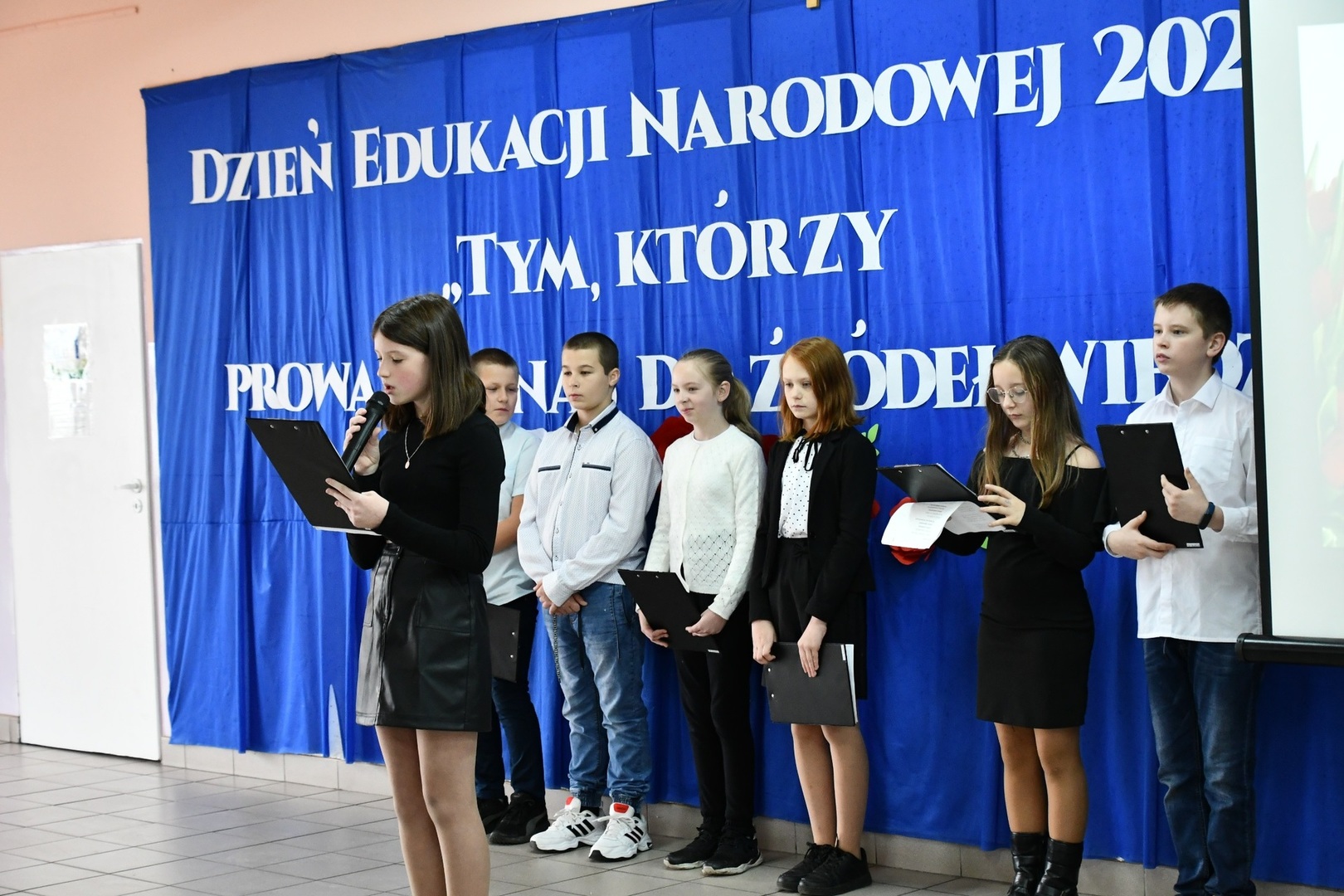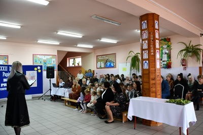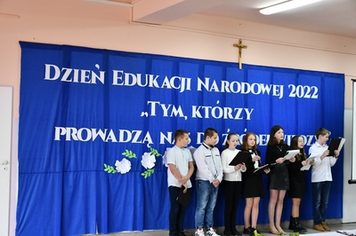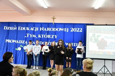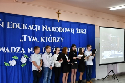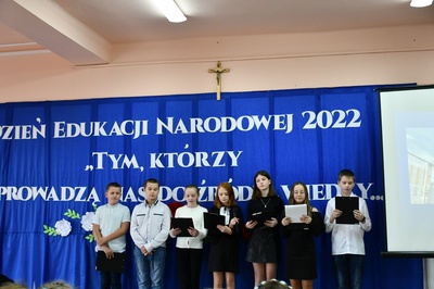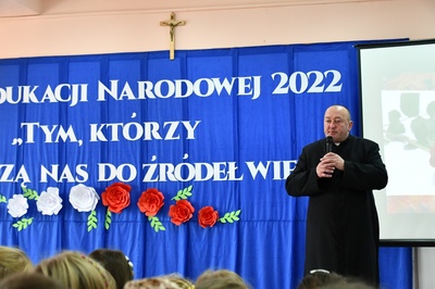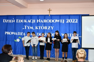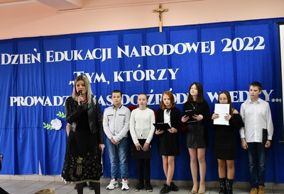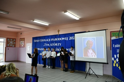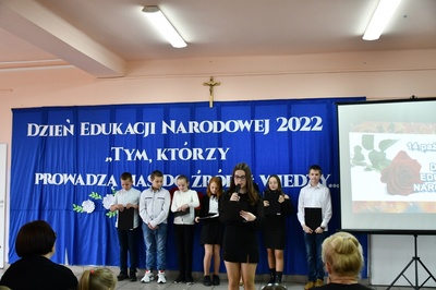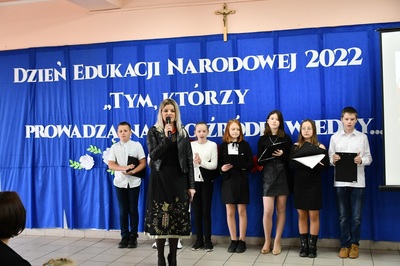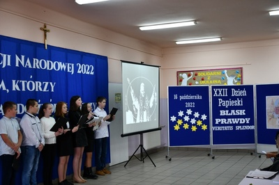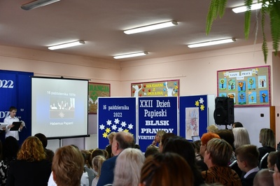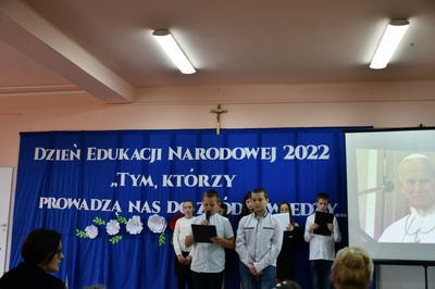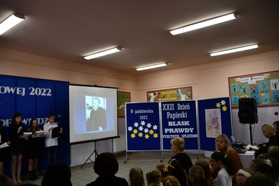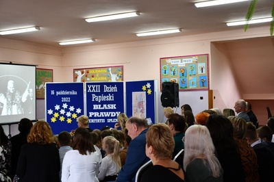 Na początku Mszę Świętą odprawił ks. Piotr Wąsek. Następnie w szkole odbył się montaż słowno-muzyczny przygotowany przez uczniów klas IV, V, VI. Wykonawcy w imieniu wszystkich uczniów podziękowali dyrekcji, nauczycielom i pracownikom obsługi za codzienny trud, zaangażowanie w procesie edukacyjno-wychowawczym i złożyli serdeczne życzenia. Uroczystość ta została połączona z obchodami Dnia Papieskiego, któremu towarzyszy hasło “Blask Prawdy”, które nawiązuje do encykliki św. Jana Pawła II “Veritatis splendor”. Święty Jan Paweł II podczas Mszy Świętej w Łowiczu w 1999r. skierował te słowa do nauczycieli i wychowawców: