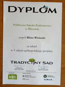 Udział w "Tradycyjnym Sadzie" był dla nas wspaniałą przygodą oraz okazją do zdobycia wiedzy i wykorzystania jej w praktyce. Efekty pracy zespołu, w postaci sadu z tradycyjnymi odmianami wiśni, wzbogacą teraz otoczenie szkoły, a w przyszłości staną się źródłem wspaniałych owoców. Jeszcze raz dziękujemy wszystkim za pomoc włożoną w realizację konkursowych zadań.