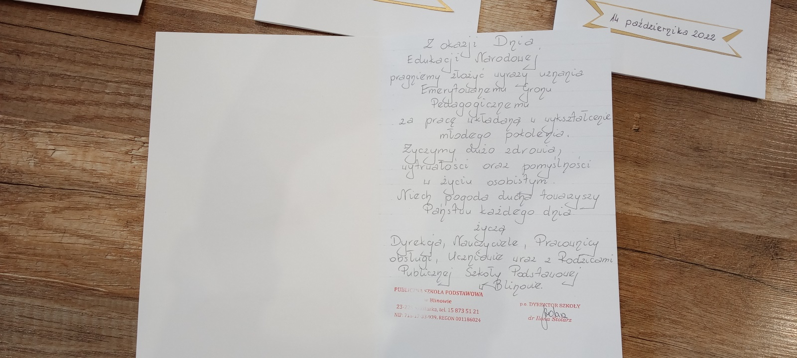 Pragniemy złożyć wyrazy uznania Emerytowanemu Gronu Pedagogicznemu za pracę wkładaną w wykształcenie młodego pokolenia. Życzymy dużo zdrowia, wytrzymałości oraz pomyślności w życiu osobistym. Niech pogoda ducha towarzyszy Państwu każdego dnia życzy: Dyrekcja, Nauczyciele, Pracownicy obsługi, Uczniowie wraz z Rodzicami.