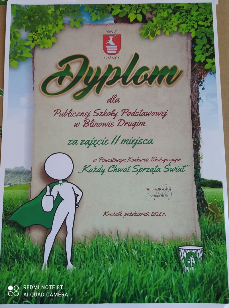 27 października odbyło się rozstrzygnięcie Powiatowego Konkursu Ekologicznego, w którym uczniowie klas I-III corocznie bardzo chętnie biorą udział. W tym roku konkursowi ,,Każdy chwat sprząta świat” przyświecało hasło: ,,Wszystkie śmieci są nasze”. Bardzo miło nam poinformować, że zajęliśmy II miejsce.